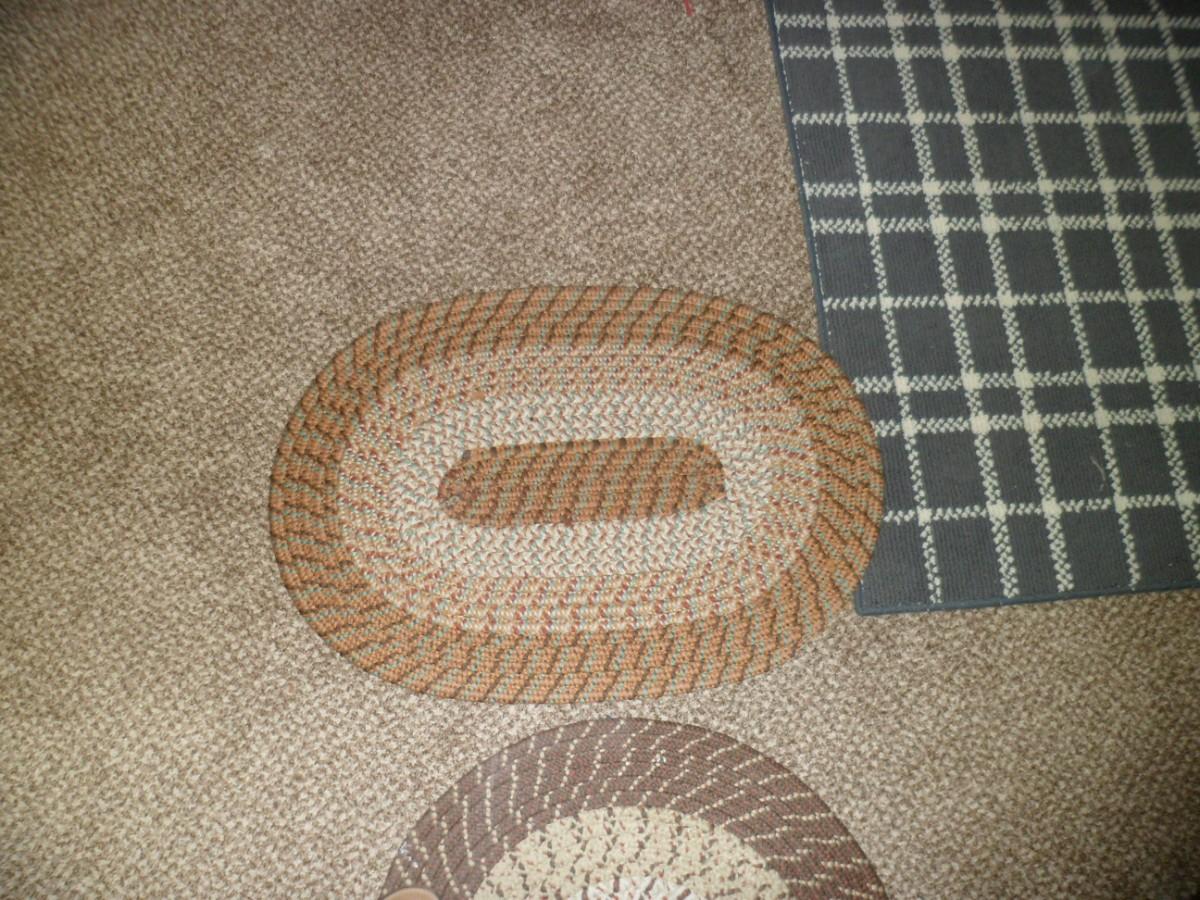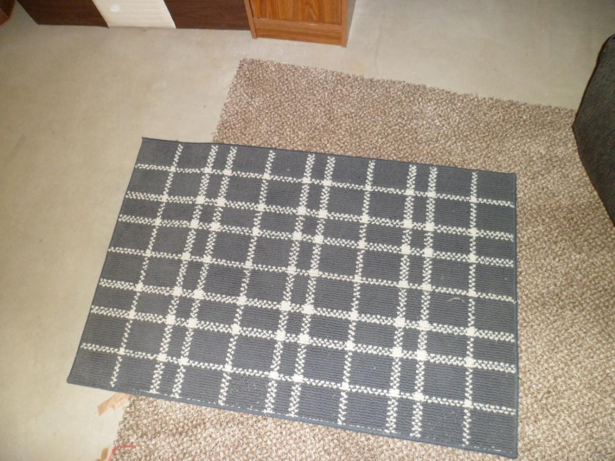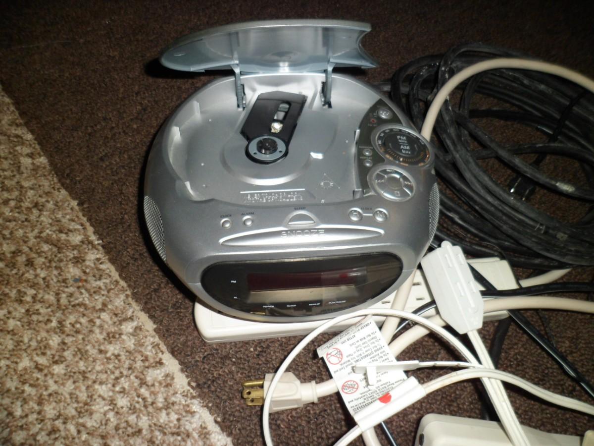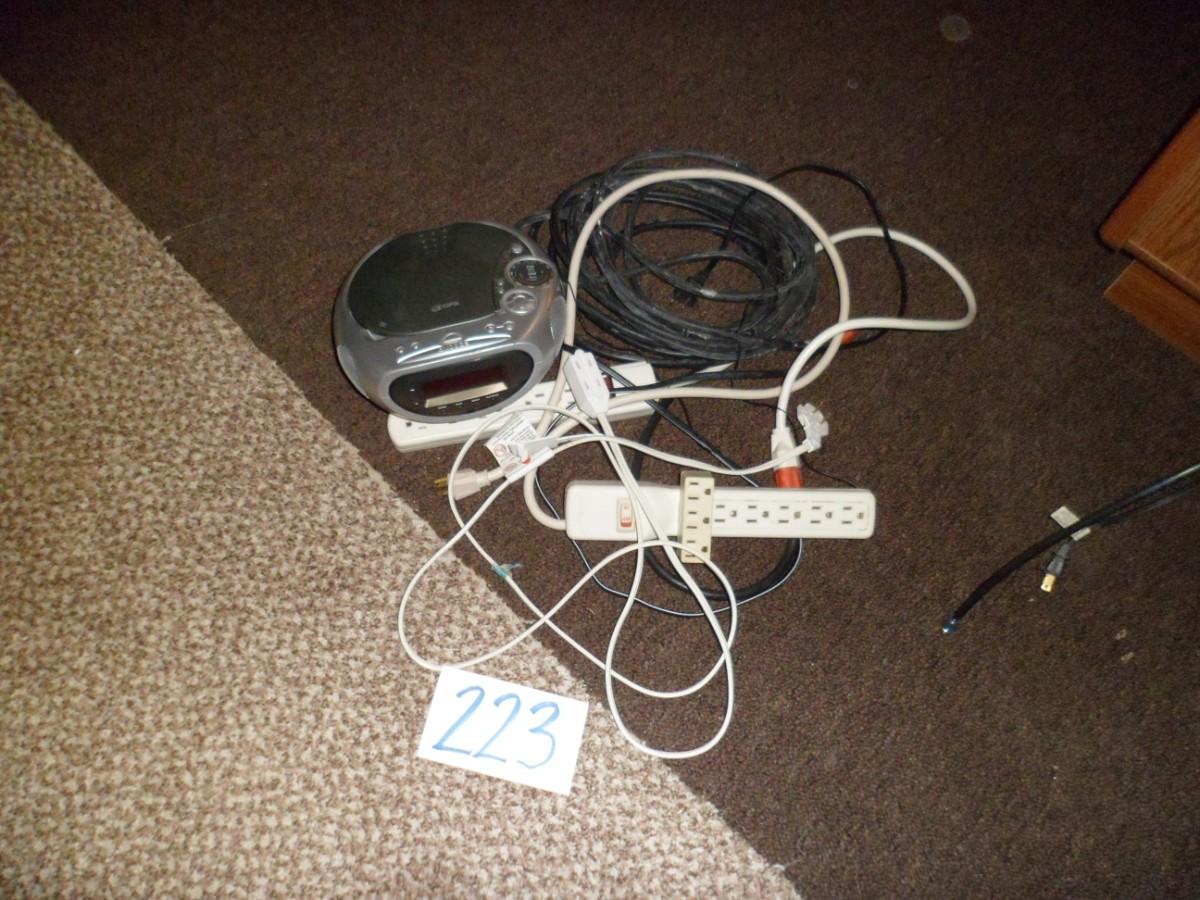 LOT 223 AM/FM CD PLAYER ALARM CLOCK, 3 RUGS, EXTENSION CORDS, POWER SURGE PROTECTORS