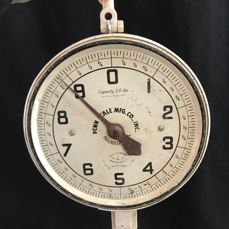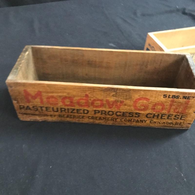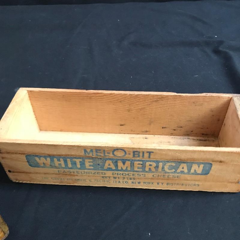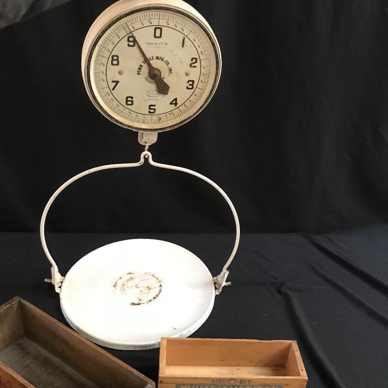 Lot includes sweet ild hanging scale by Penn Scale Mfg. Co., Inc. in Philadelphia (approx. 25” tall when hanging) and two wooden cheese boxes, one from Meadow Gold and the other from Melt-O-Bit white American cheese. Larger box is approx. 12” x 4” x 3.5”. See pics. Shipping available.