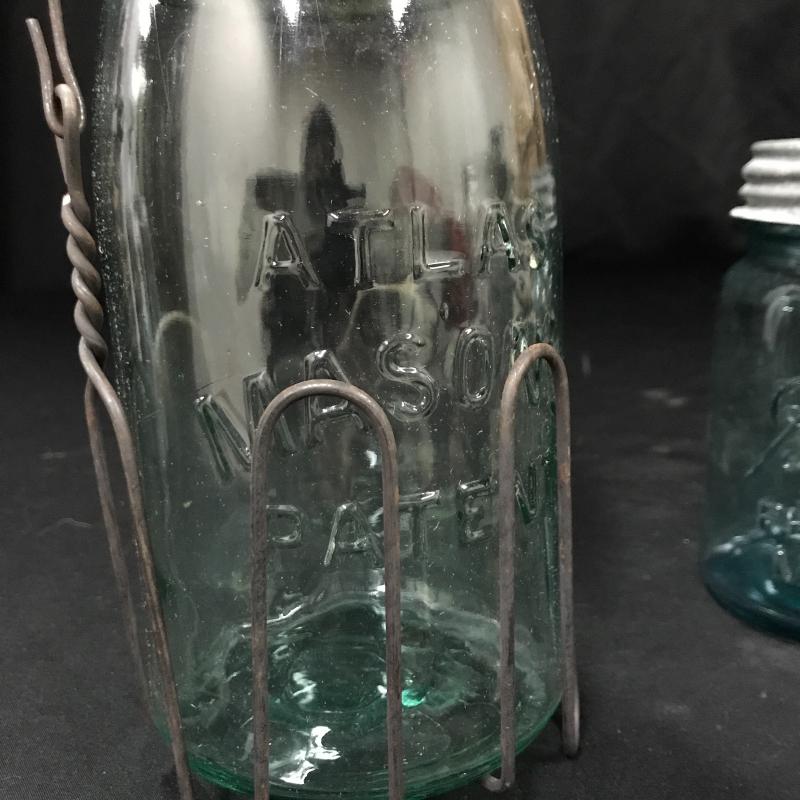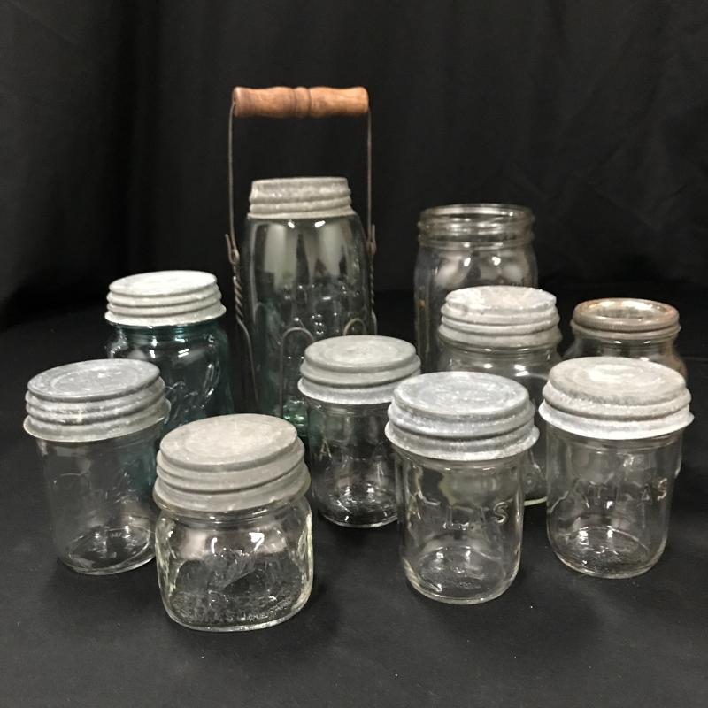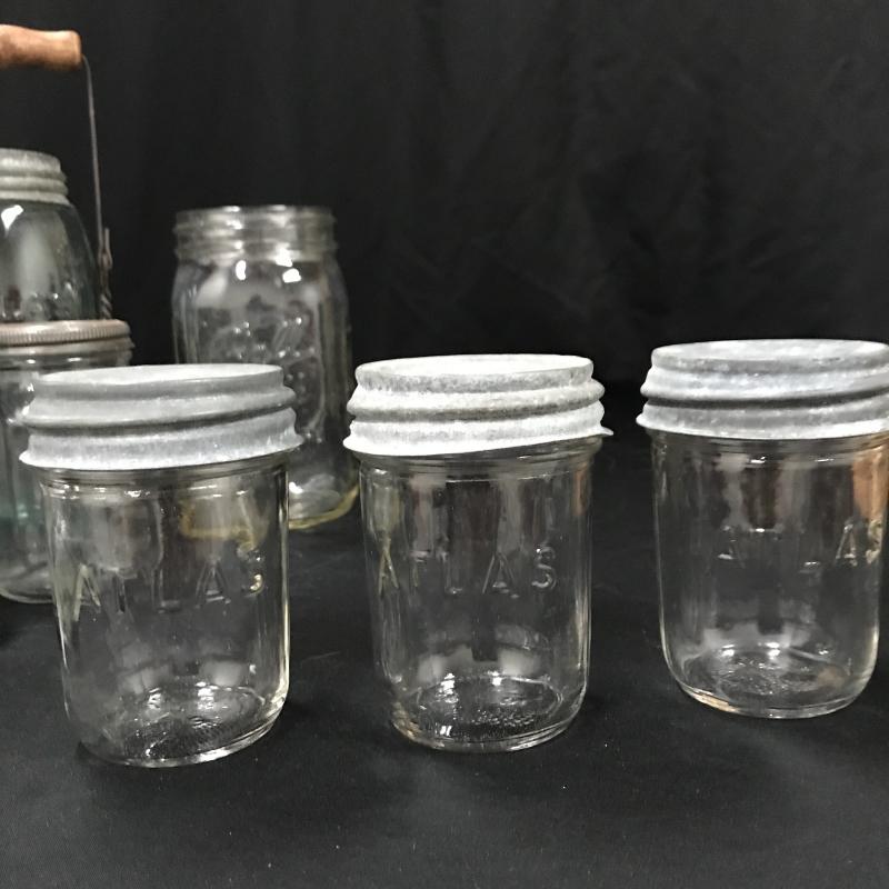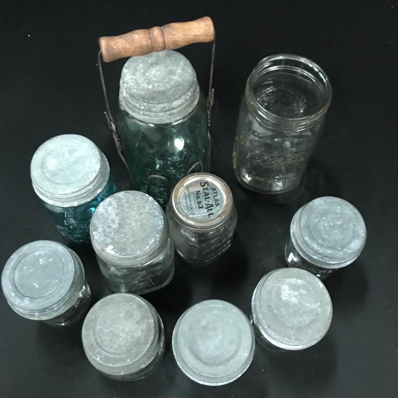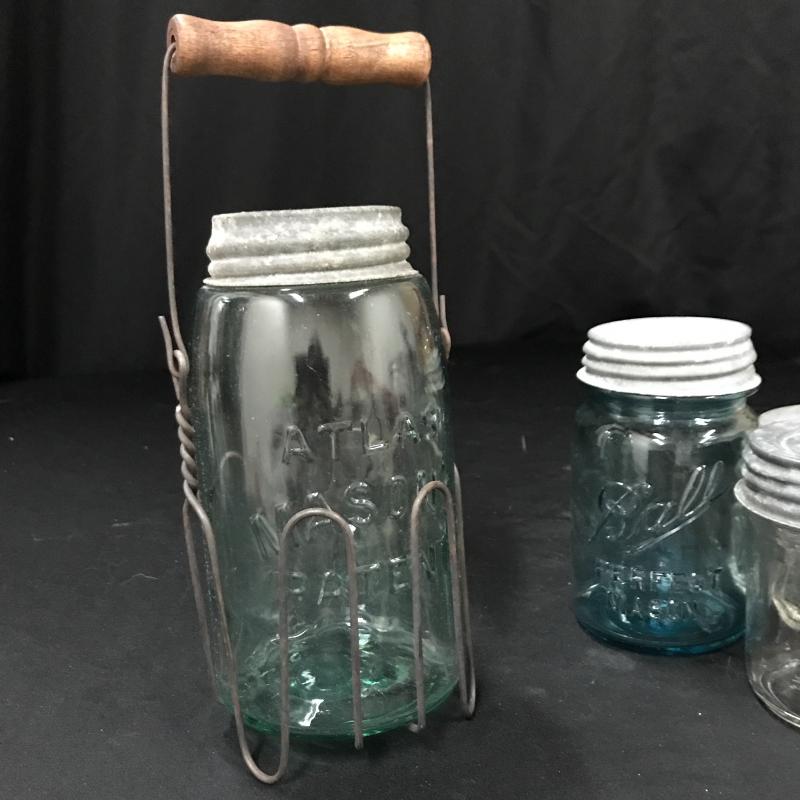 Collectible Ball and Atlas Mason Jars. Most with Lids. Includes wire and wood handled basket for carrying. Shipping or local pick up in Asheville.