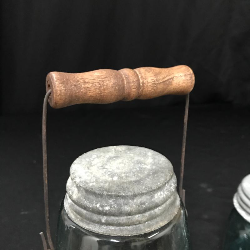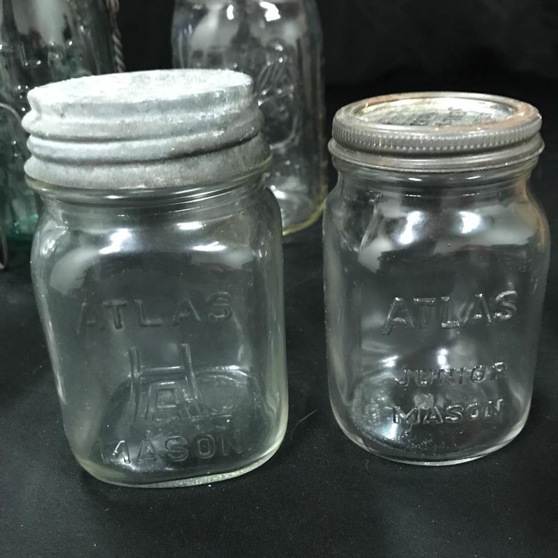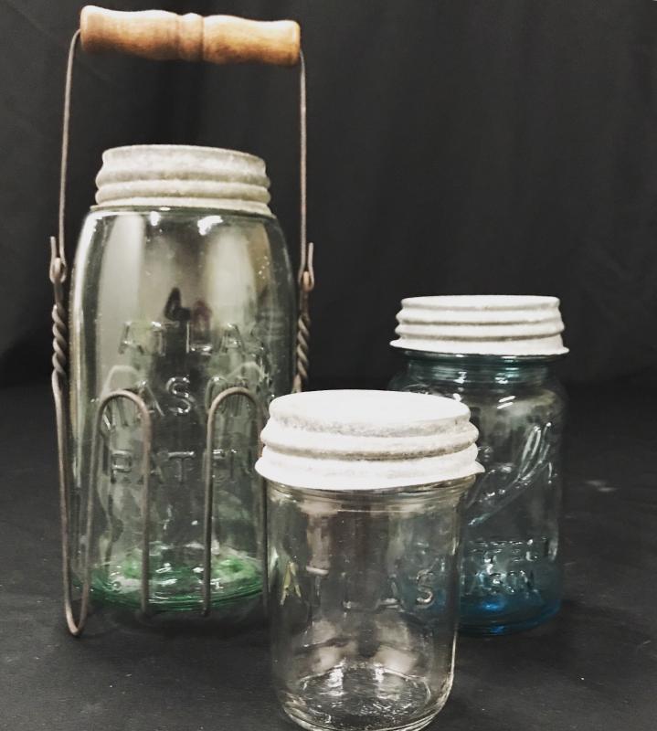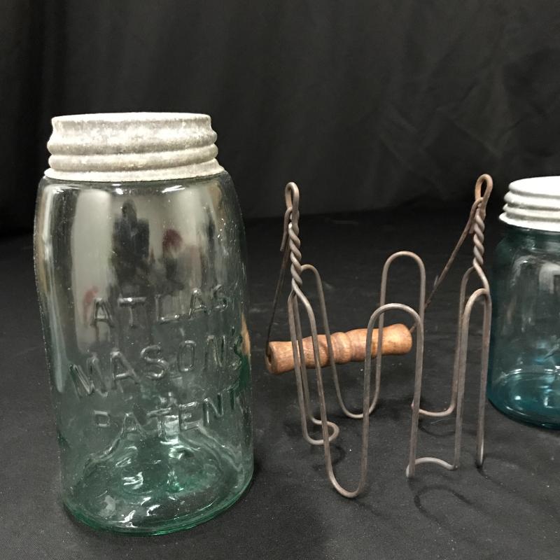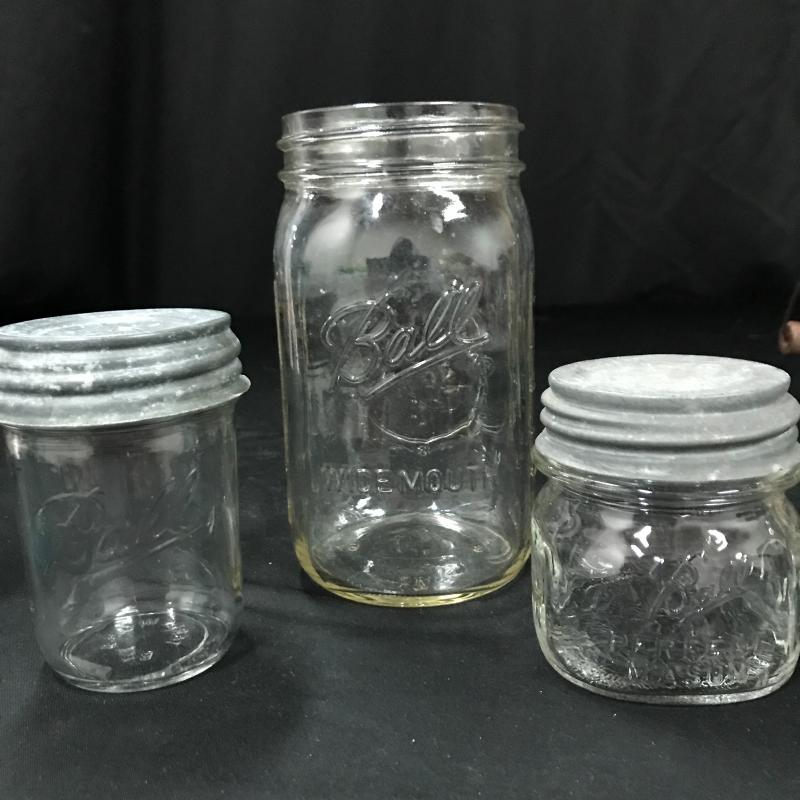 Collectible Ball and Atlas Mason Jars. Most with Lids. Includes wire and wood handled basket for carrying. Shipping or local pick up in Asheville.