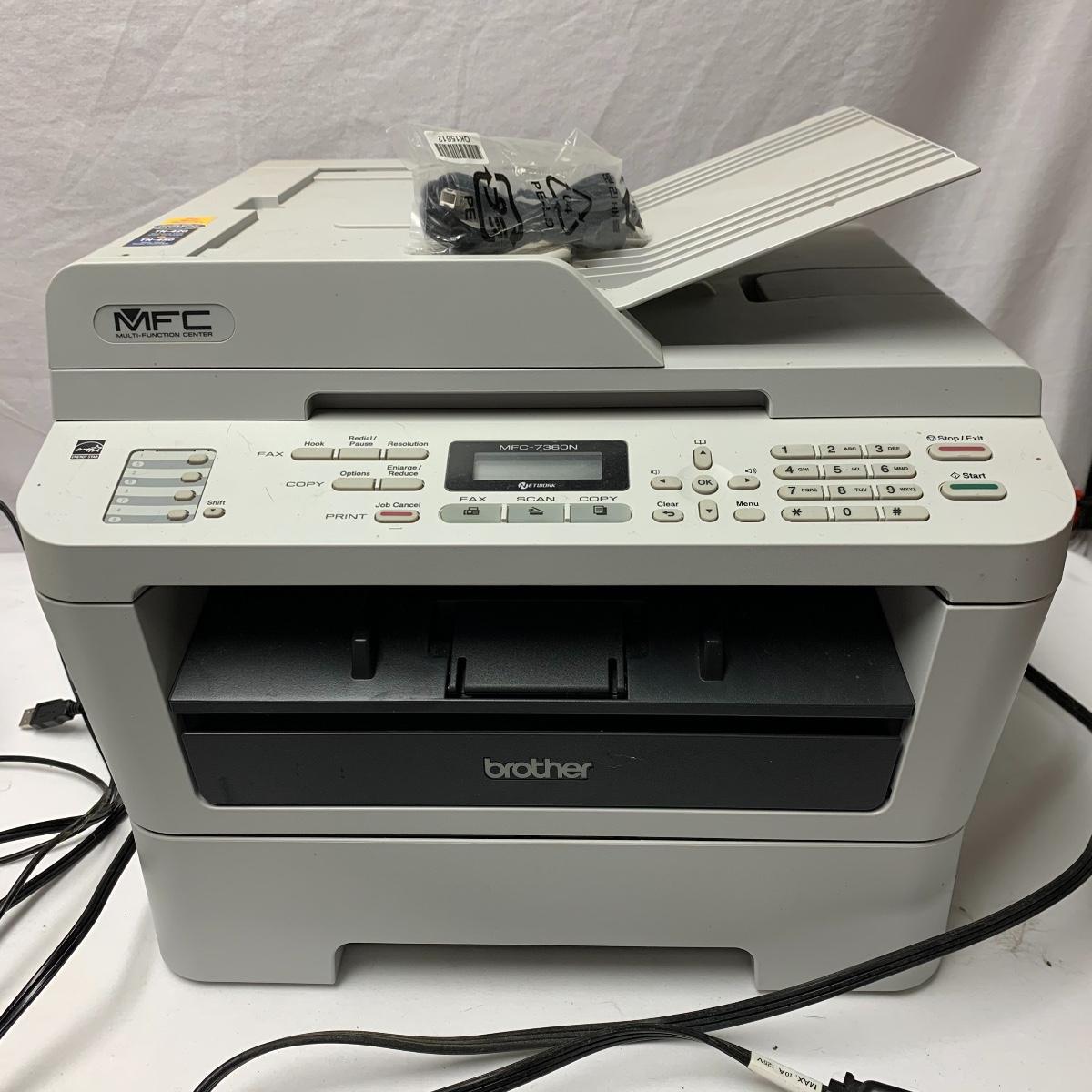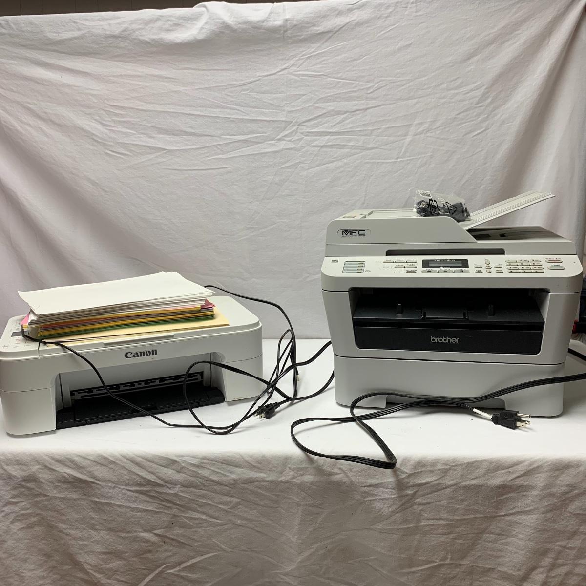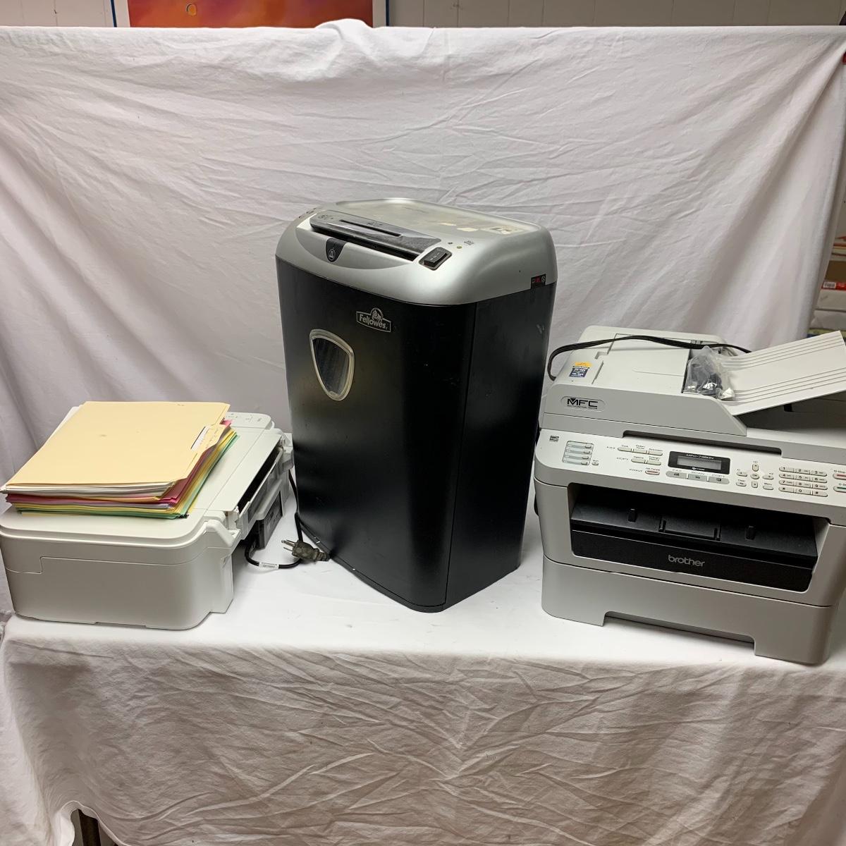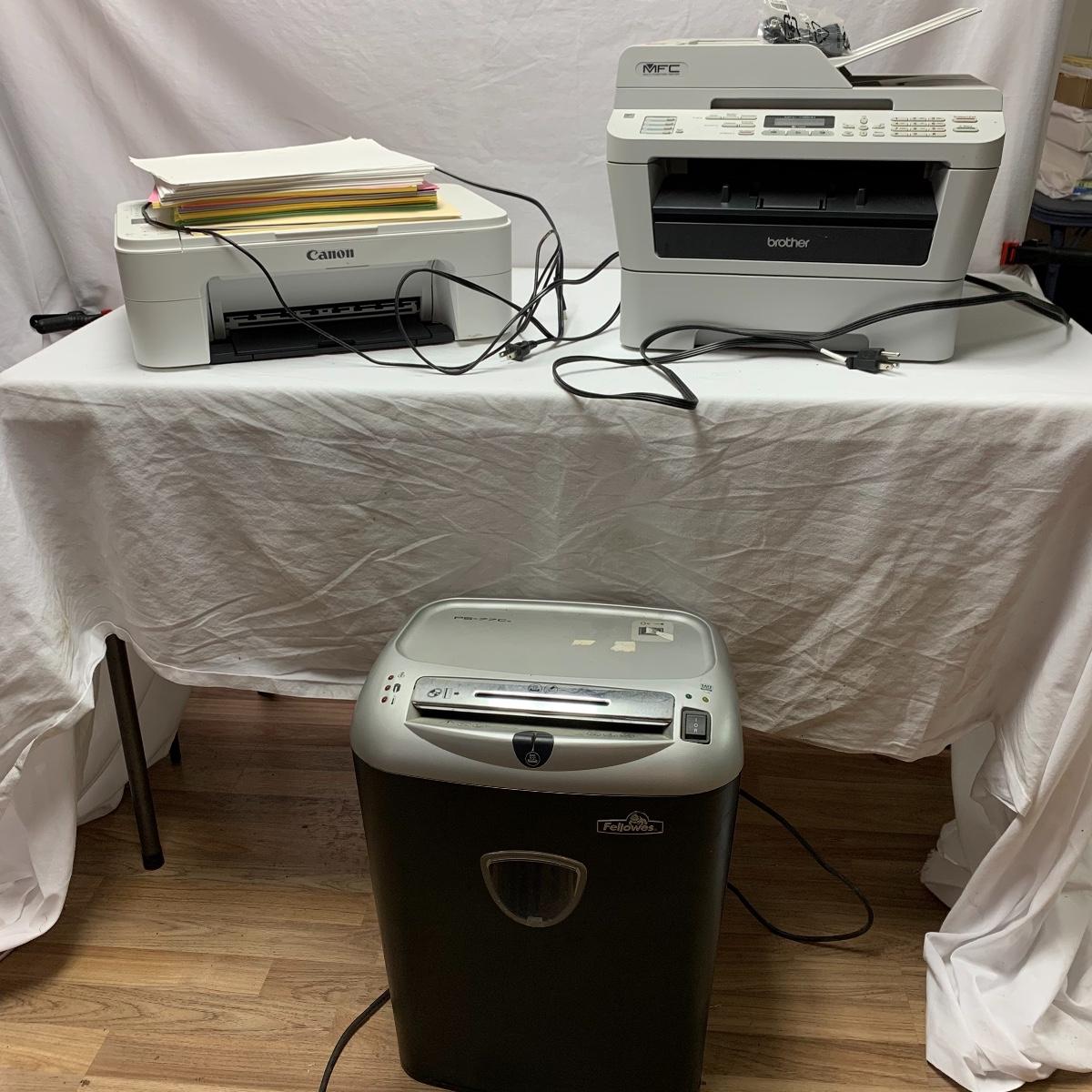 This lot includes a Brother Multi-Function Center, a Canon Pixma Printer, and a Fellowes Paper Shredder. The Brother Multi-Function Center is model MFC-7360N. It has fax, scan, copy, and print functions. The Canon Pixma printer is model TS3322. It is a wireless printer. It comes with an instruction manual, printer paper, and a little packet of Pixma photo paper. The paper shredder is a Fellowes PS-77Cs shredder with Safe Sense Technology. It shreds discs, credit cards, and has a 12-page shredding capacity. The shredder was tested and functions. The printers were plugged in and both power on. Local pickup only.