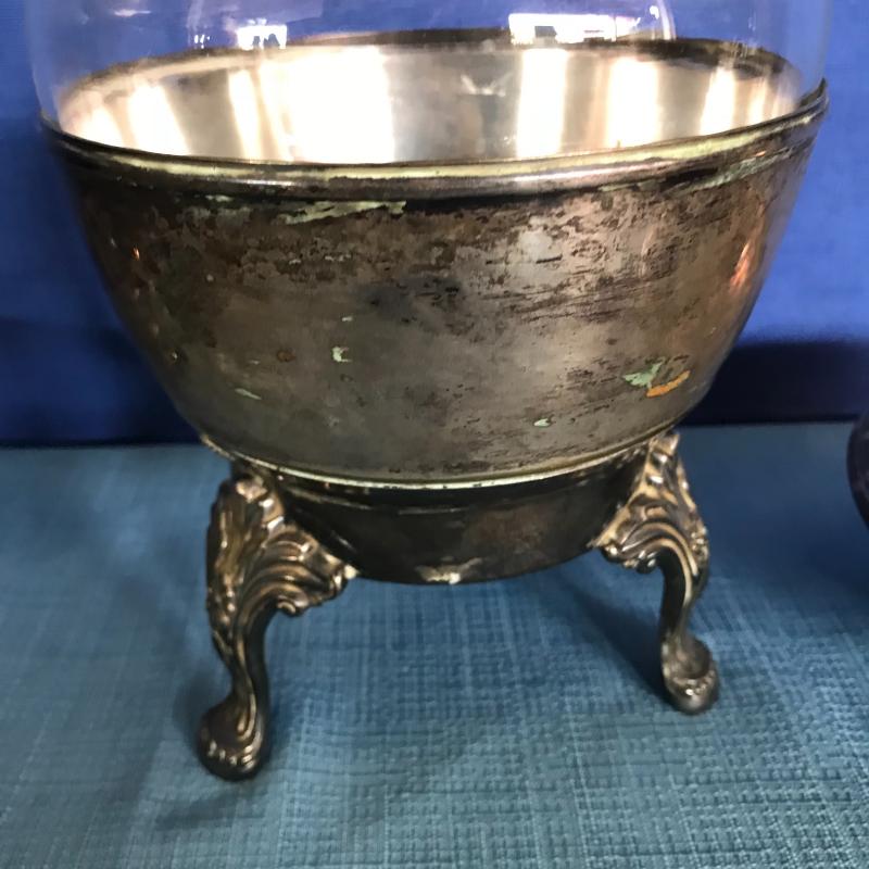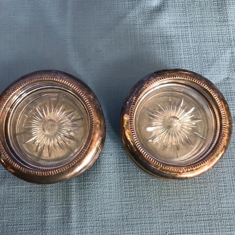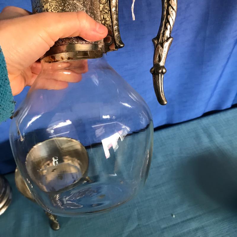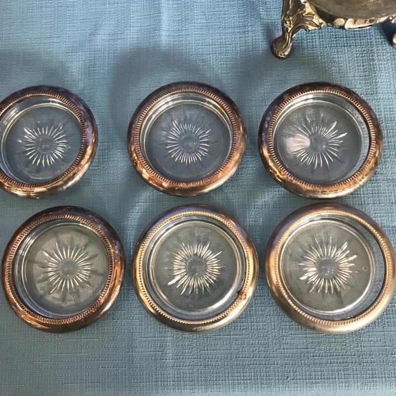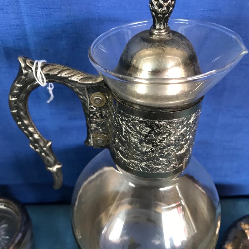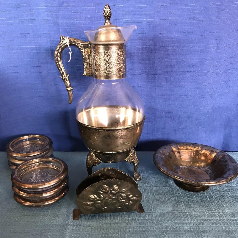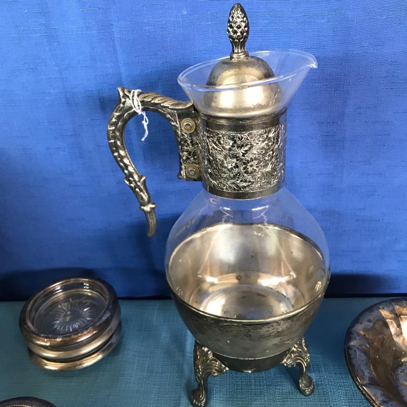Lot includes glass and silver plate coffee urn (approx. 13.5” tall), bowl, napkin holder, and set of six coasters. No shipping available. Local pickup only in Maggie Valley, NC.
