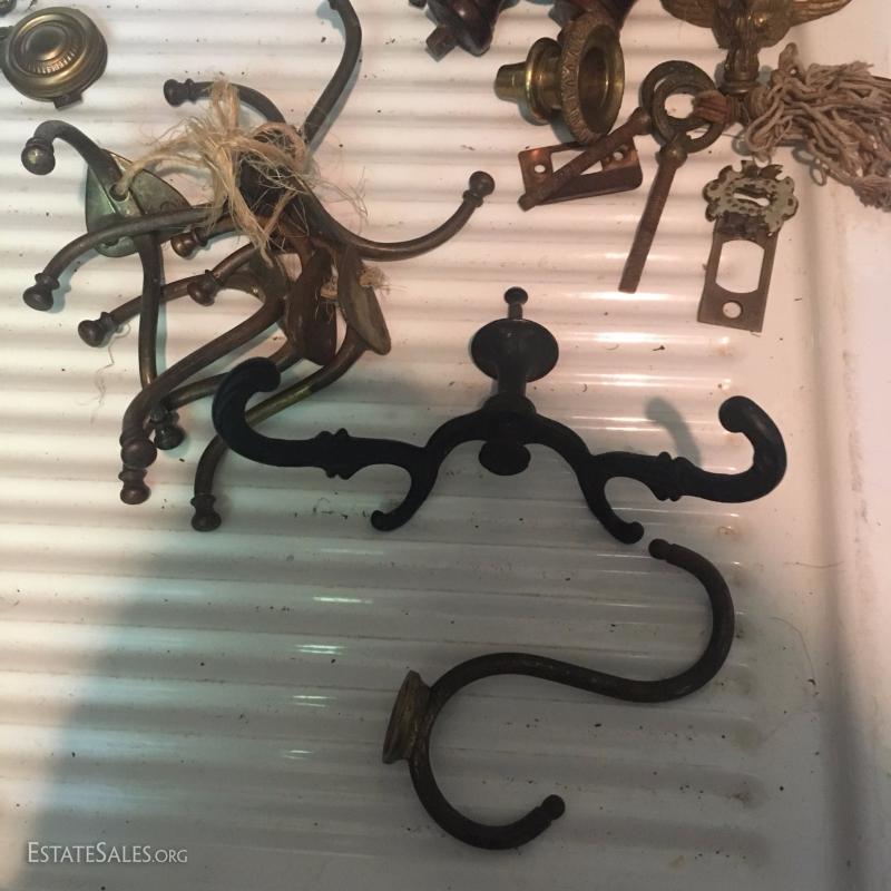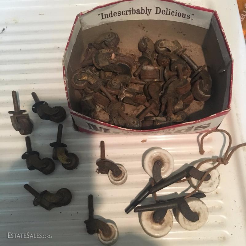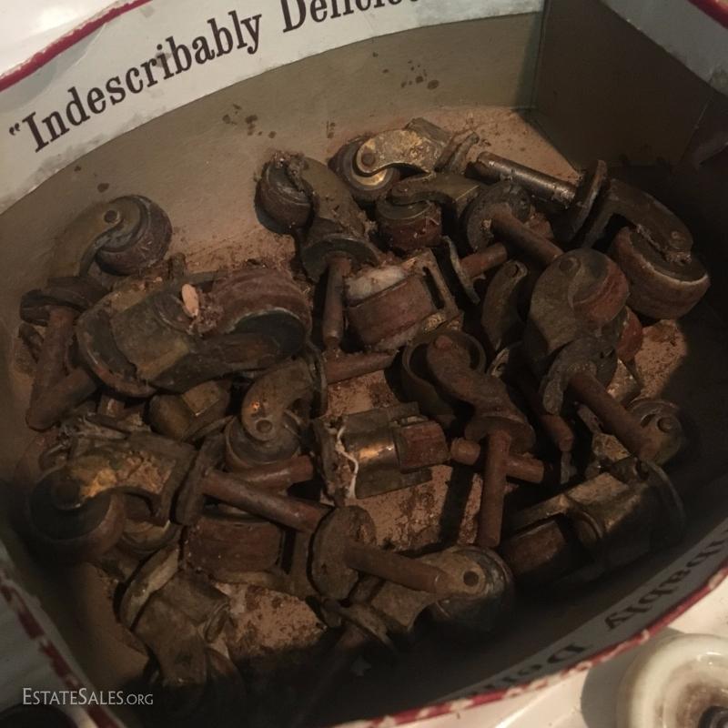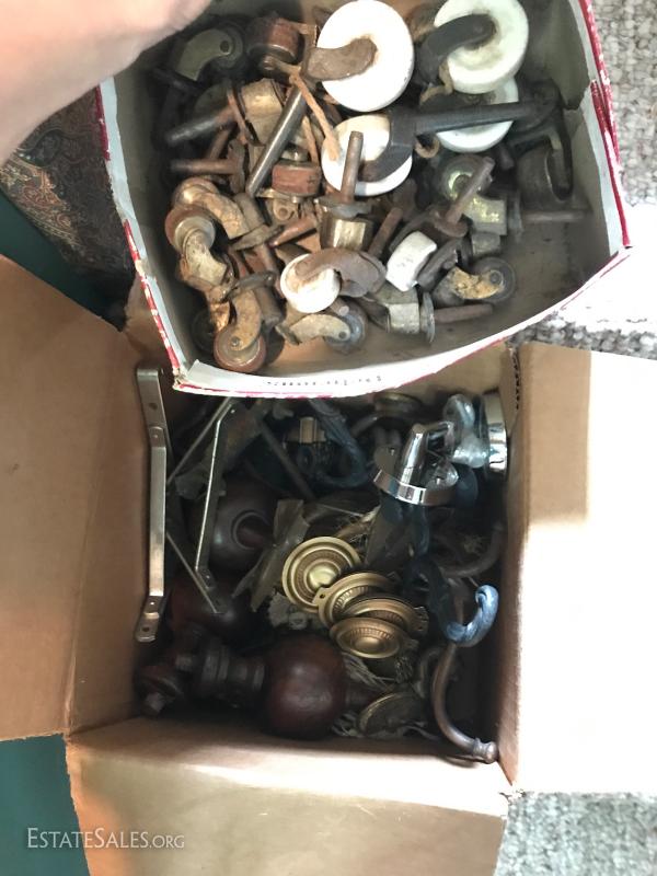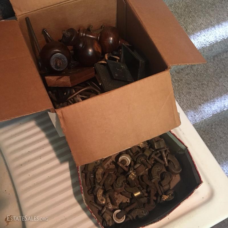 Box of casters. Box of misc hardware such as hooks, handles and knobs. Lots of brass and Mission style hooks.