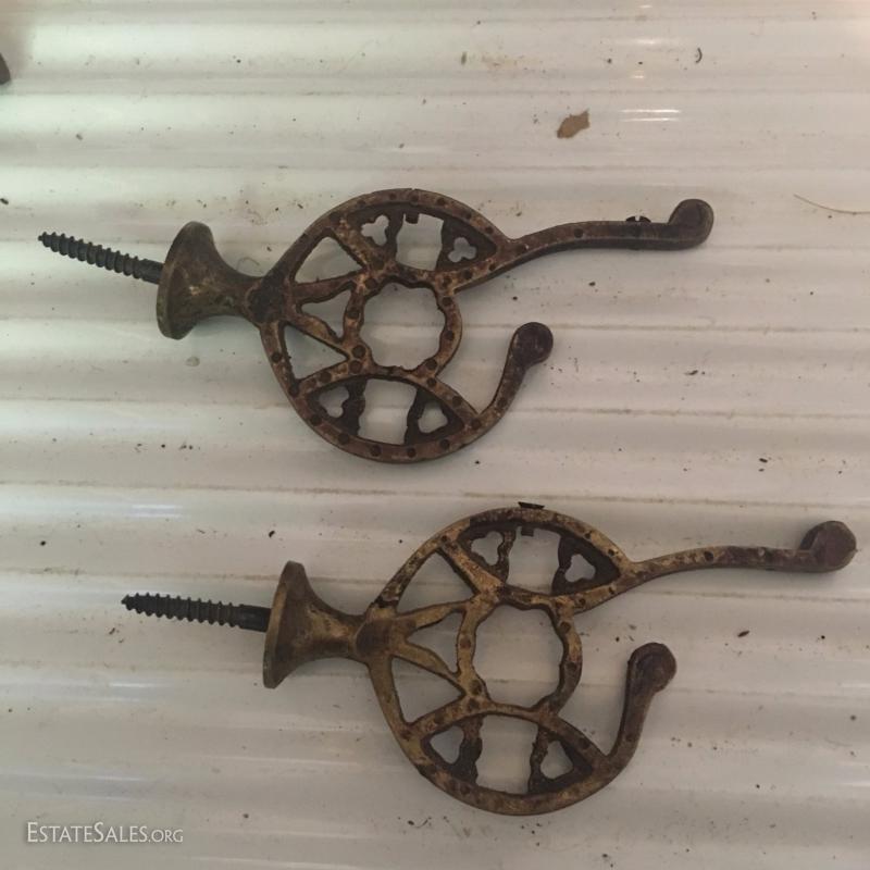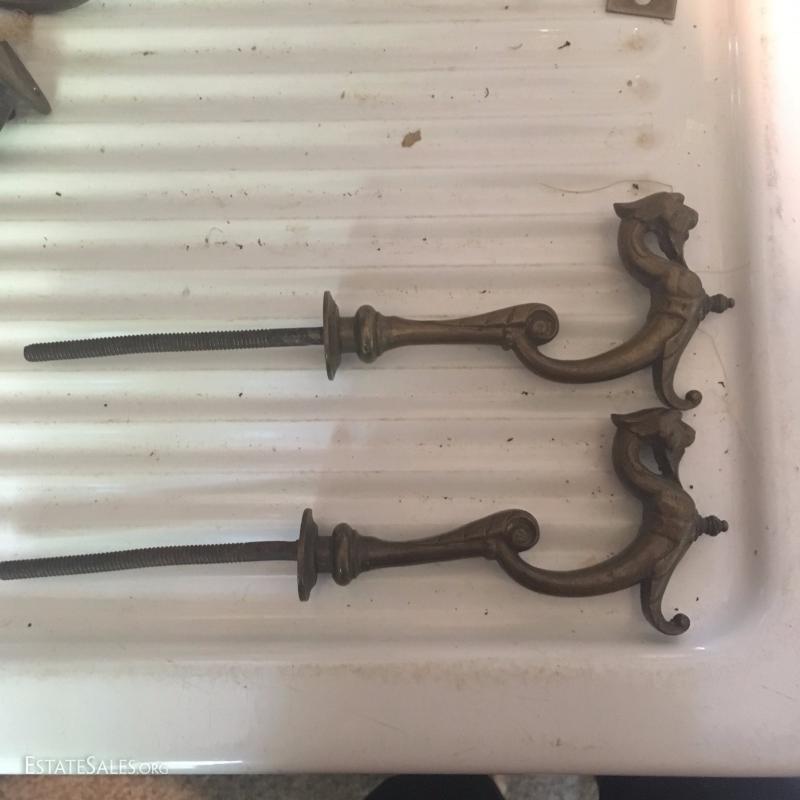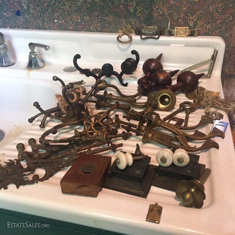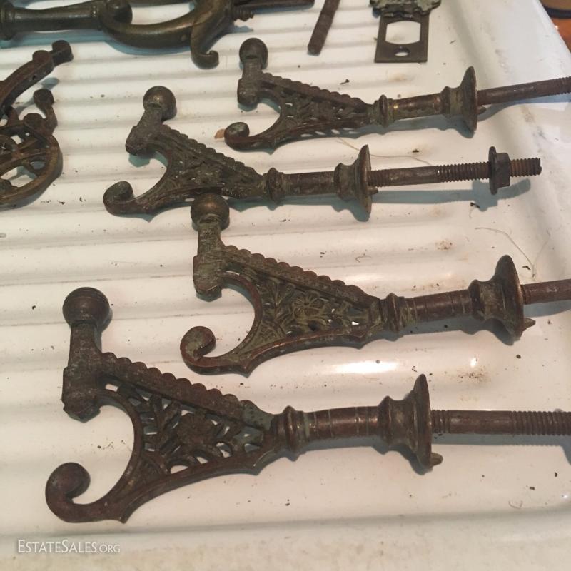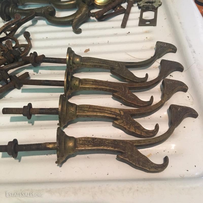 Box of casters. Box of misc hardware such as hooks, handles and knobs. Lots of brass and Mission style hooks.