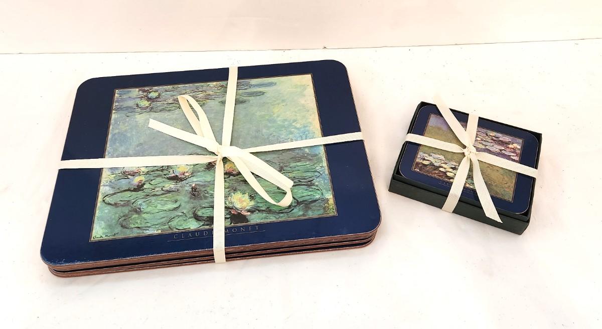 Nice set of 6 small placemats and Boxed set of matching coasters in box - Claude Monet "Water Lilies" motif. Great condition. Placemats measure 11.5" x 8.5" - coasters are 4" x 4.5".