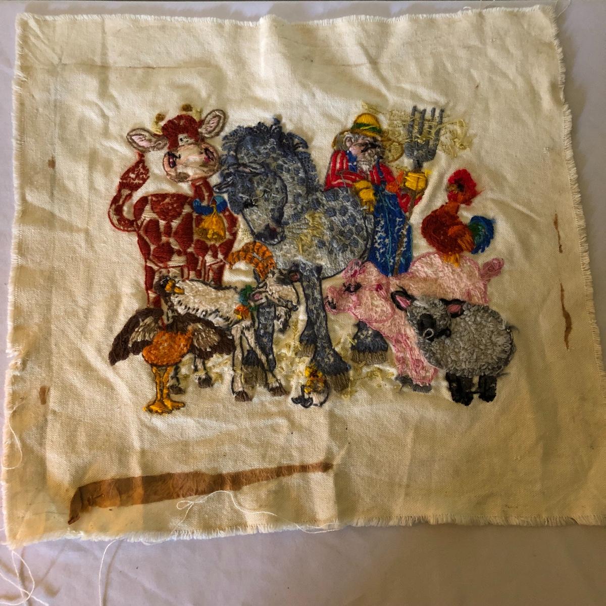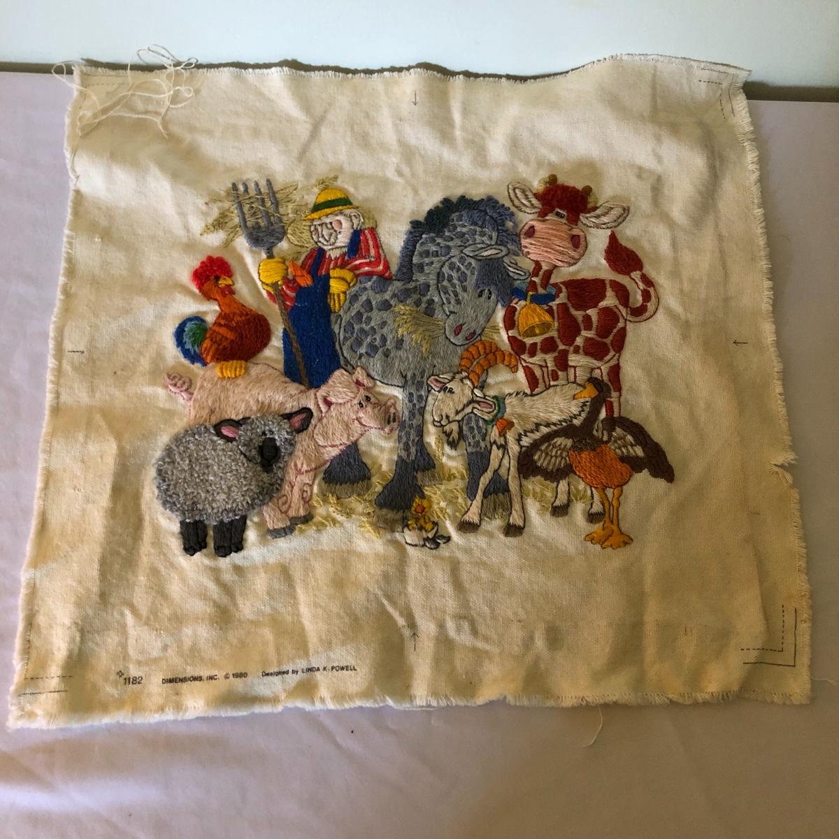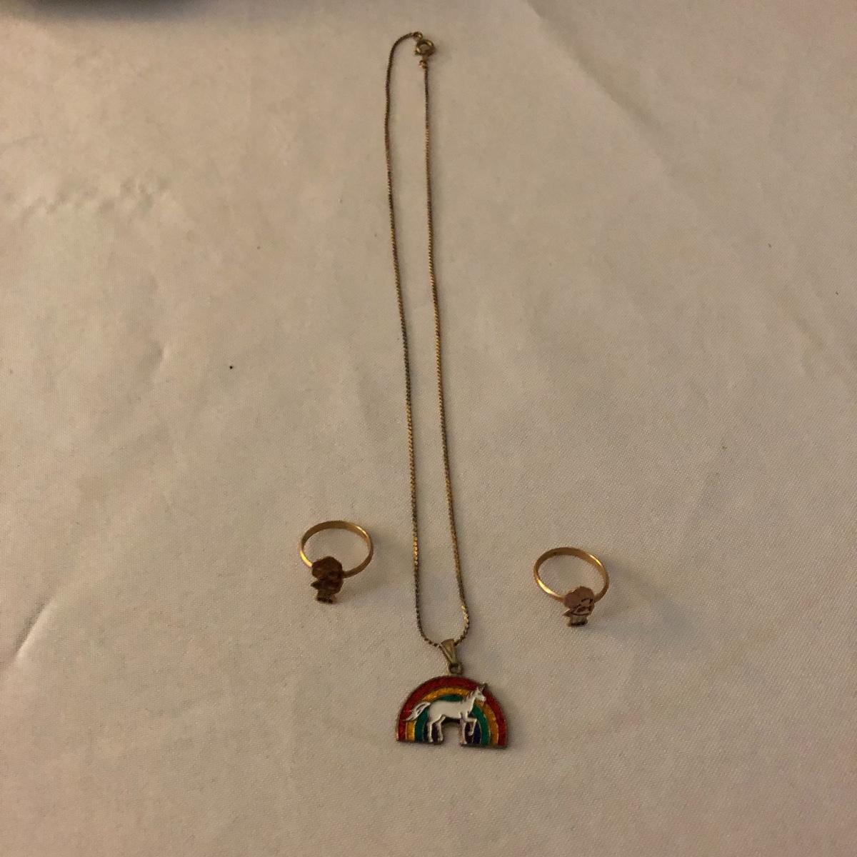 Relive your childhood with this selection of children’s tea set, jewelry and more. Lot includes unicorn necklace,two bracelets three rings, tea set, doll stroller, spoon and a piece of art on fabric with farm animals.