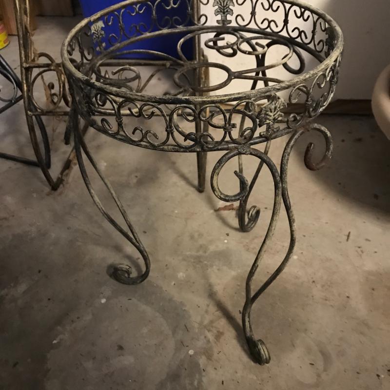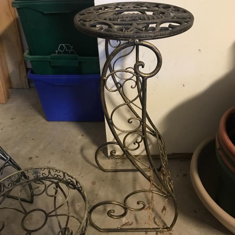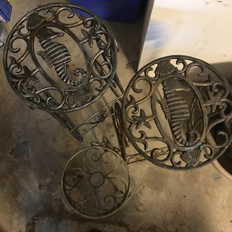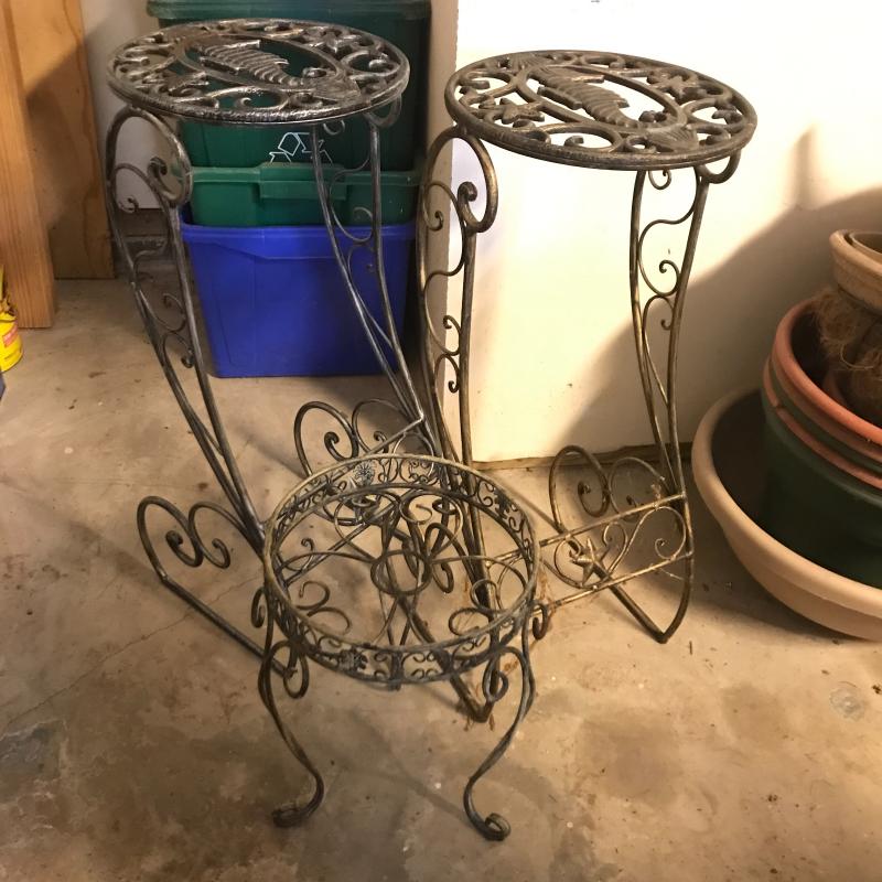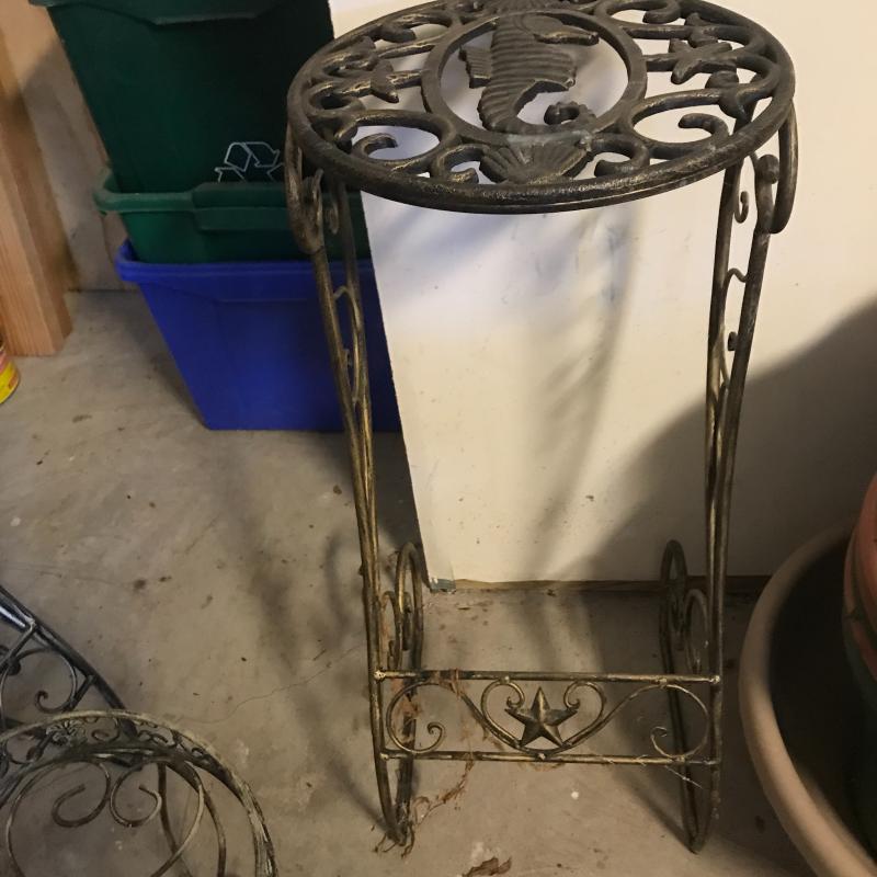 Three metal plant stands. Two tall ones match with seahorse design and stand 28” tall. Smaller one is 15” tall. No shipping. Local pick up in Asheville, NC only.