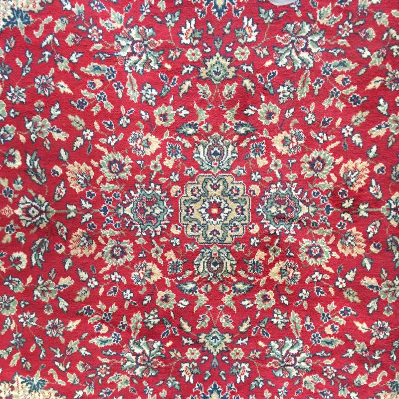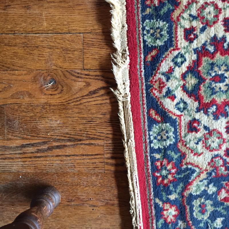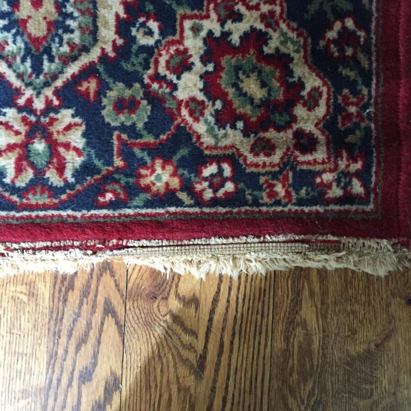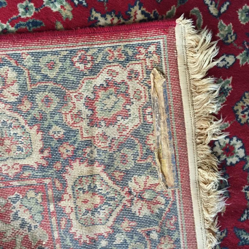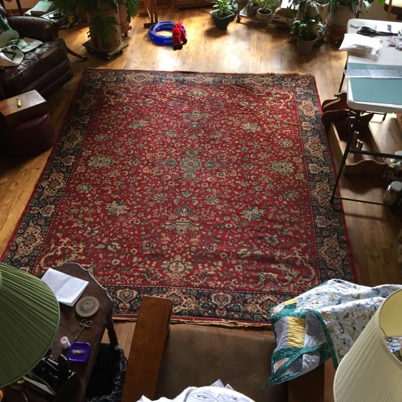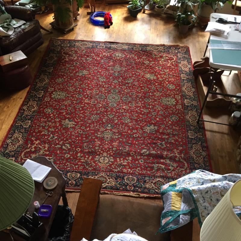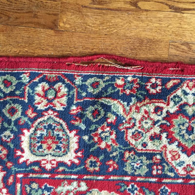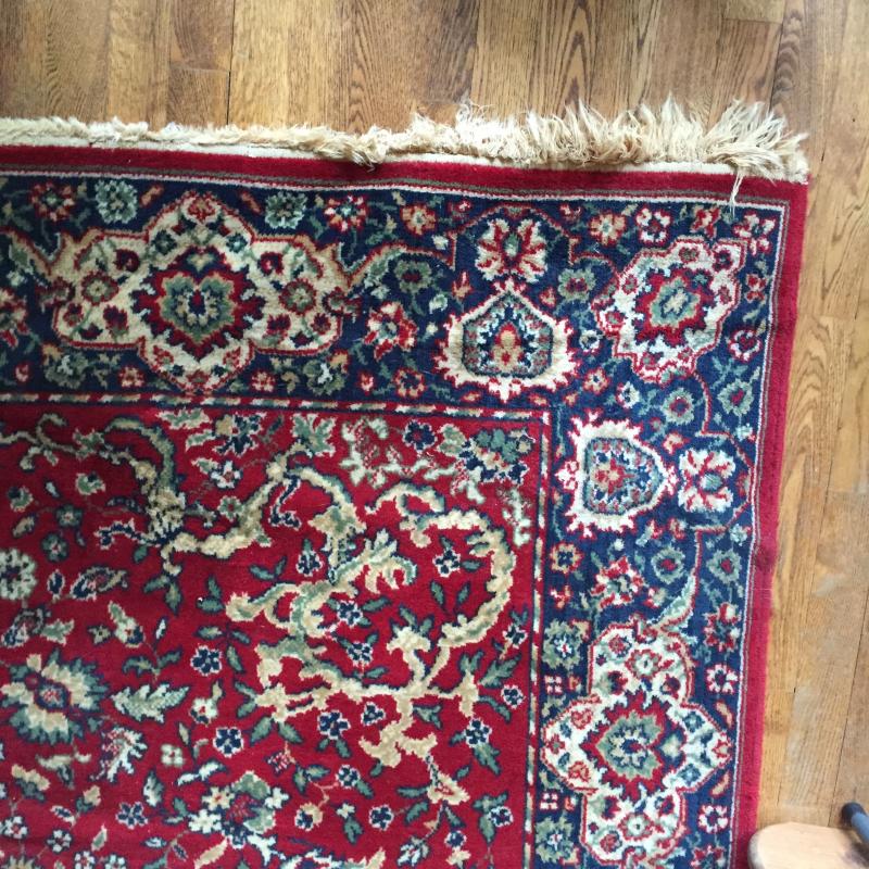 Oriental Rug has normal wear and Tear. Some blemishes- See Pictures. From a Home with Pets and Measures 116” x 94” From Fringe. Predominate colors are red, blue and cream.
