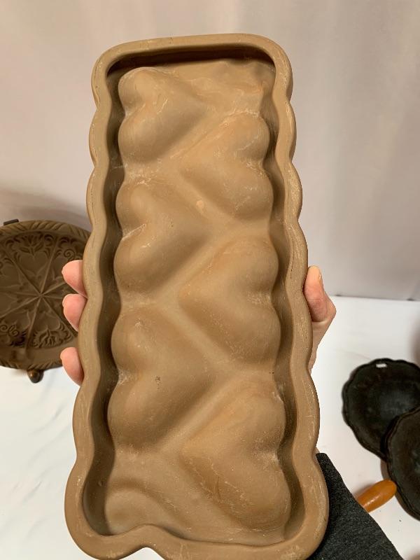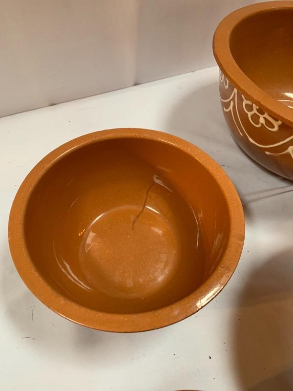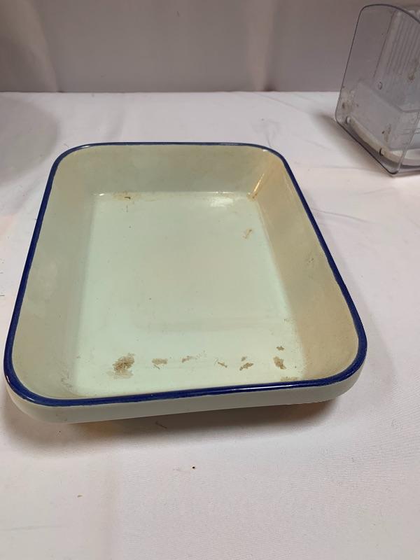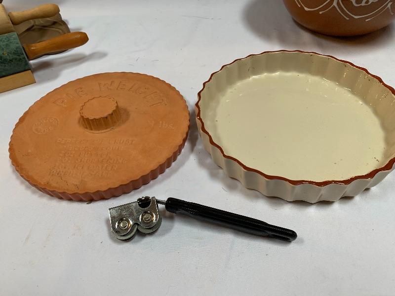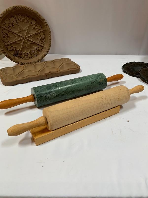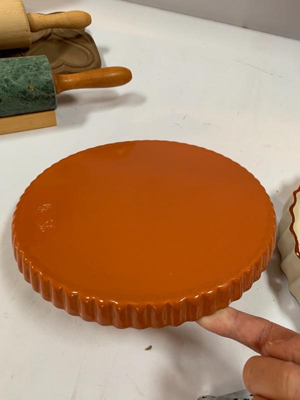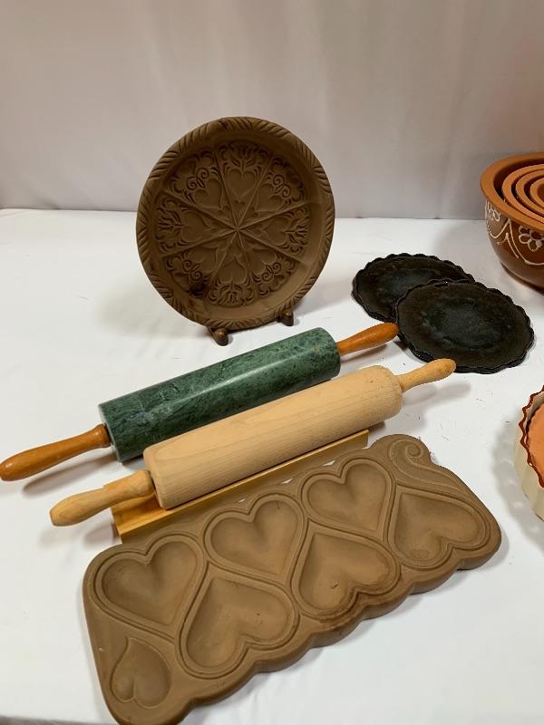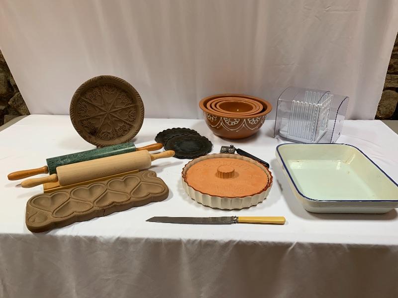 This lot has some nice pieces to add to your baking accessories. First there are two lovely shortbread molds made of clay. Four terra cotta nesting bowls from Italy with two having a little bit of crazing (see photos), two rolling pins and one stand. Green is a marble one for candies. There are two metal crepe molds for your stove eyes, a pie/tart dish, pie weight, plastic bread cutting box with lovely vintage bread cutting knife and pie edger. Largest nesting bowl measures 11” dia and stands 5” tall. Local pick up only.
