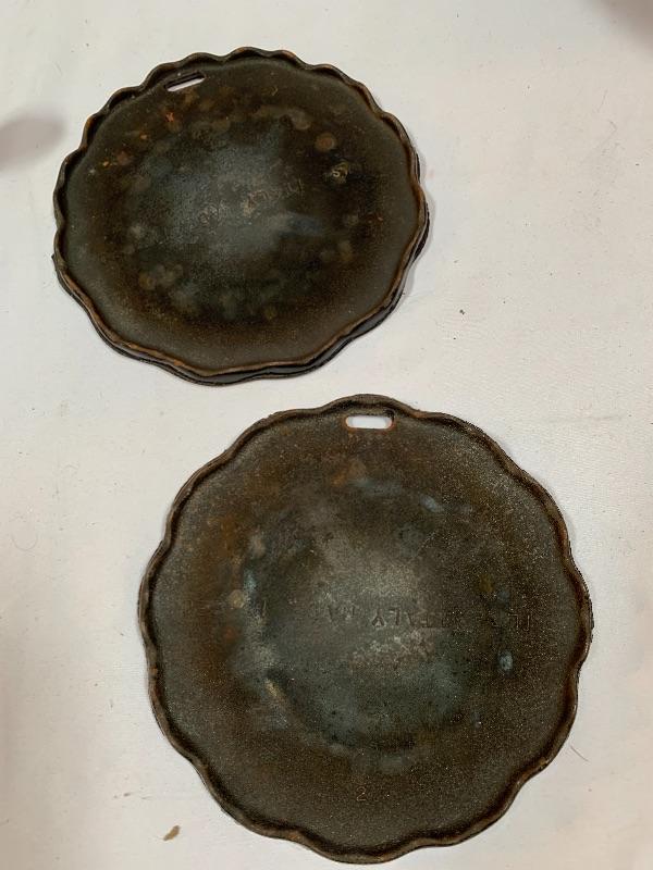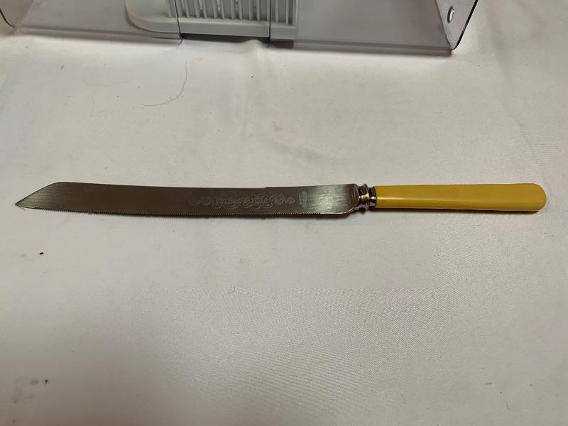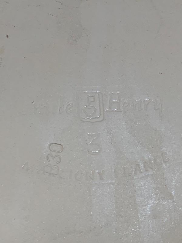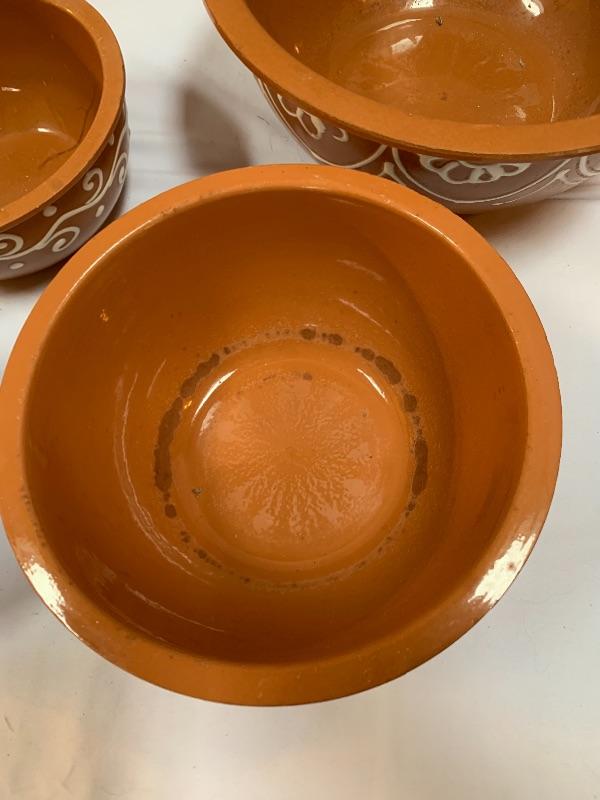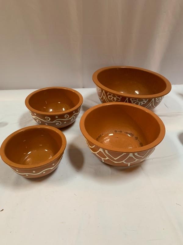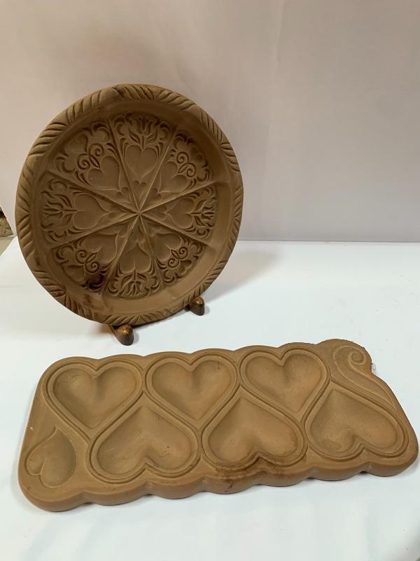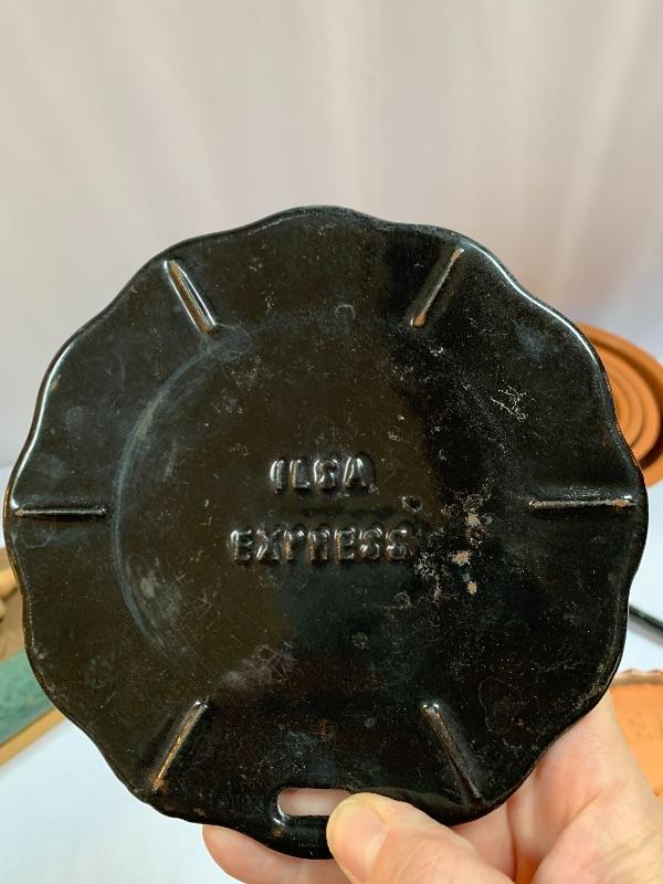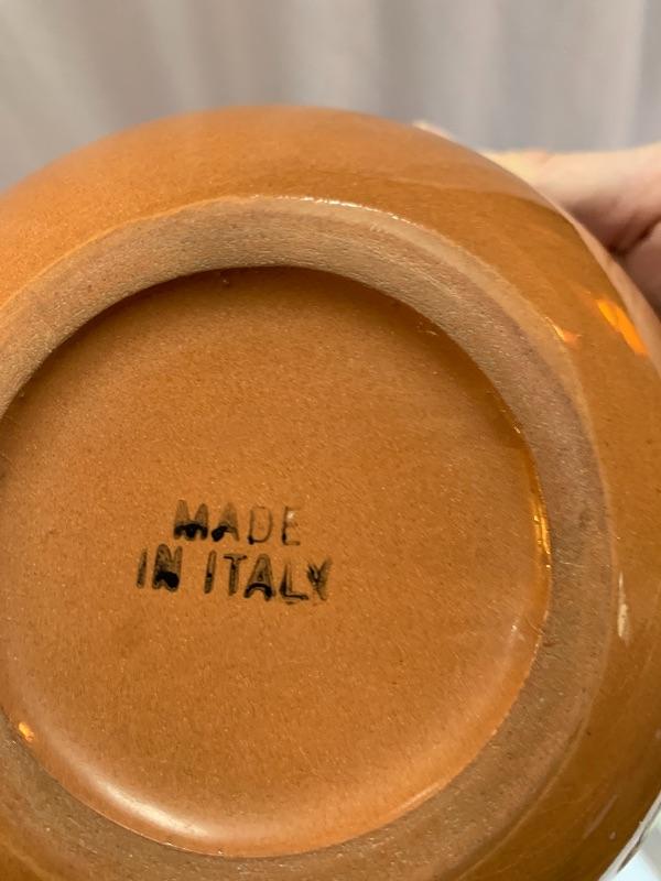 This lot has some nice pieces to add to your baking accessories. First there are two lovely shortbread molds made of clay. Four terra cotta nesting bowls from Italy with two having a little bit of crazing (see photos), two rolling pins and one stand. Green is a marble one for candies. There are two metal crepe molds for your stove eyes, a pie/tart dish, pie weight, plastic bread cutting box with lovely vintage bread cutting knife and pie edger. Largest nesting bowl measures 11” dia and stands 5” tall. Local pick up only.