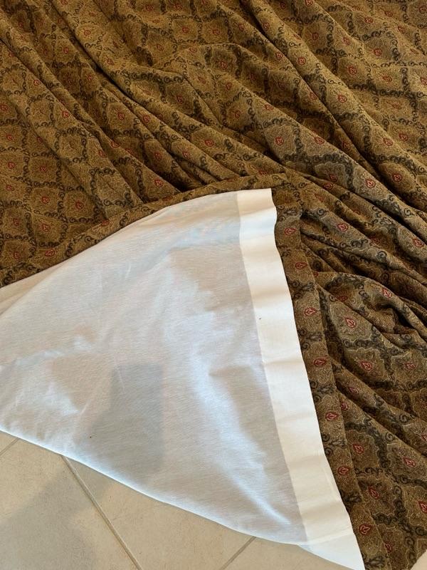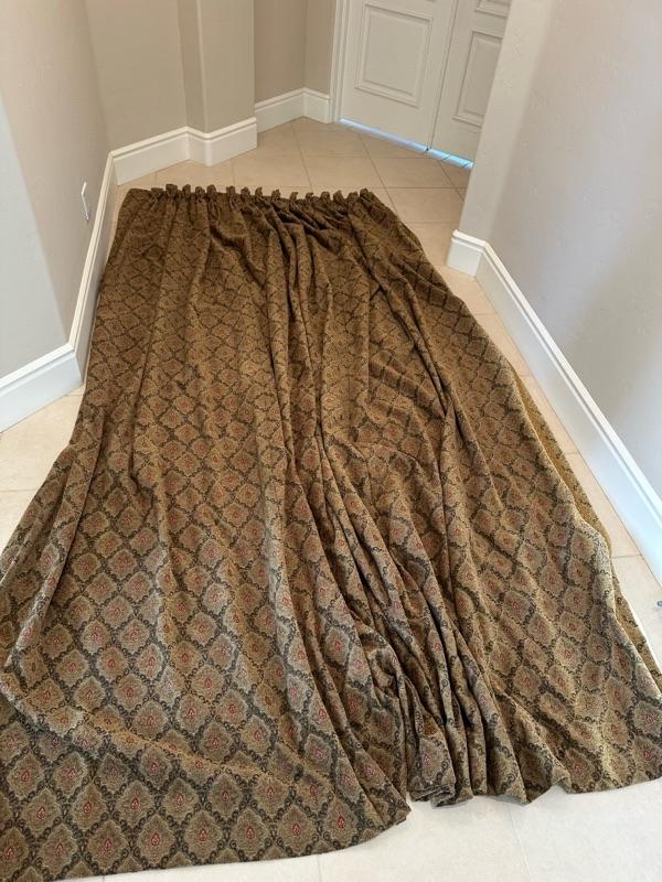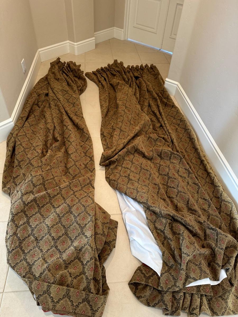 Two heavy custom-made curtain panels. Each panel is approximately 10 feet long and 6 feet across.
