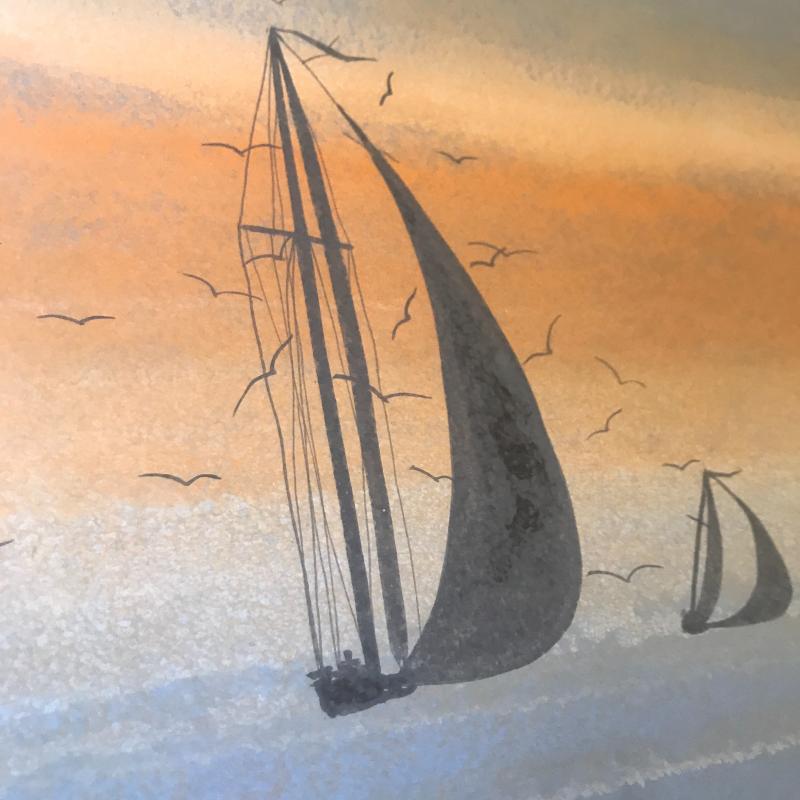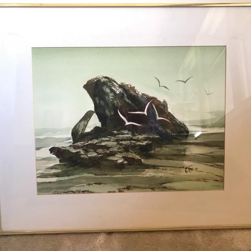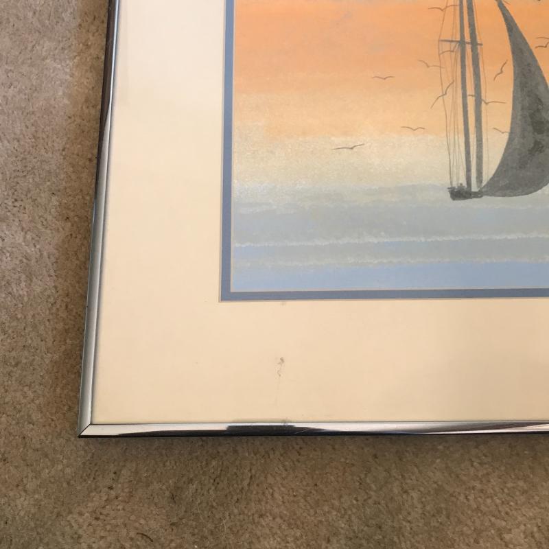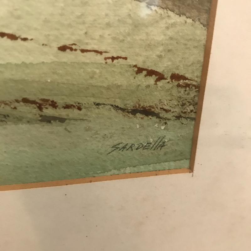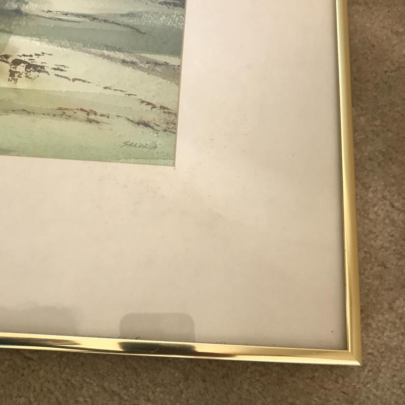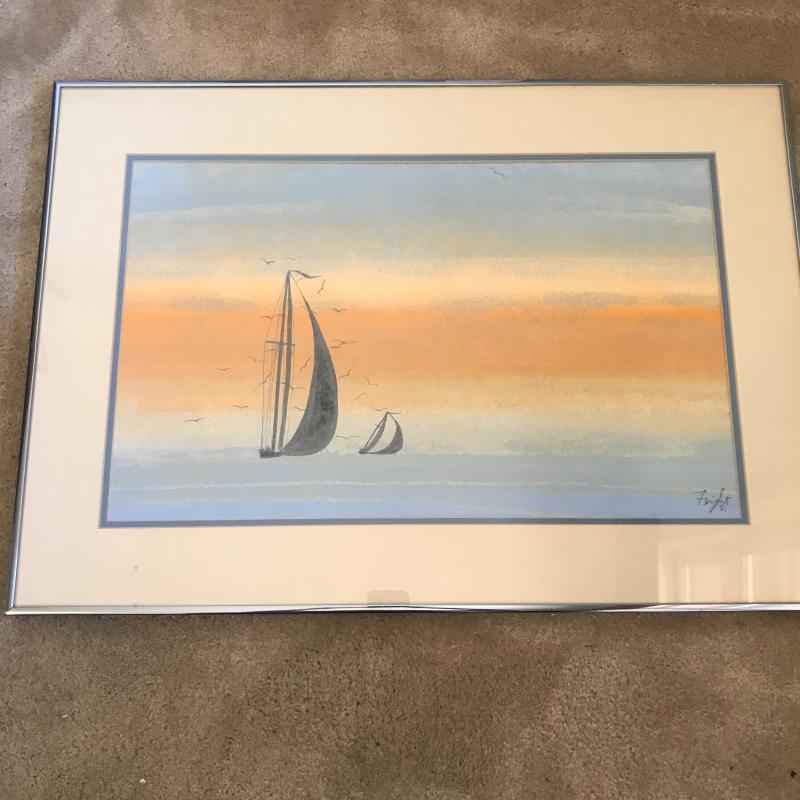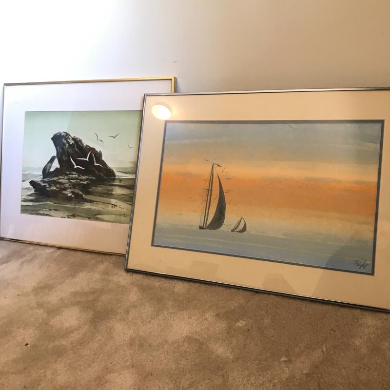 Gold metal framed watercolor signed “Sardella” measures 24” x 20”. Silver metal framed sailboats signed “Feight “˜81” measures 27” x 19”. No shipping.