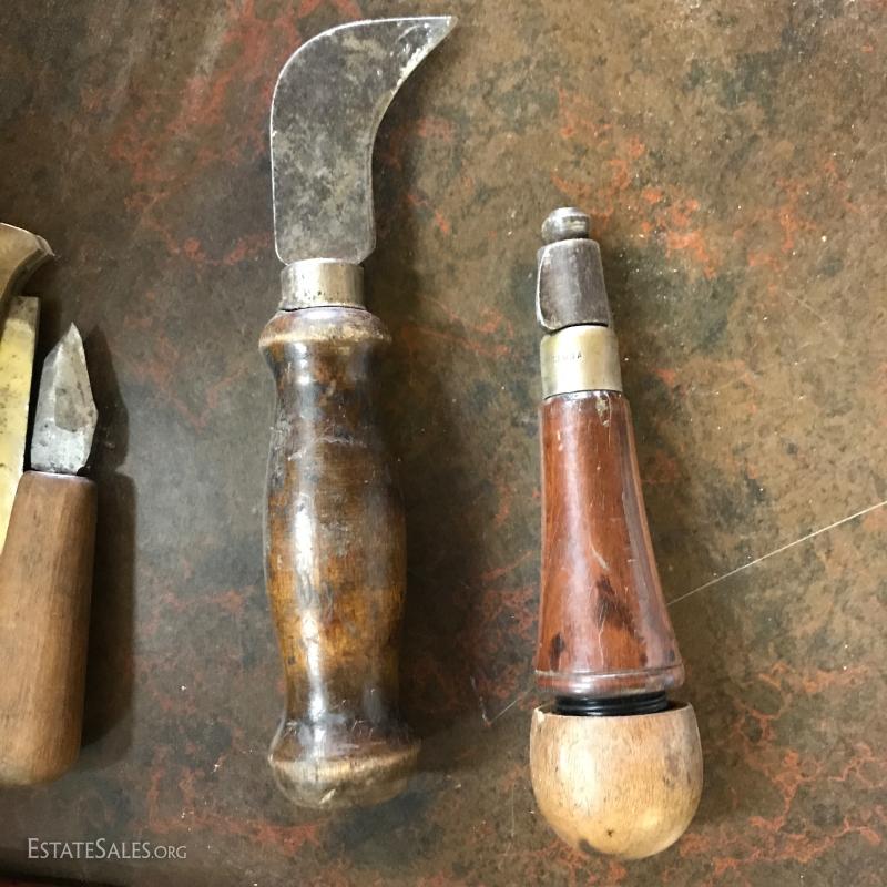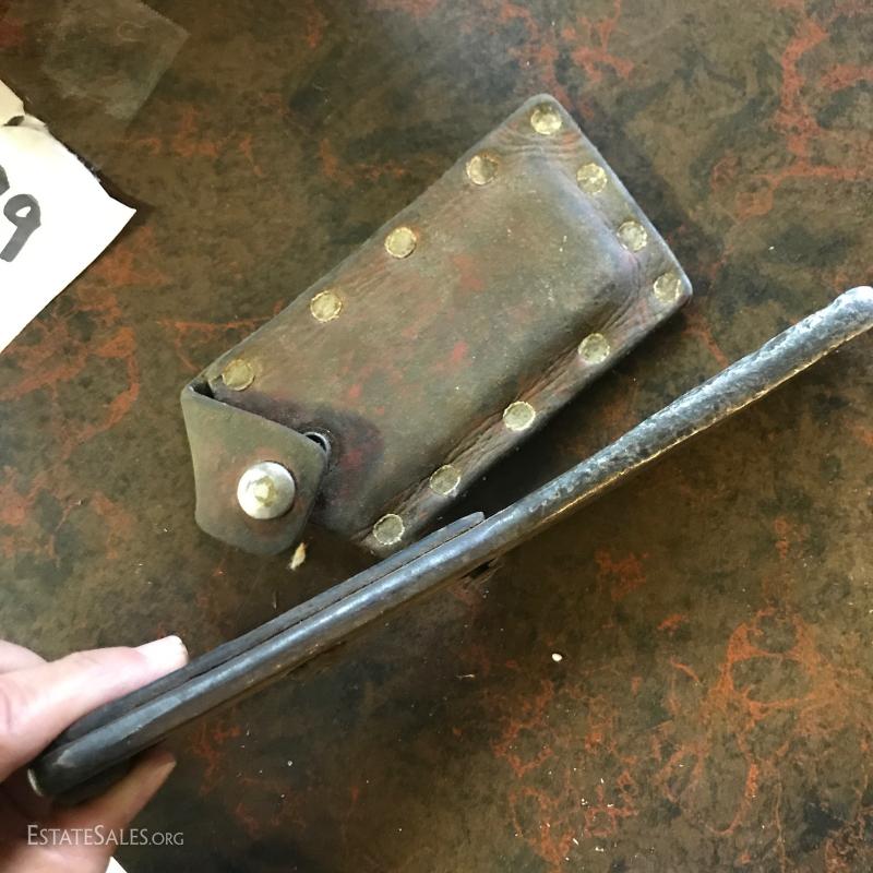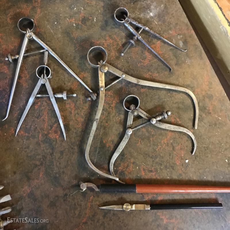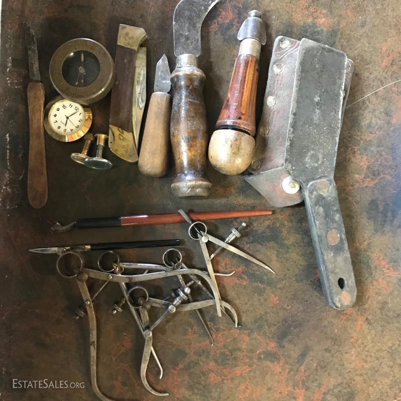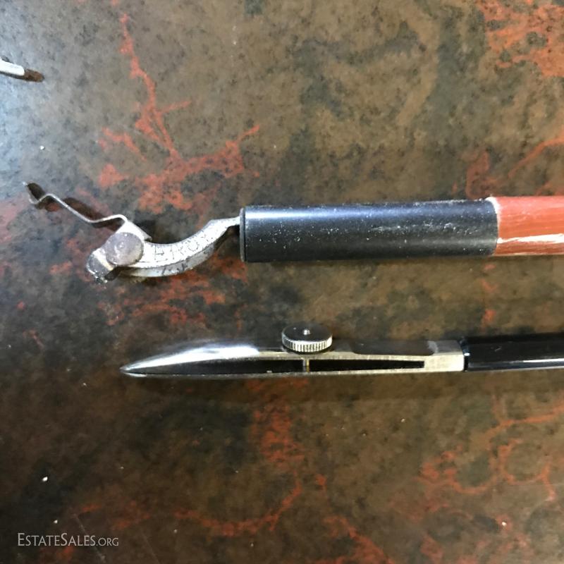 Vintage Bell System hatchet/axe with case. 9" long. Compass from Army Corp of Engineers. Assorted Compass rulers, Olympia beer opener, and more. See photos.