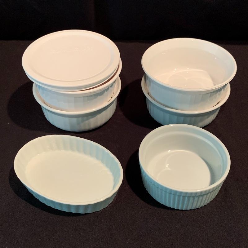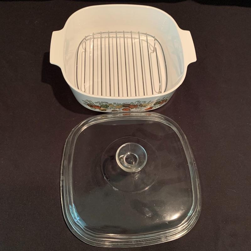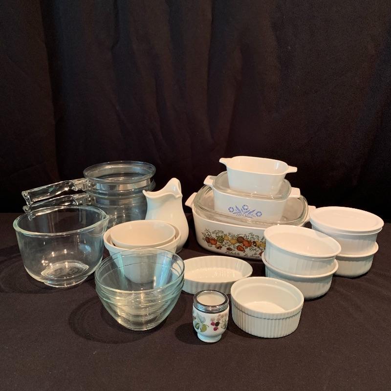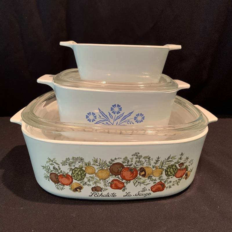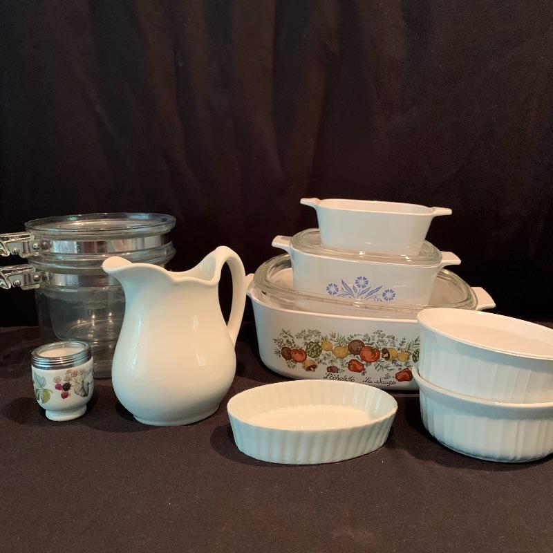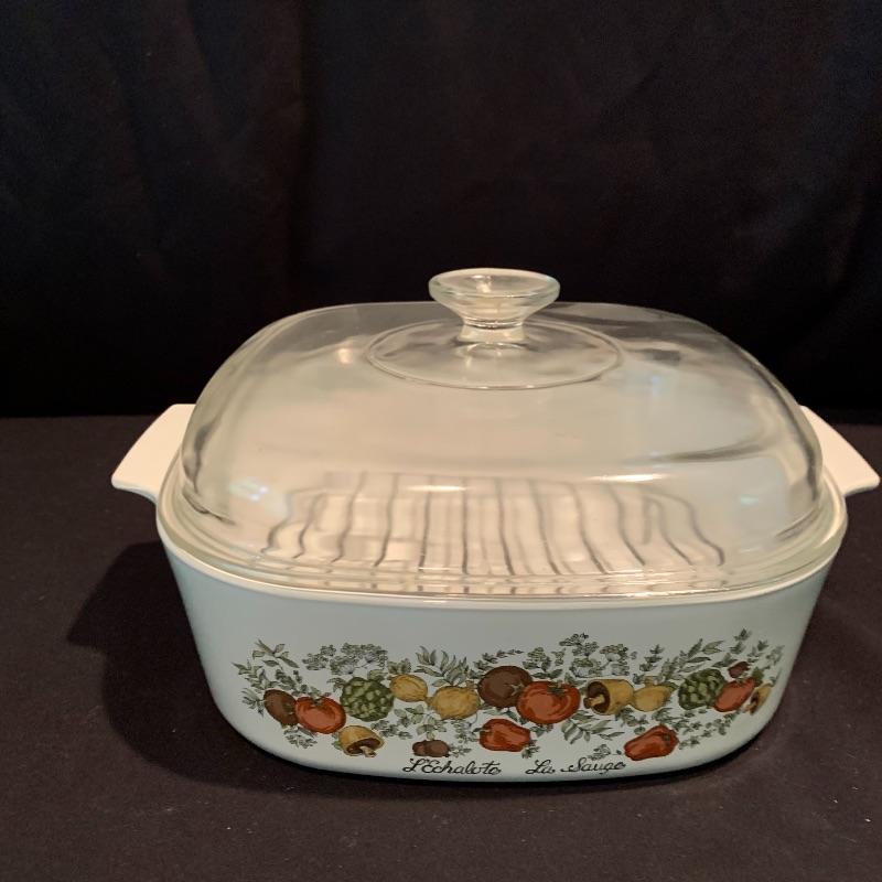 Lot 223 - Vintage L’Echalote La Sauge Corning Ware Casserole Dish, Pyrex, and More
