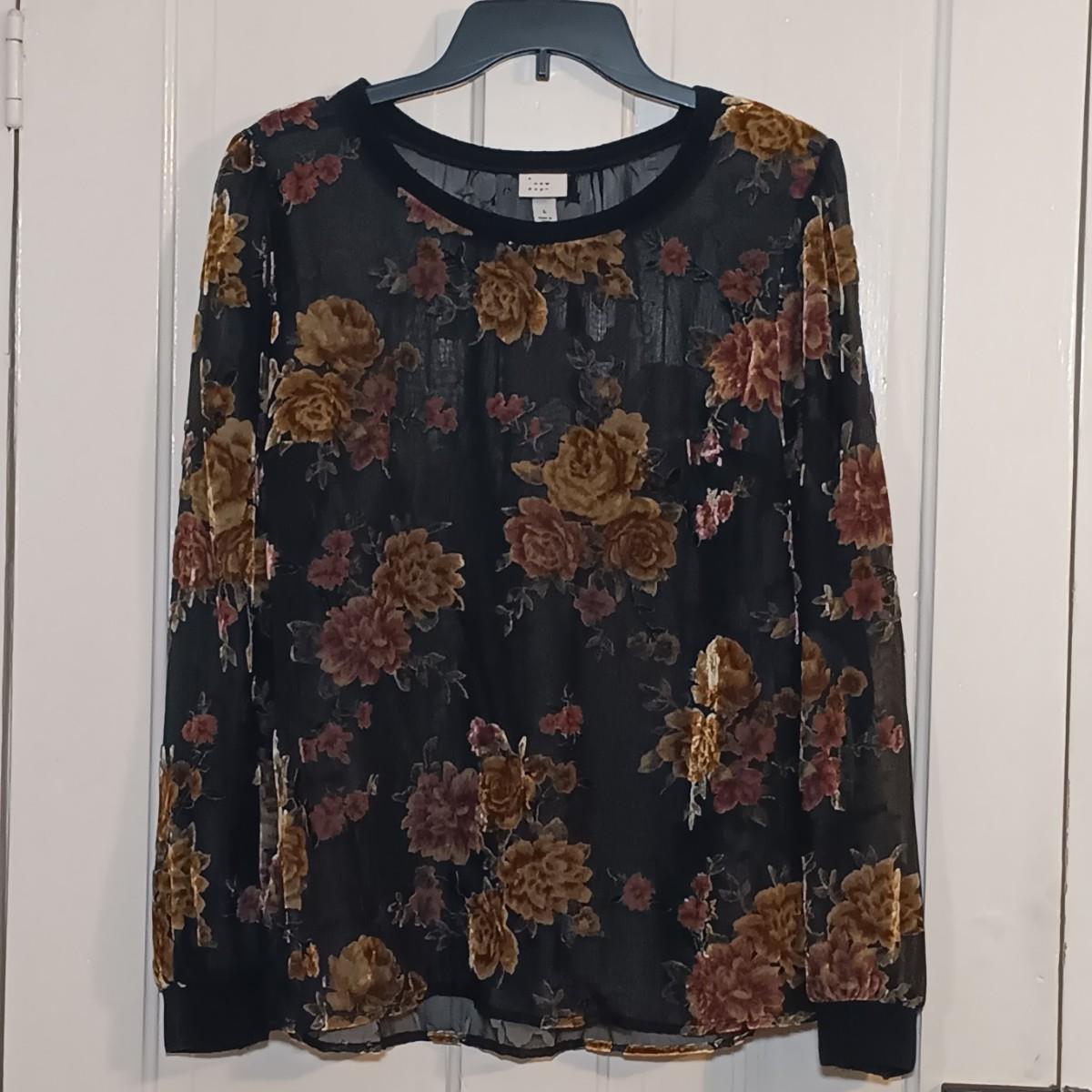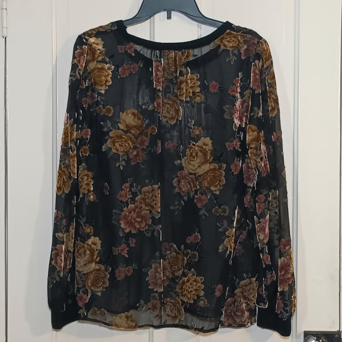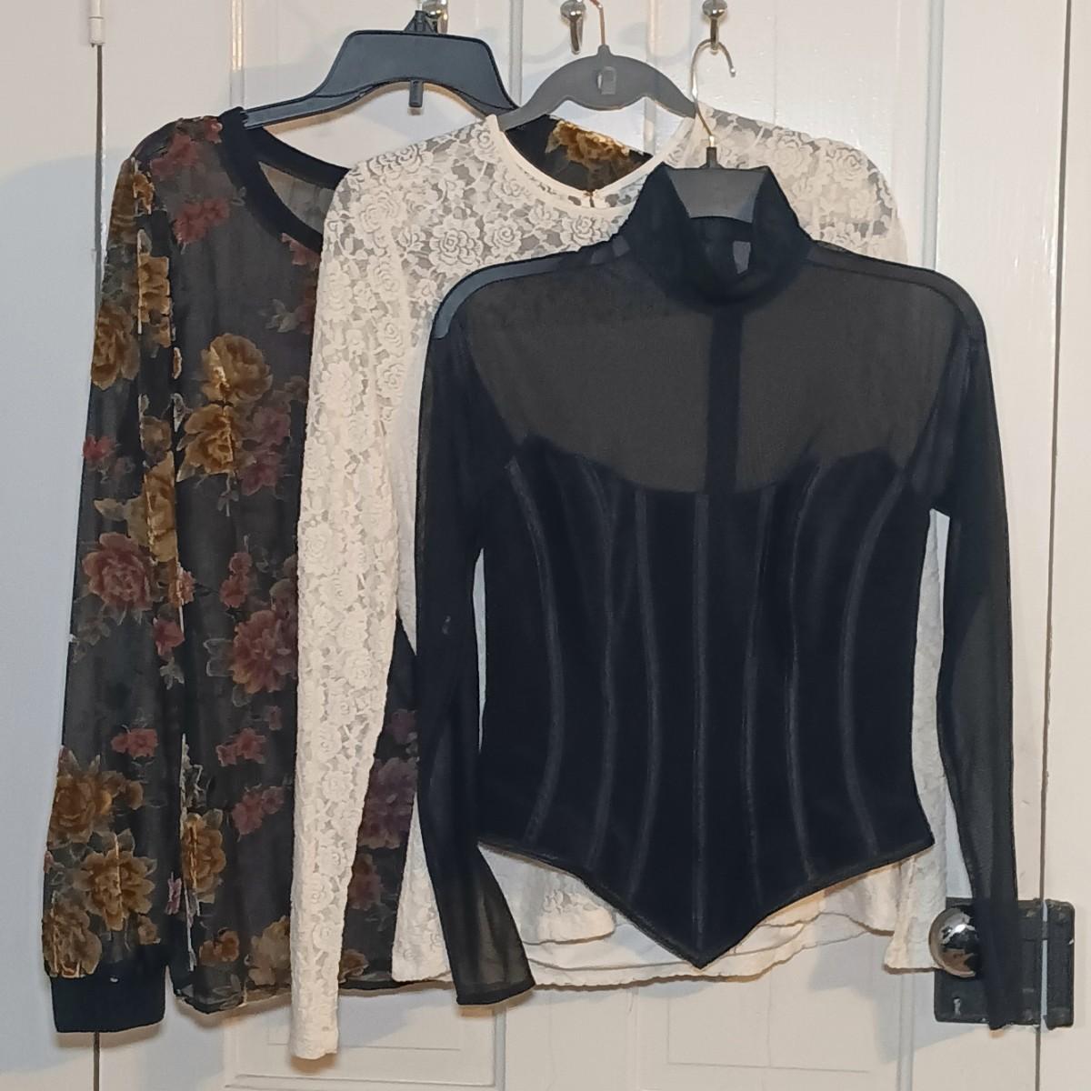 LOT 224: Vintage Caché Sheer Sleeve Corset, Ralph Lauren Floral Lace Long Sleeve Shirt & A New Day Velvet Rose on Sheer Fabric Long Sleeve