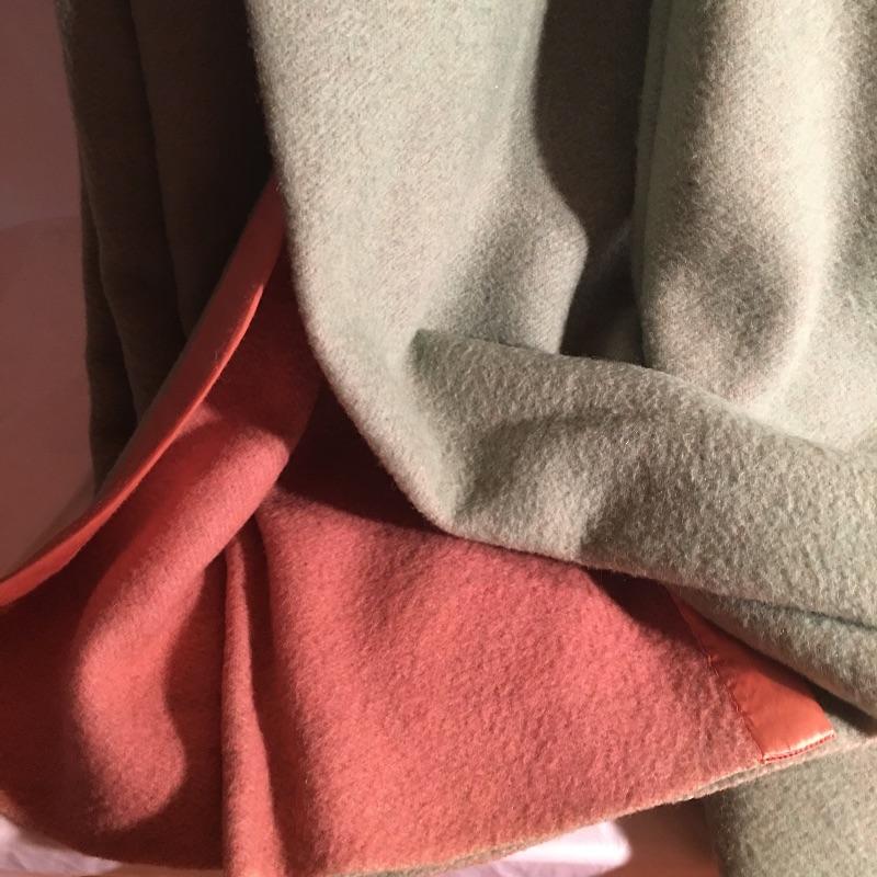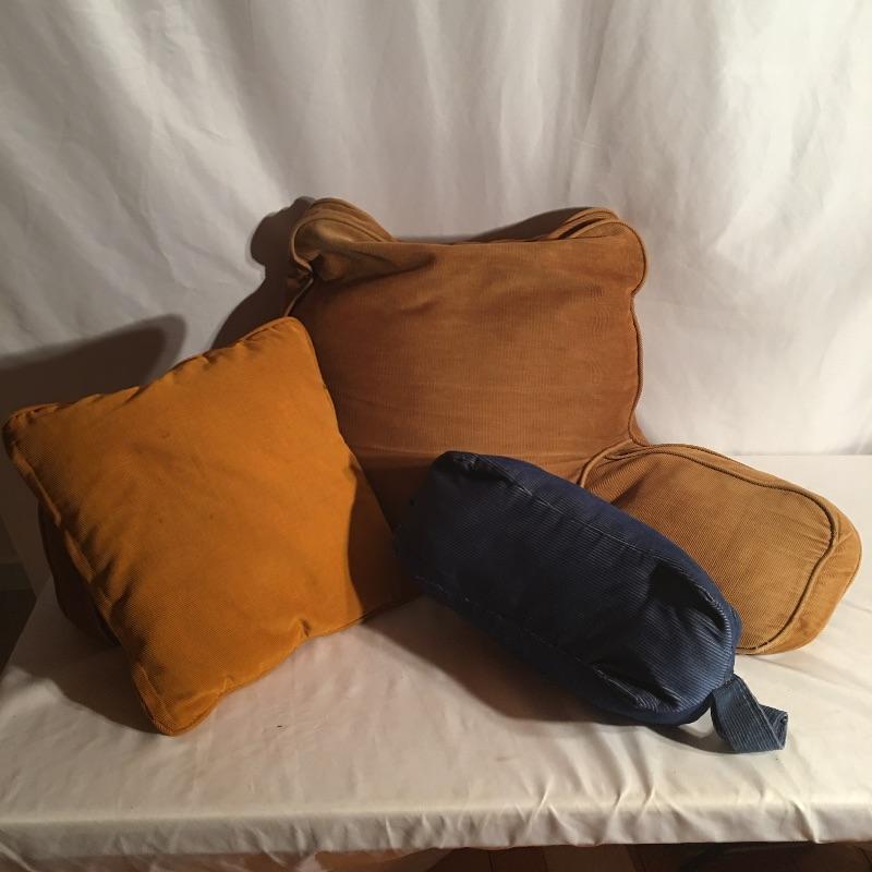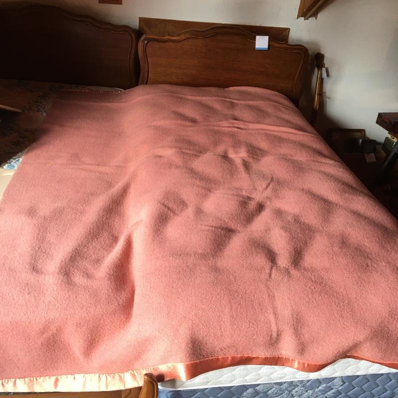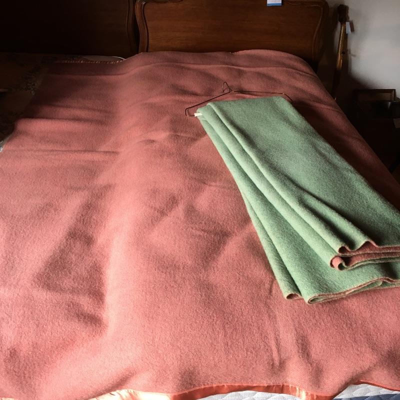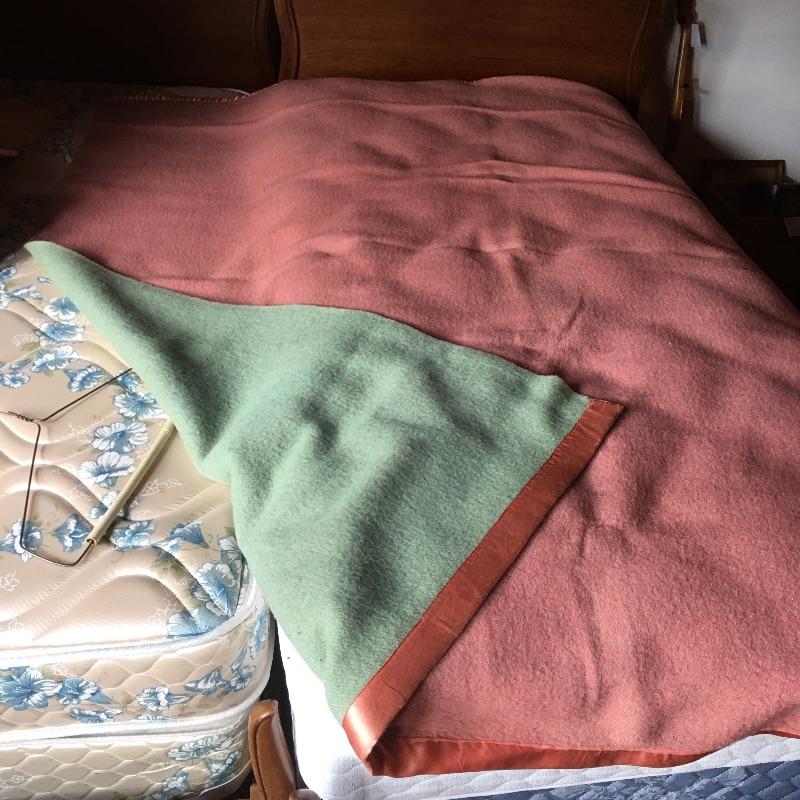 Keep warm this winter with this pair of reversible wool blankets. Lot includes two wool reversible blankets that measure 74” x 78”, two twin coverlets, tan corduroy backrest pillow and two small pillows. Coverlets have some sun damage, see pictures.