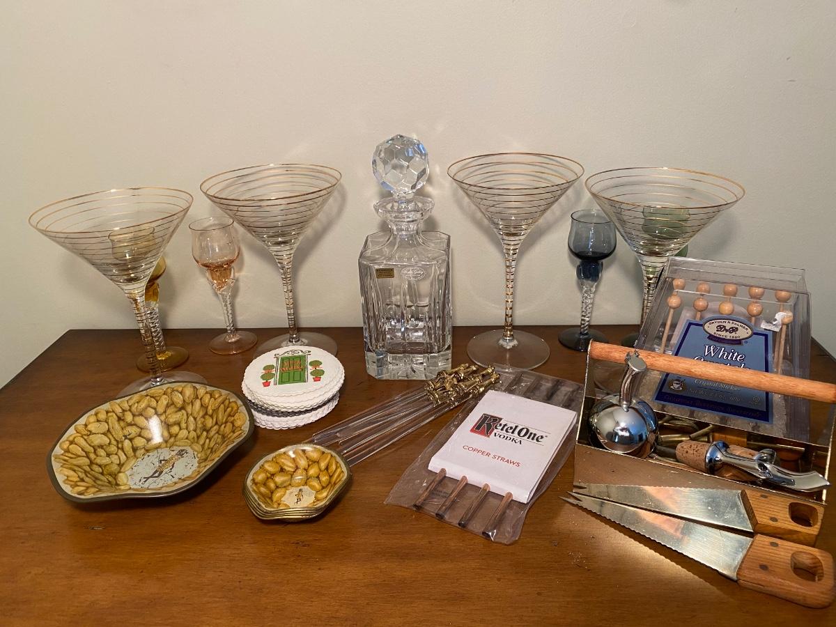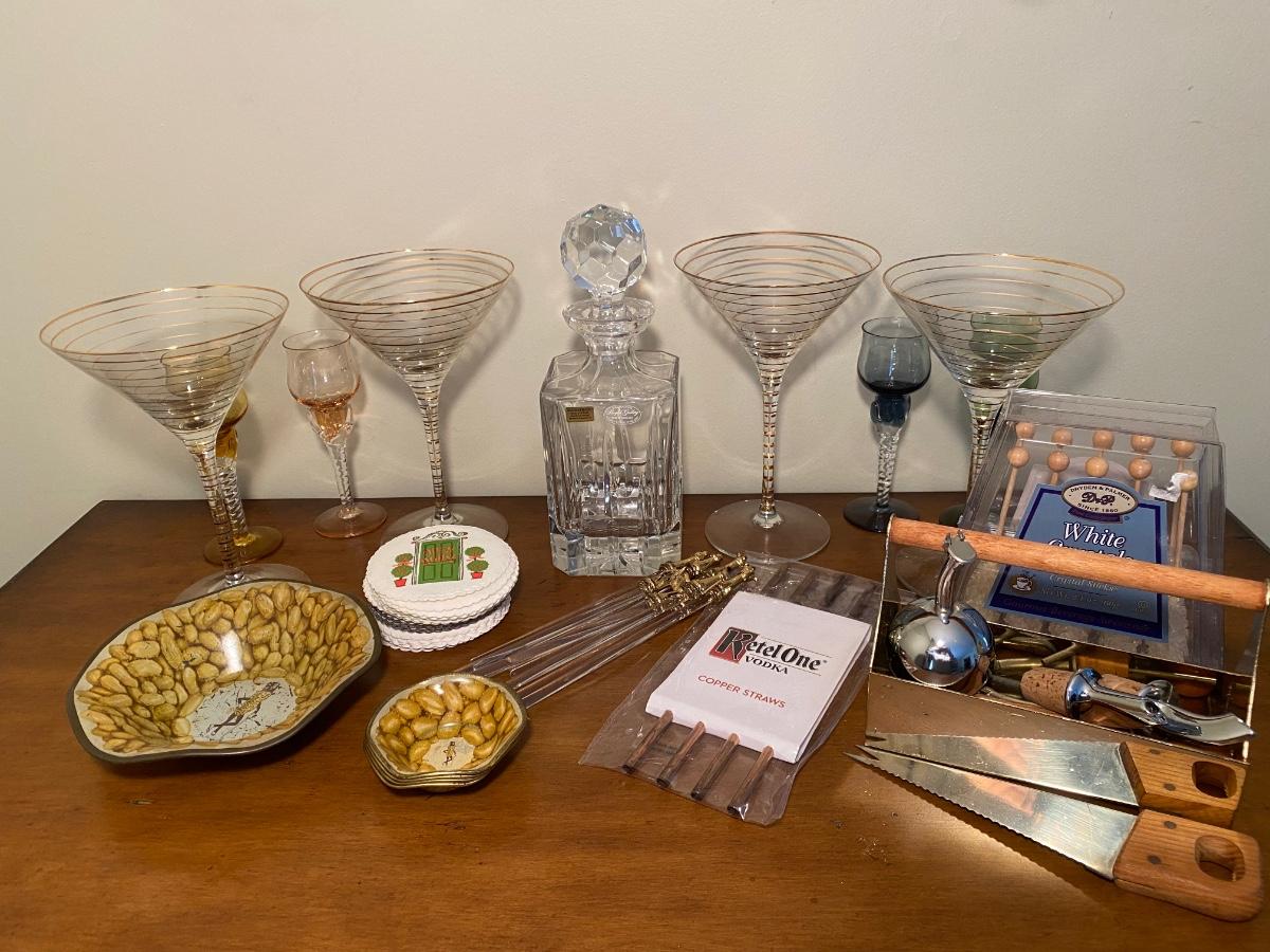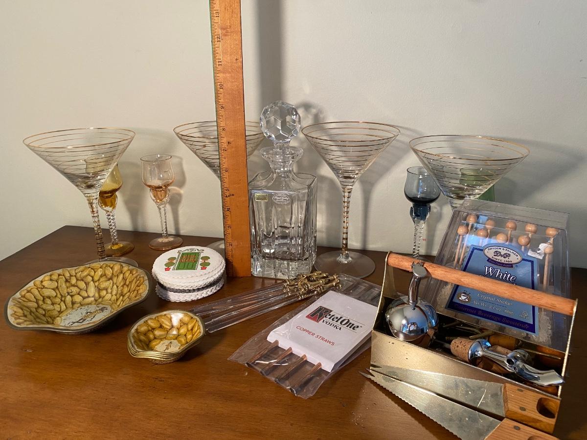 Bar collection includes heavy lead Crystal decanter, Kettle One vodka metal straws, Mr. Peanut nut dishes, glasses and more.