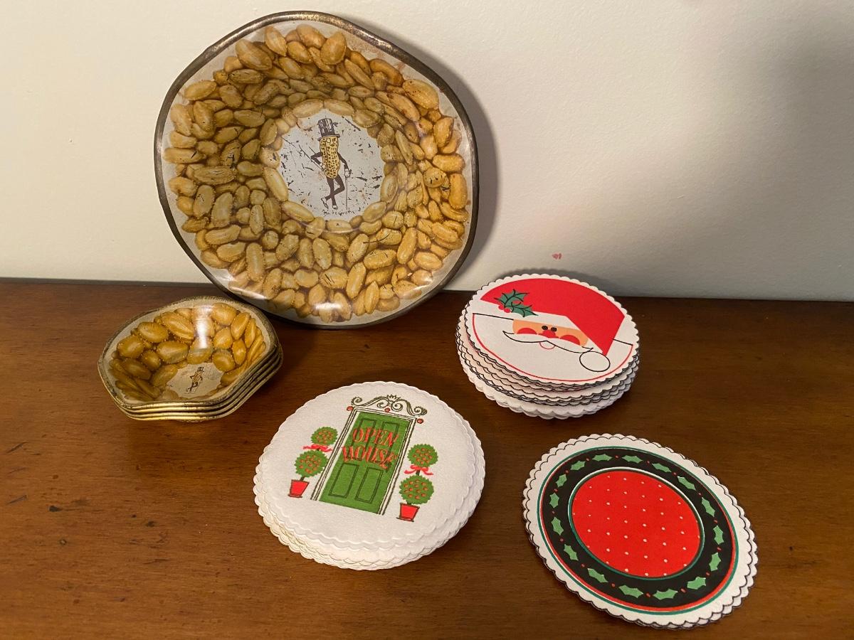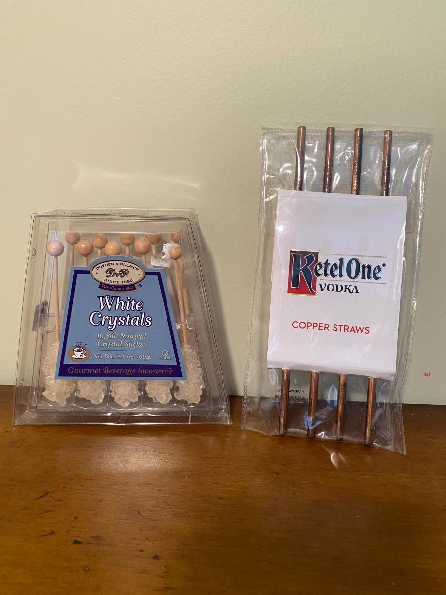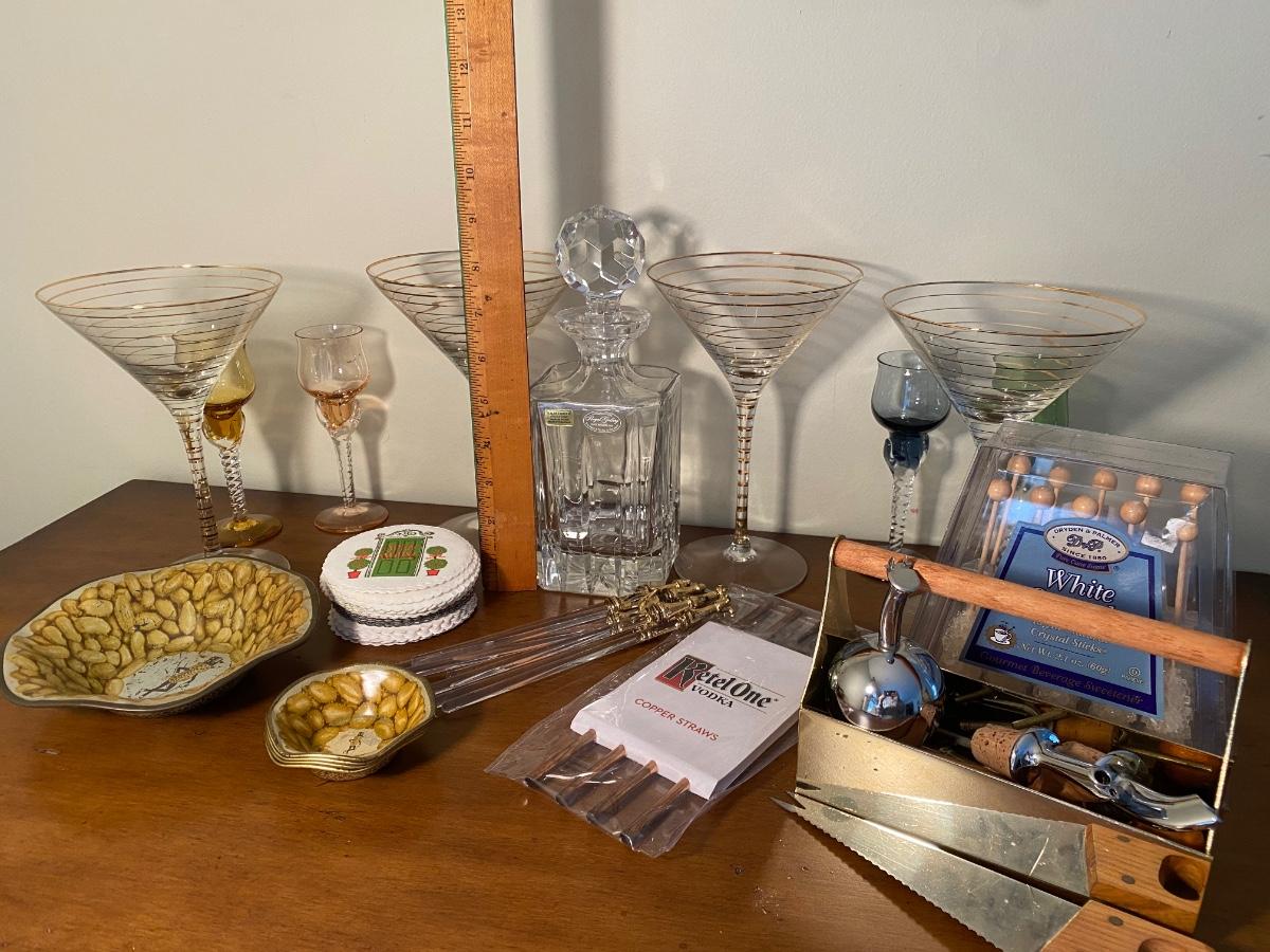 Bar collection includes heavy lead Crystal decanter, Kettle One vodka metal straws, Mr. Peanut nut dishes, glasses and more.