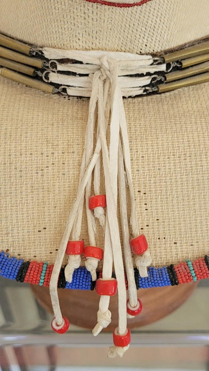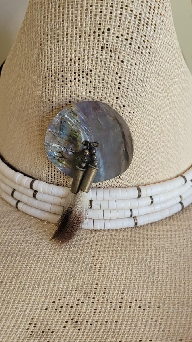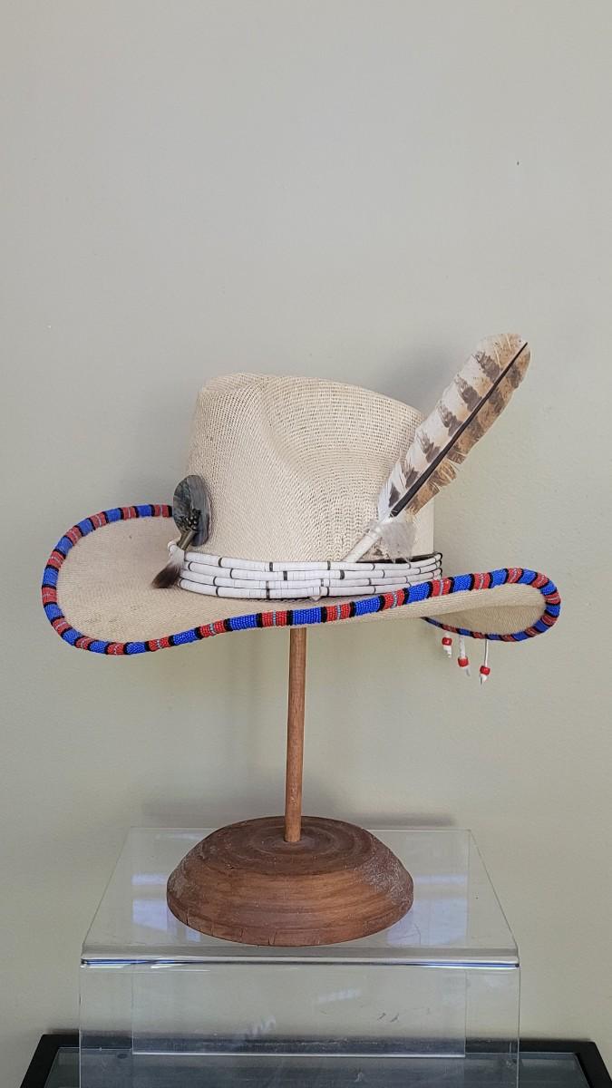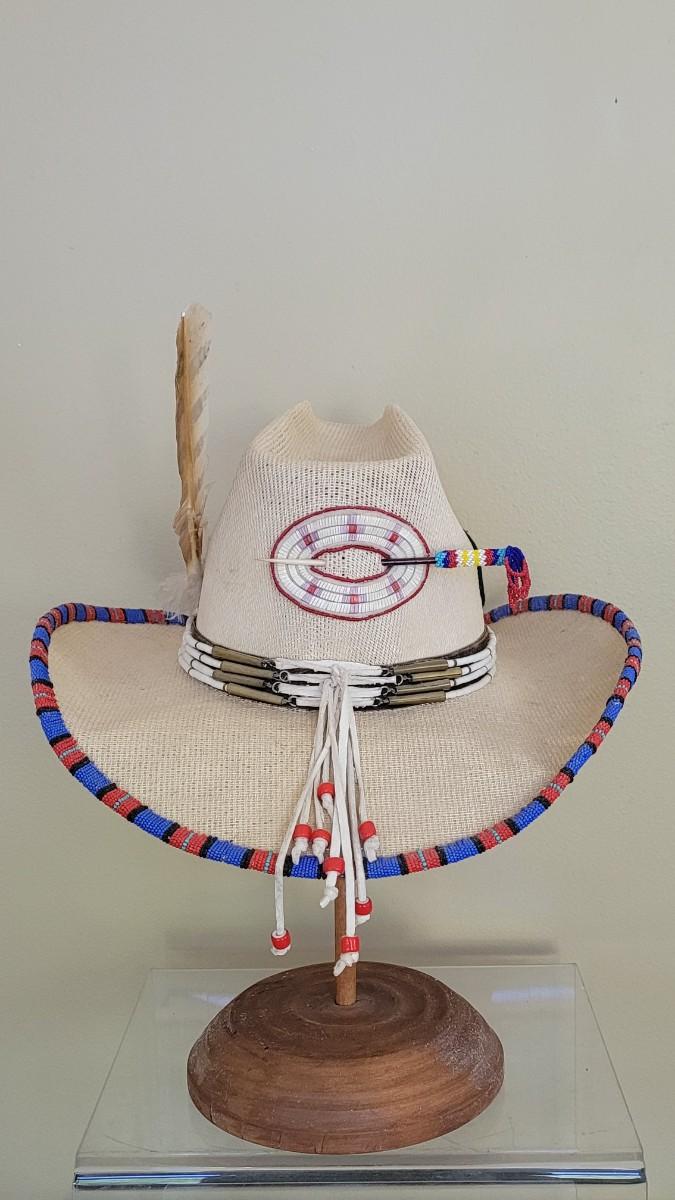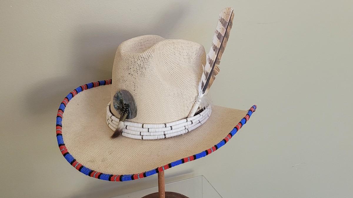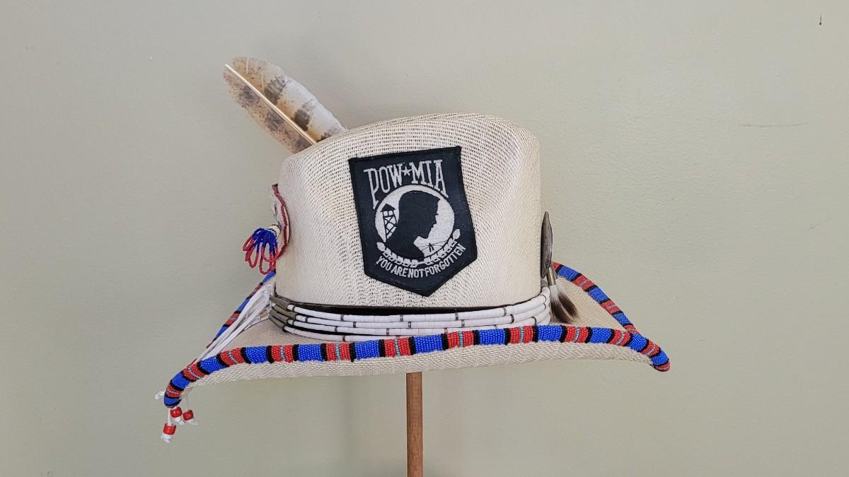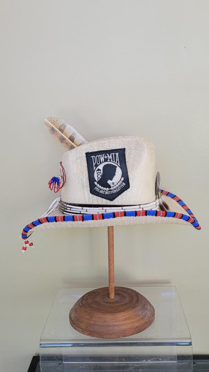 Lot 224: Embellished Cowboy Hat with Beaded Rim POW Patch, Native American Quil Art and Heishi Hat Band