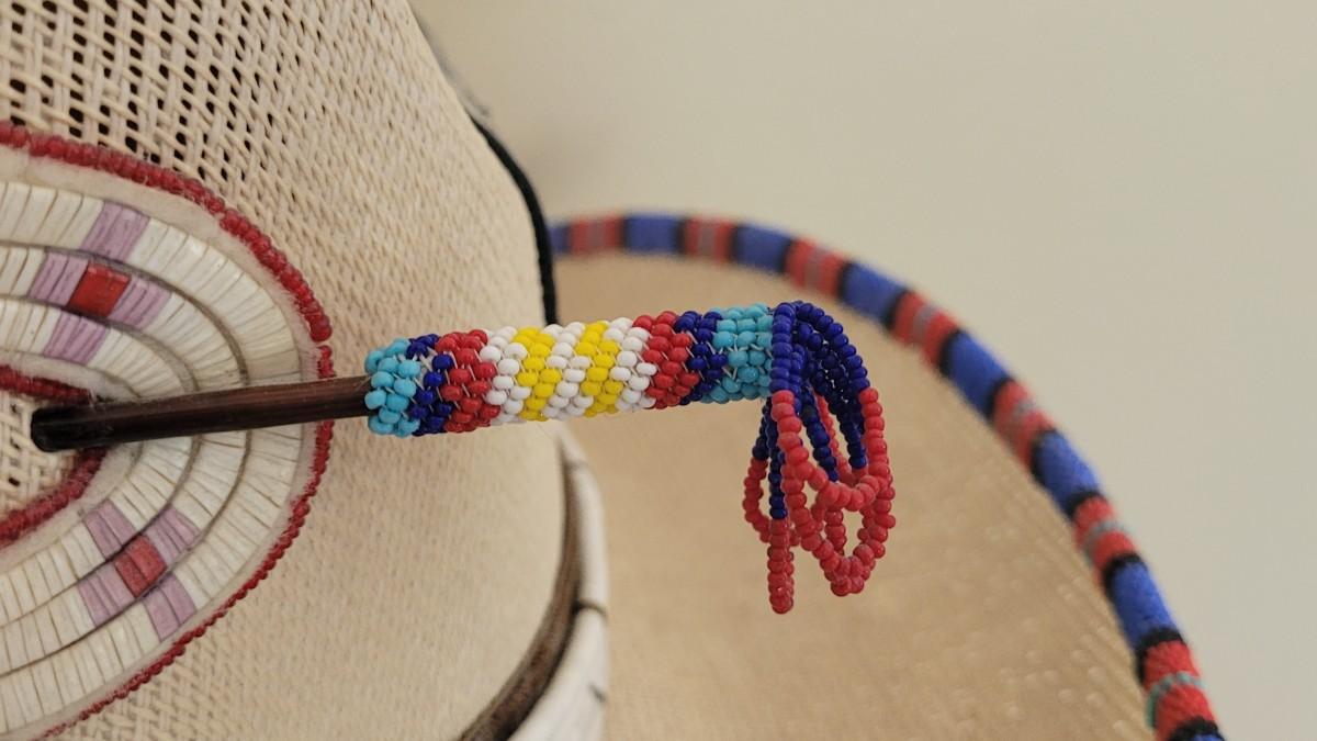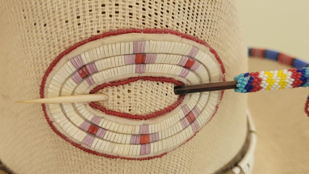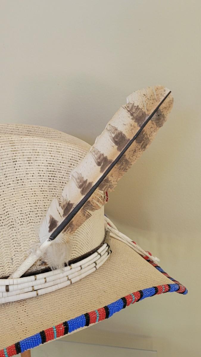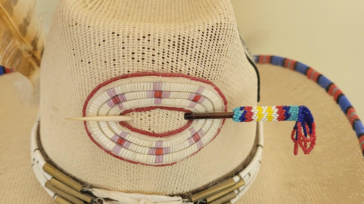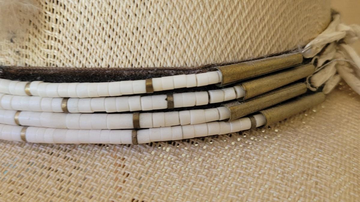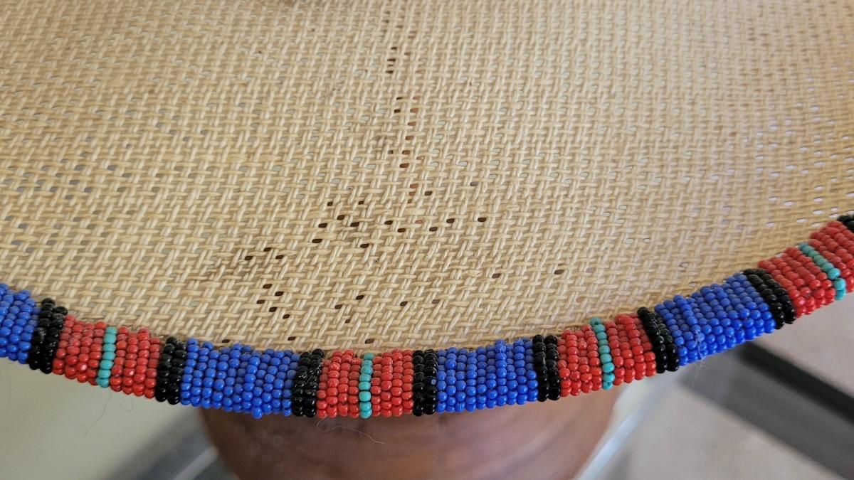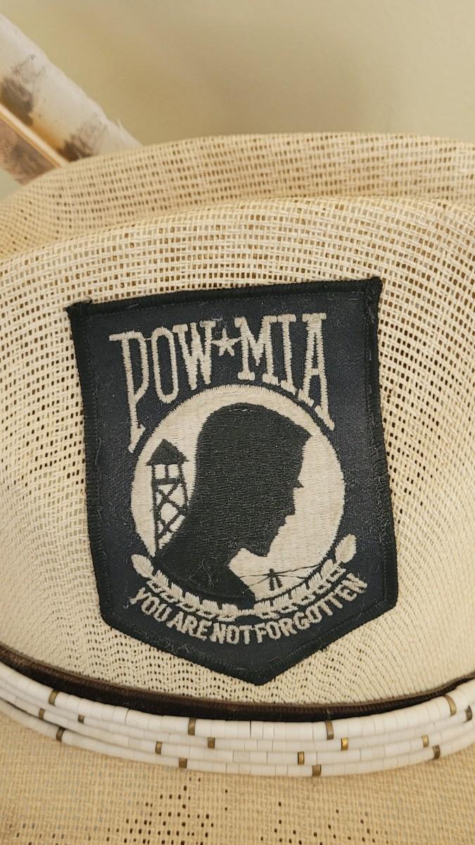 Lot 224: Embellished Cowboy Hat with Beaded Rim POW Patch, Native American Quil Art and Heishi Hat Band