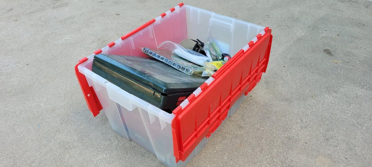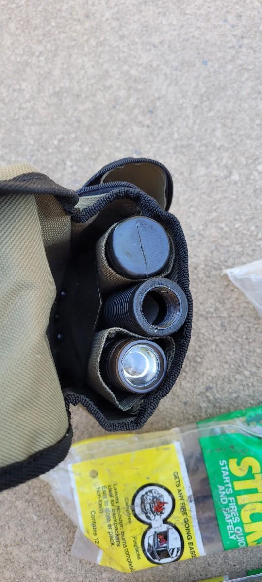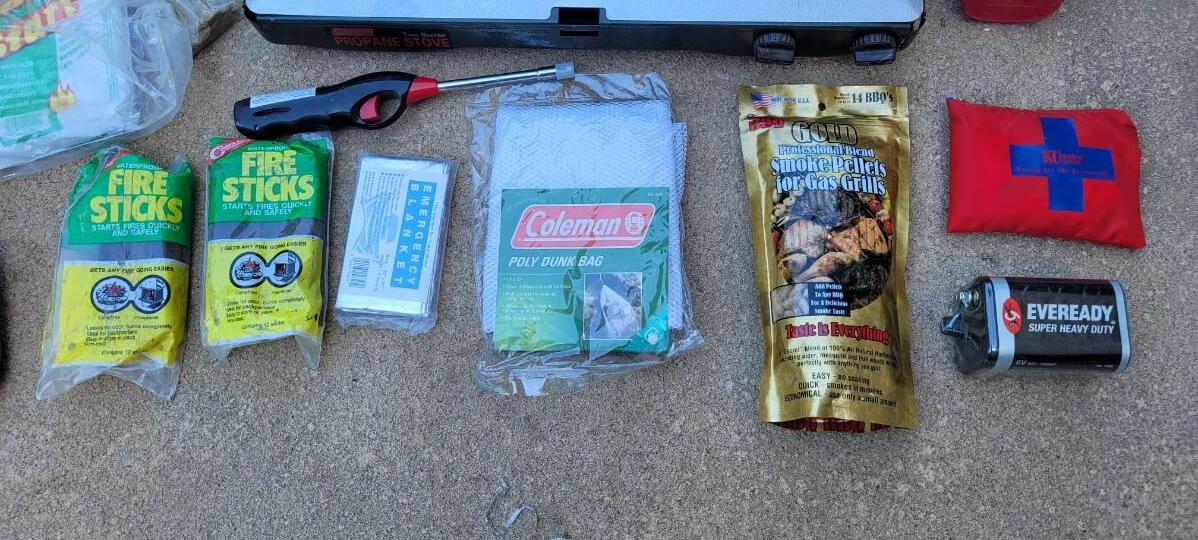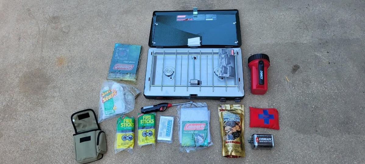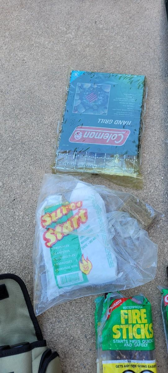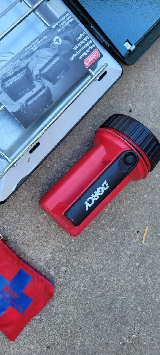 Large Camping Bundle that includes some great items that will help on your next outdoor adventure. COLEMAN Stove in great condition, a pocket collapsible Shovel, so much more. Tote included.