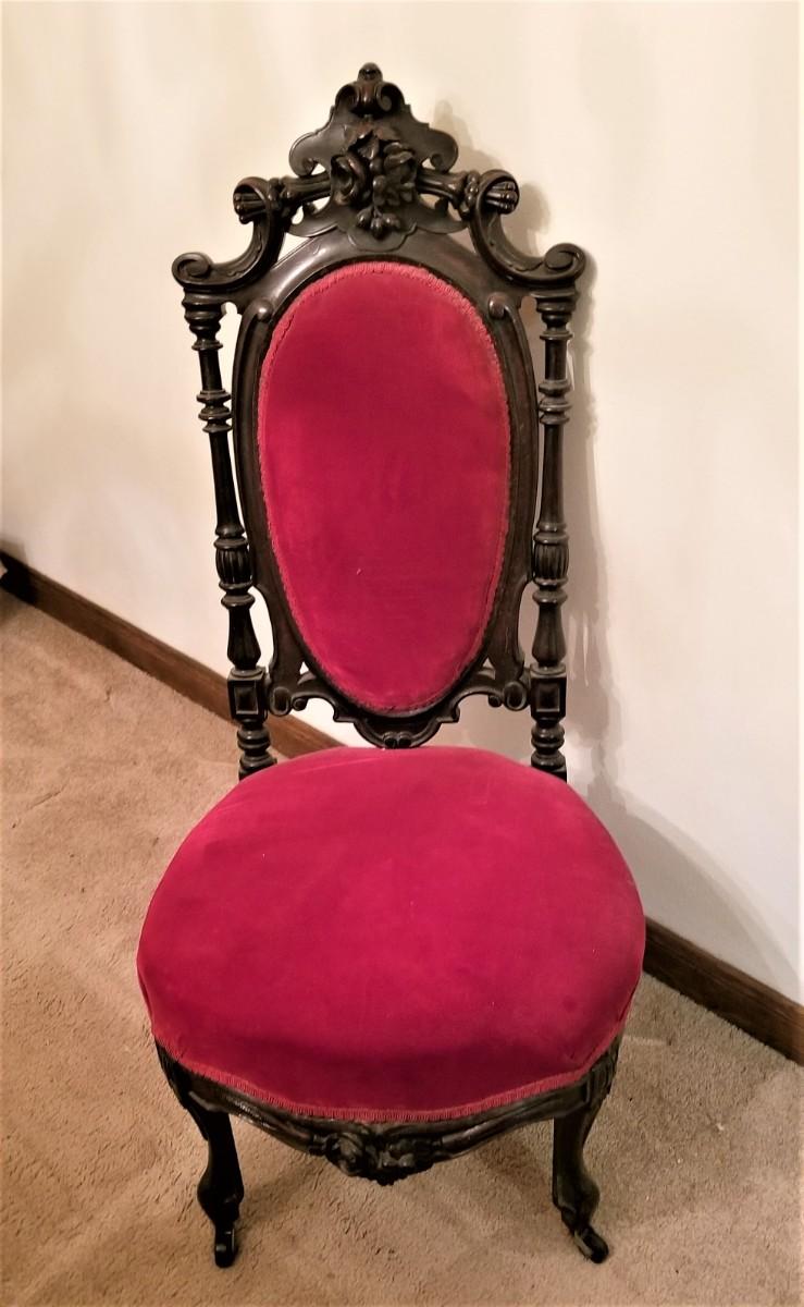 I think this Victorian parlor chair is one of the prettiest antiques in the sale - ca. 1880, clean and sturdy. Original castors on the front. 41" tall, 18.5" across, 16" deep. Very nice condition - a real beaity.