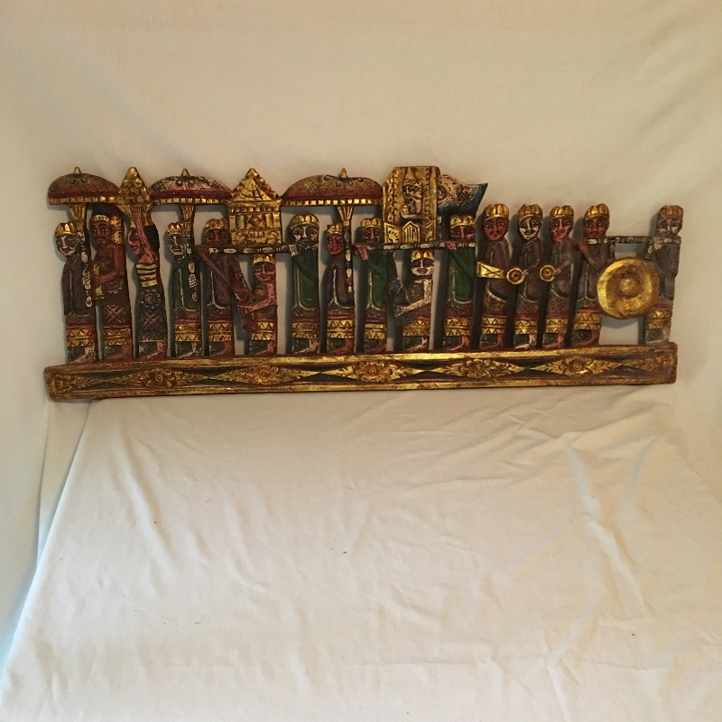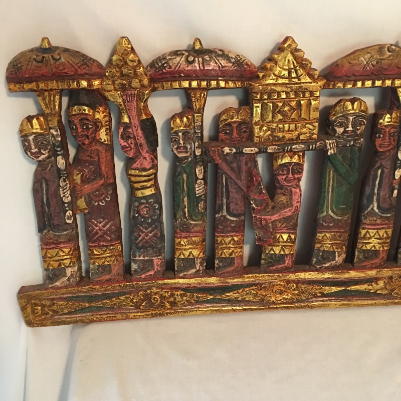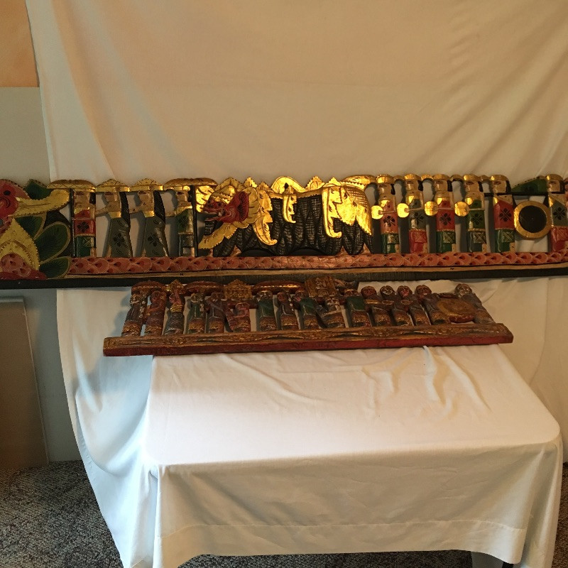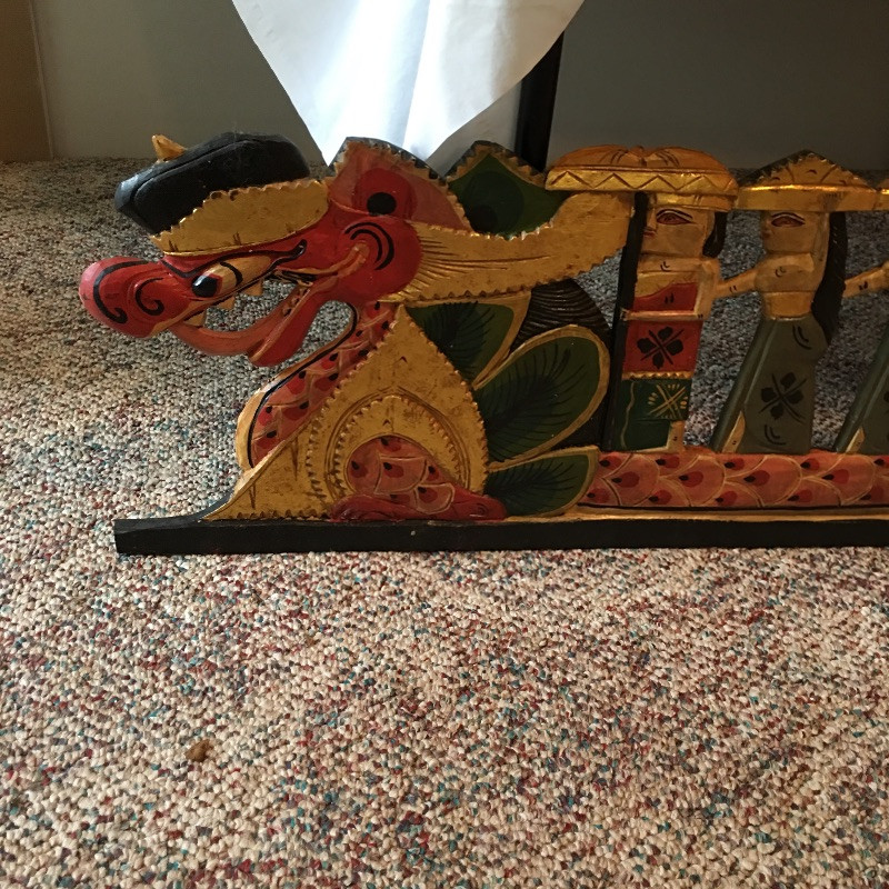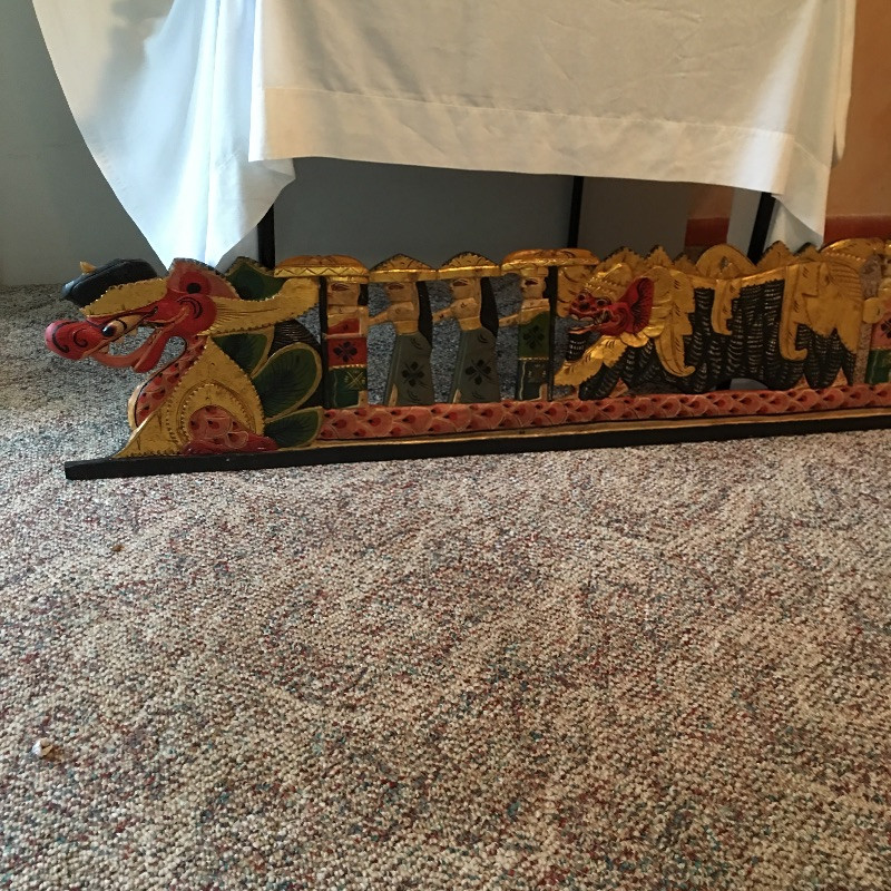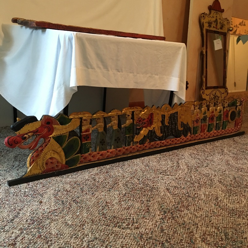 Two carved and painted pieces of wall art. The larger piece is from Indonesia and depicts a dragon and the smaller piece is unmarked. Great conversation starters for any room in your home. Largest piece measures 12.5” x 75”.