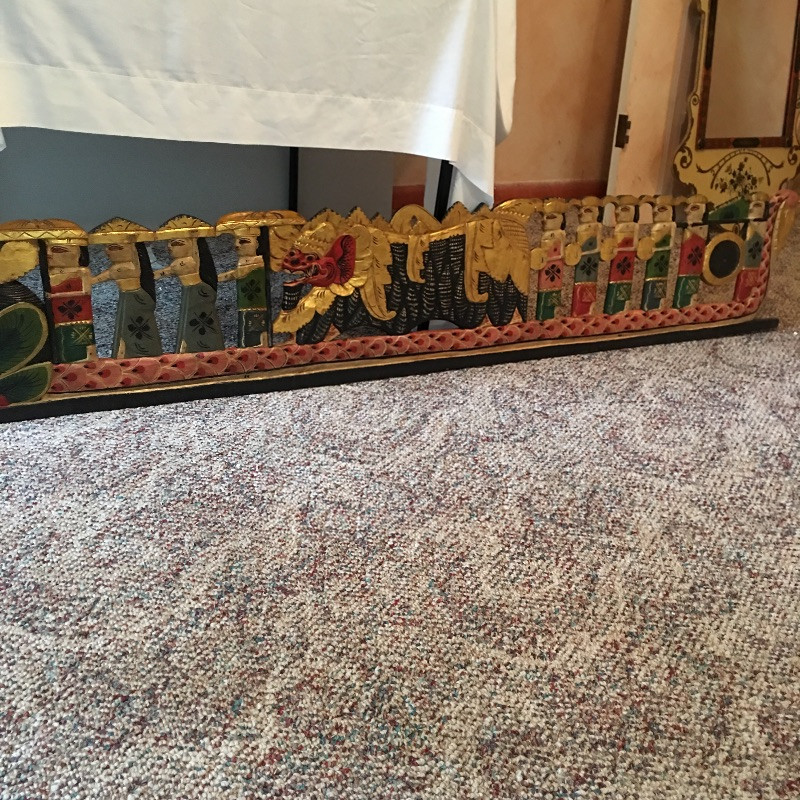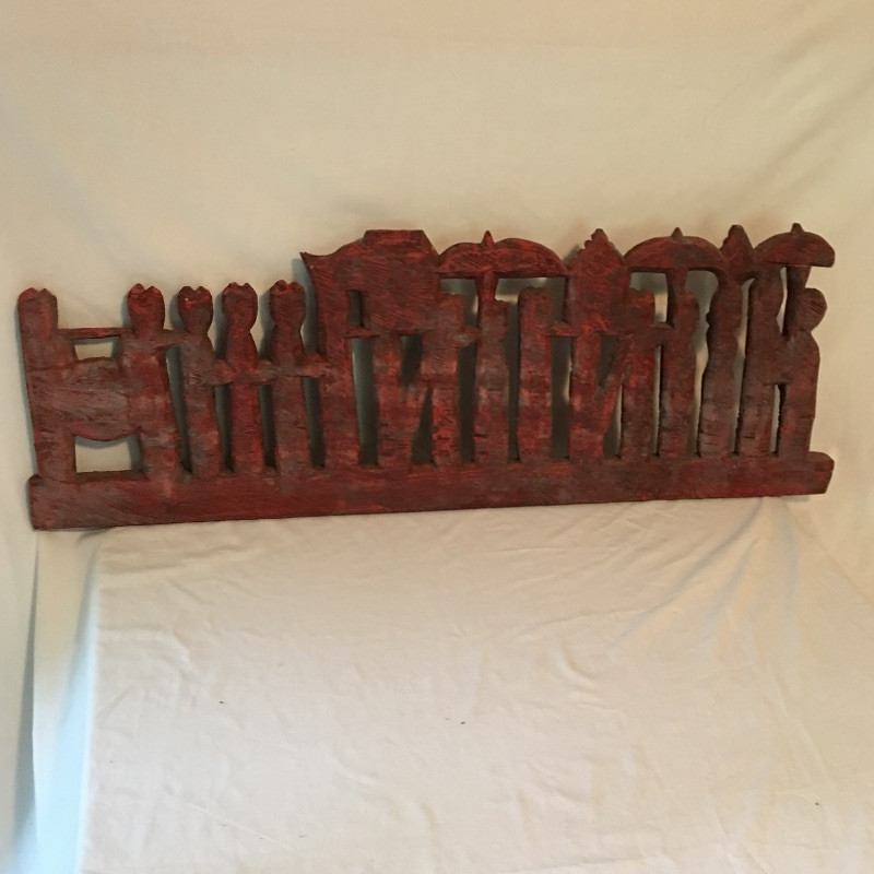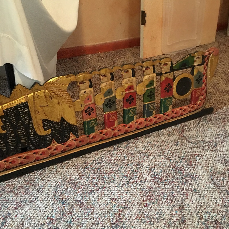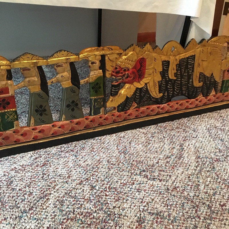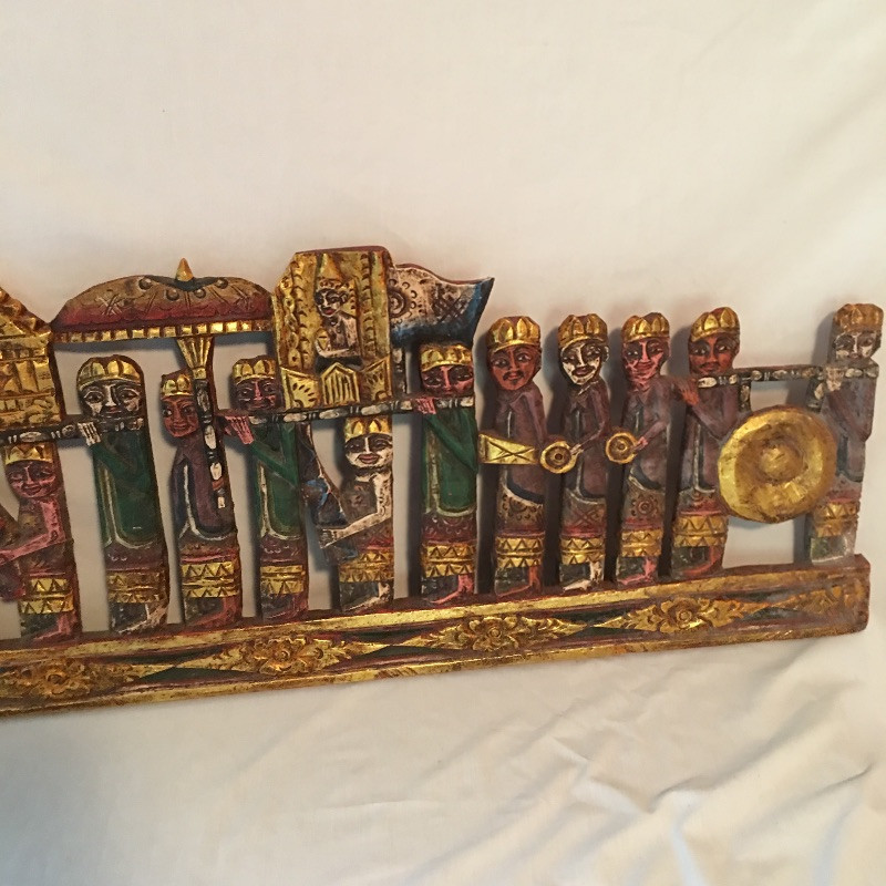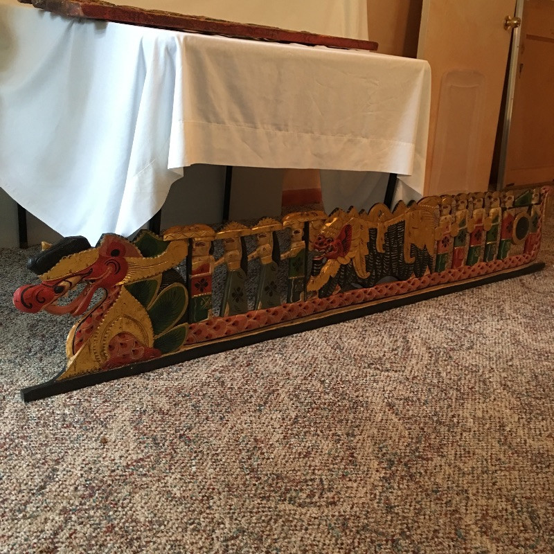 Two carved and painted pieces of wall art. The larger piece is from Indonesia and depicts a dragon and the smaller piece is unmarked. Great conversation starters for any room in your home. Largest piece measures 12.5” x 75”.