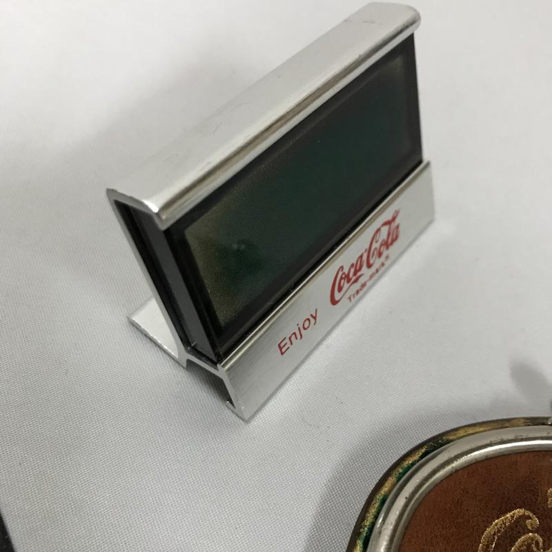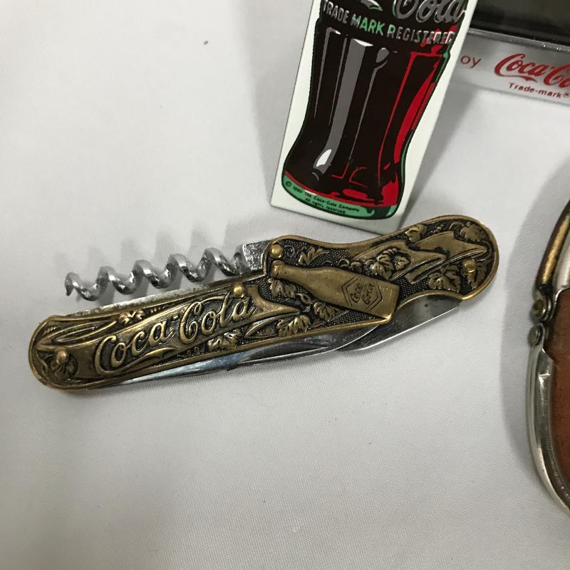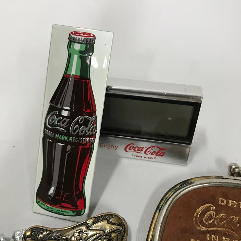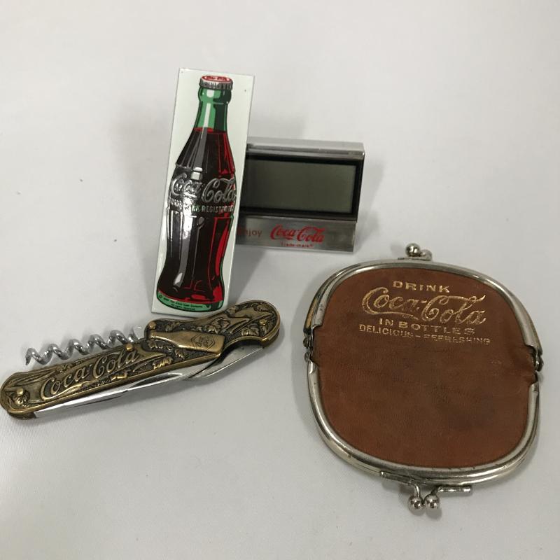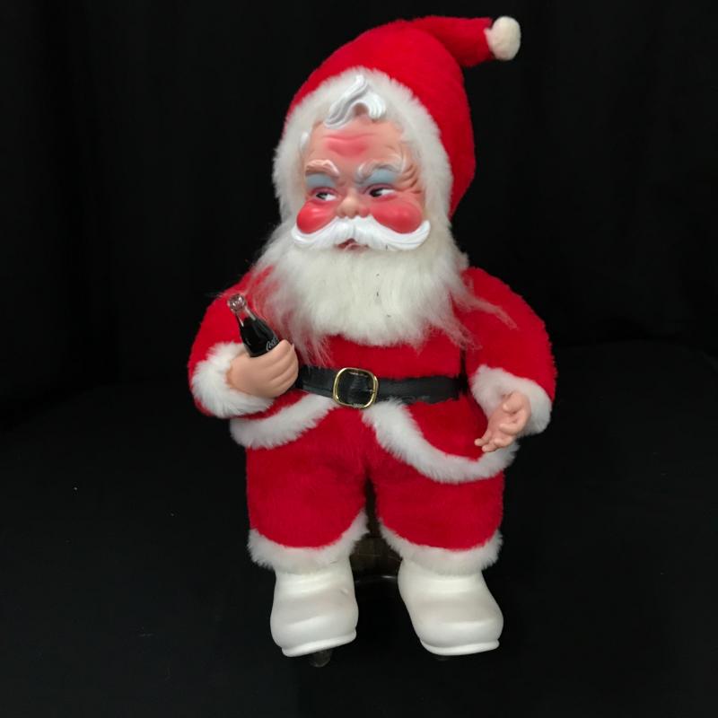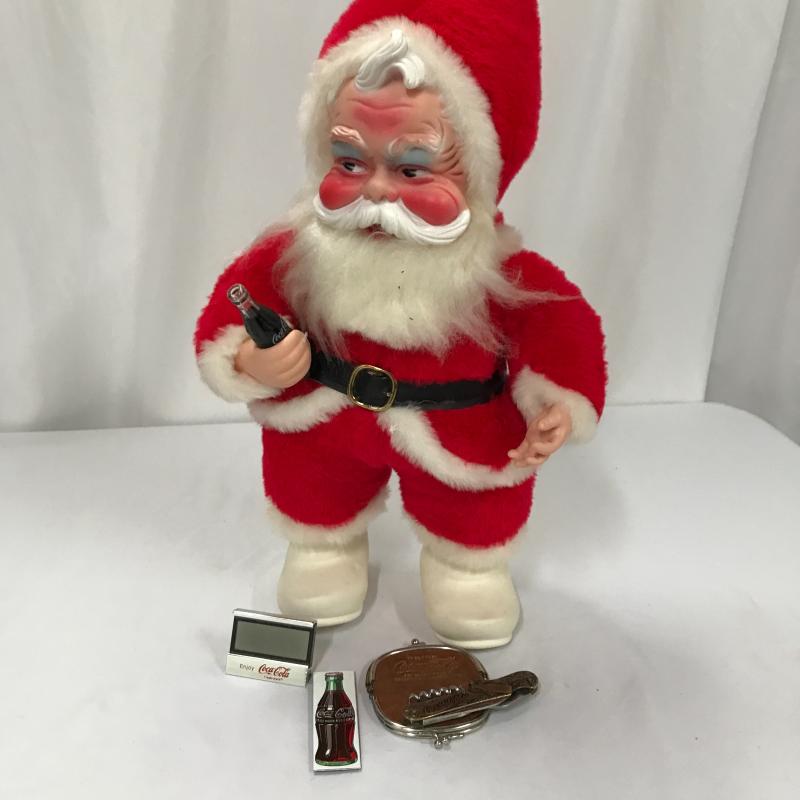 Collectible Standing Santa with Coca Cola bottle in his hand. Great mischievous facial expression. In excellent condition. Stands 17” tall. Lot also includes Coke leather change purse, pocket knife, magnet and clock. Shipping or local pick up in Asheville