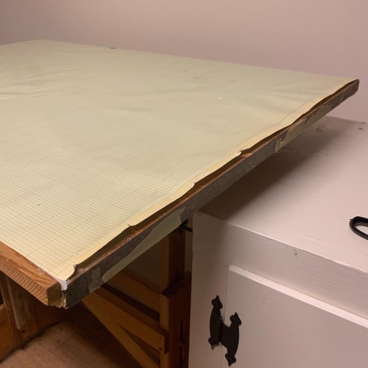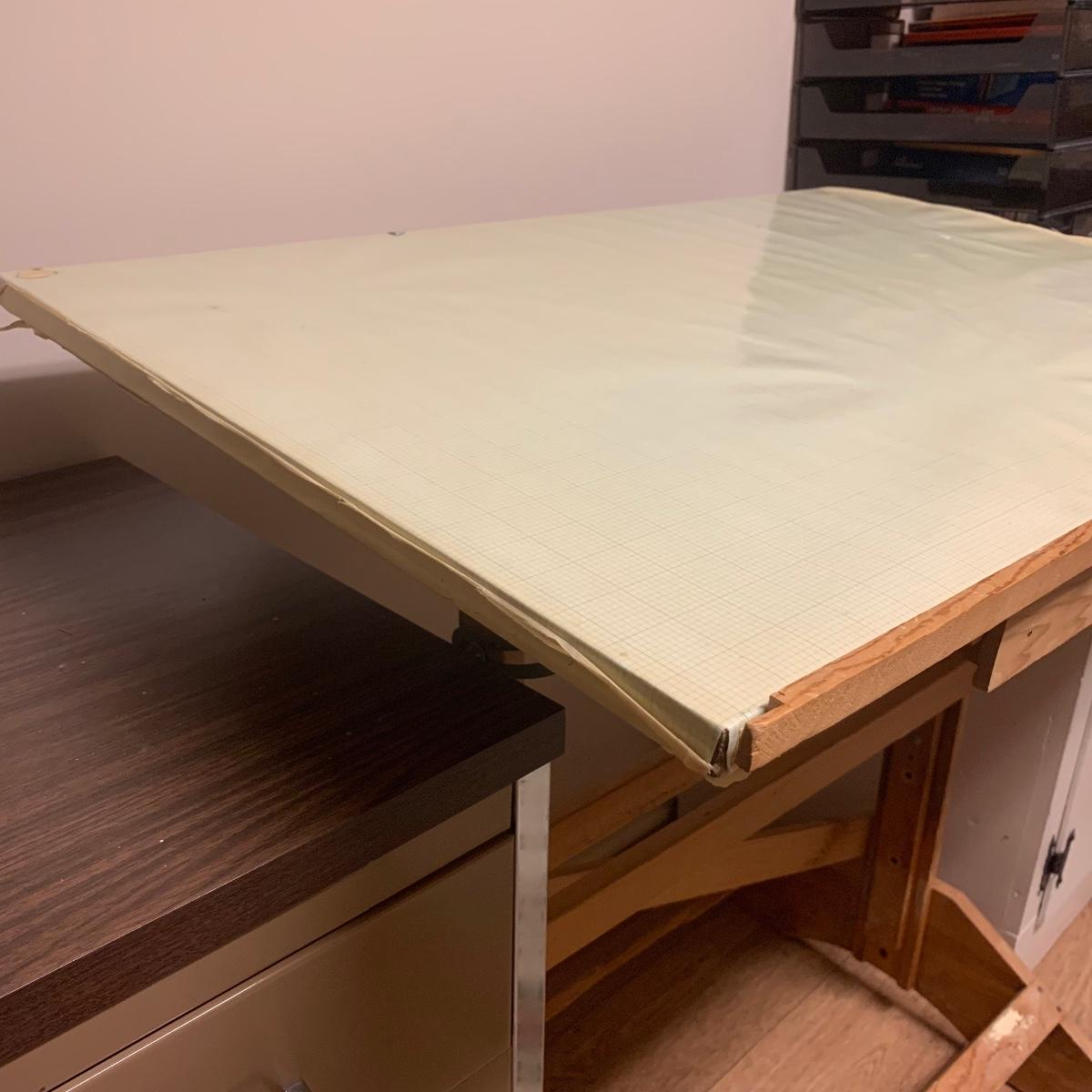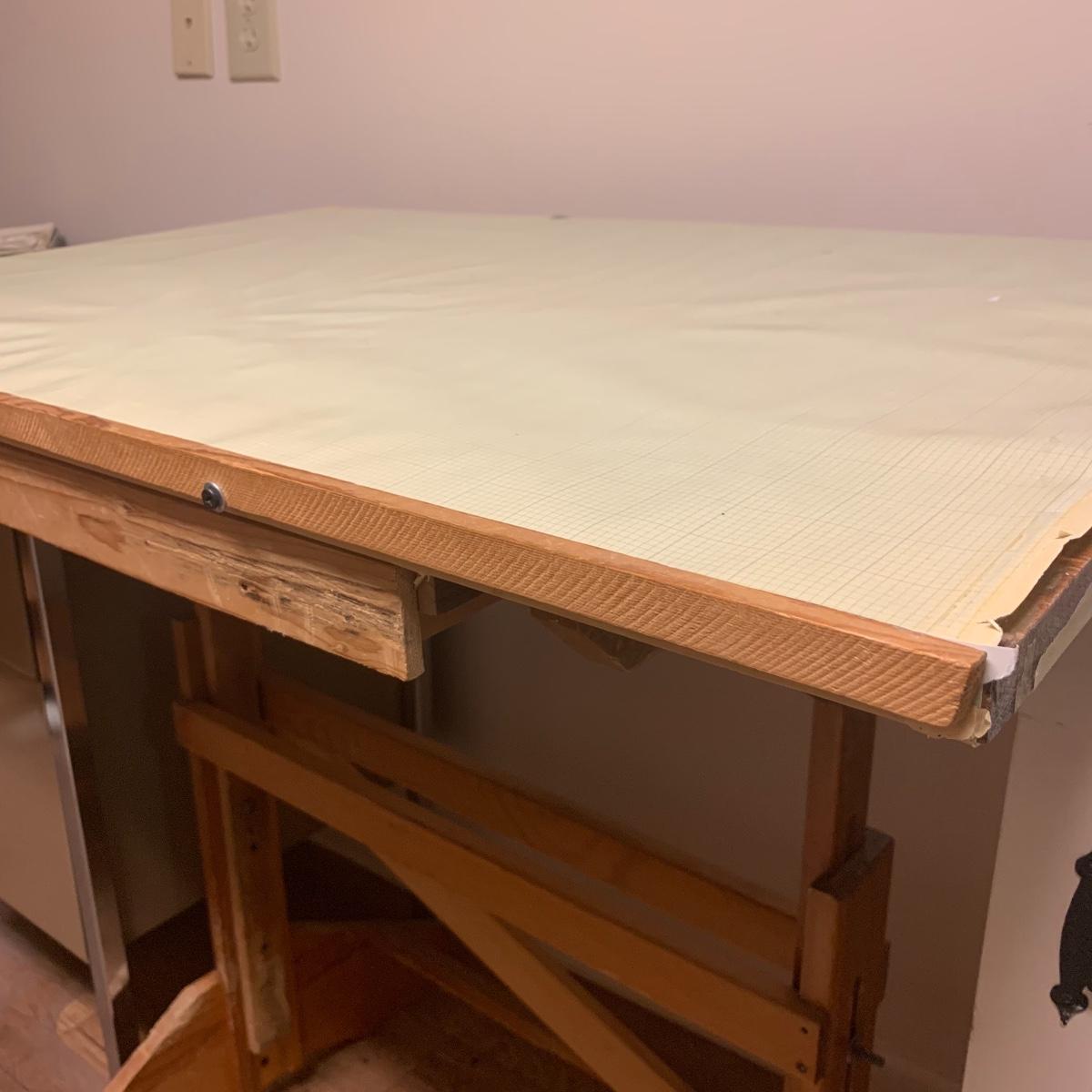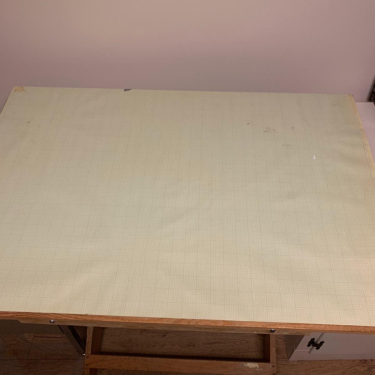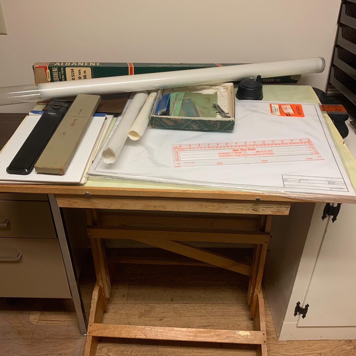 This lot includes one wooden drafting table, drafting paper, drafting rulers and protractors, sketch pads, drawing leads, and more. The table is by the brand Portal and measures about 24in x 36in. The table has chips and scratches in the wood on the base and currently has a piece of grid paper secured and protecting the wooden surface. Local pick up only.