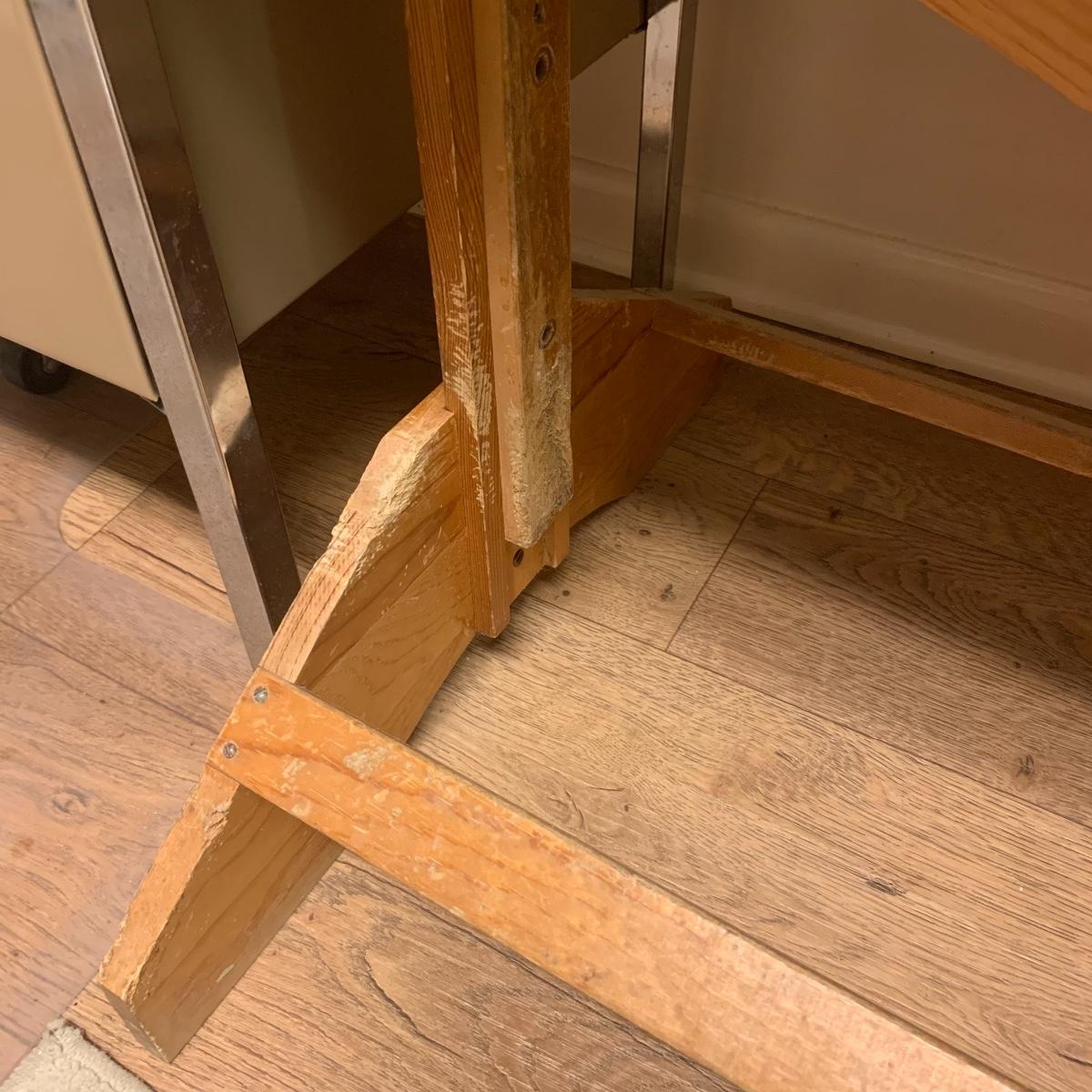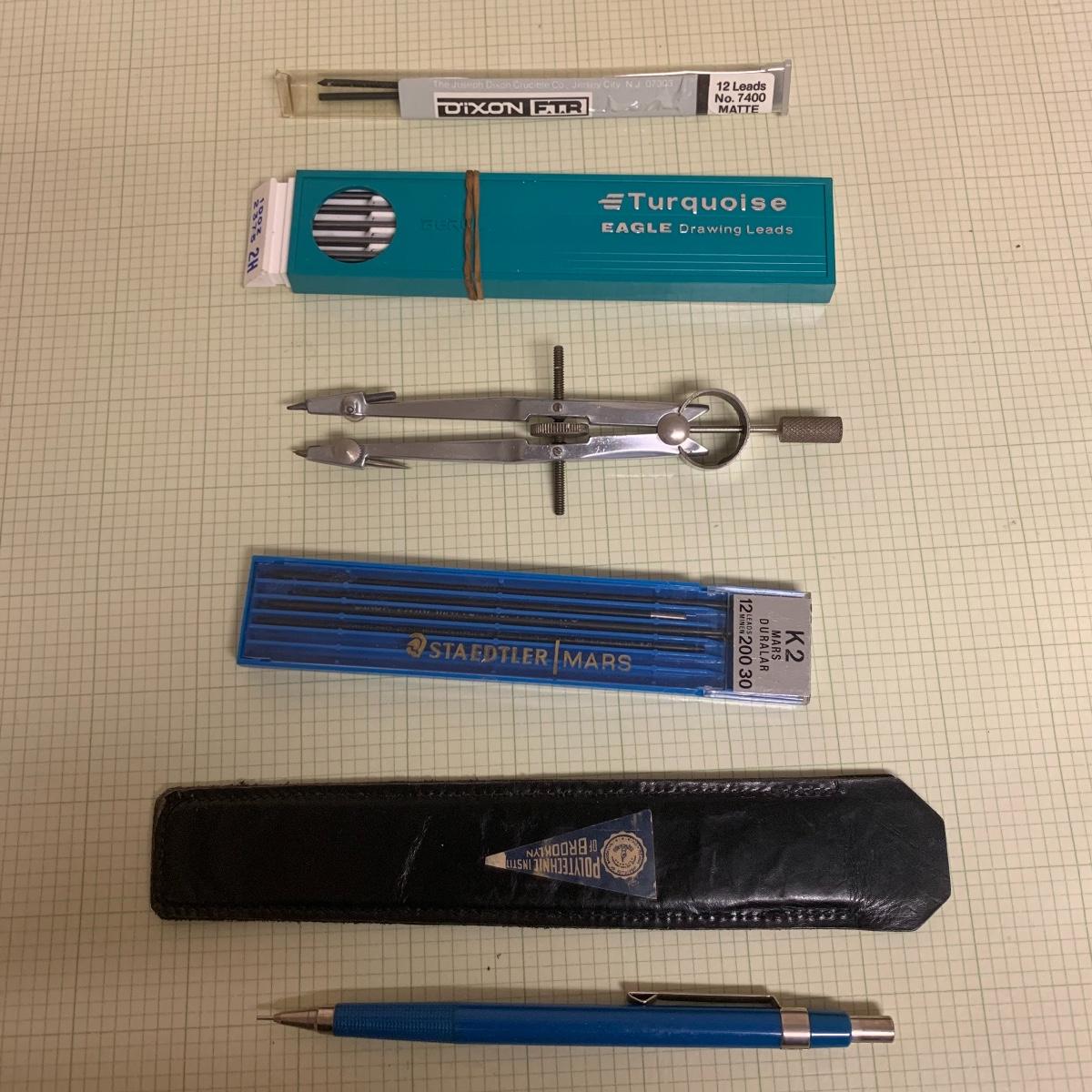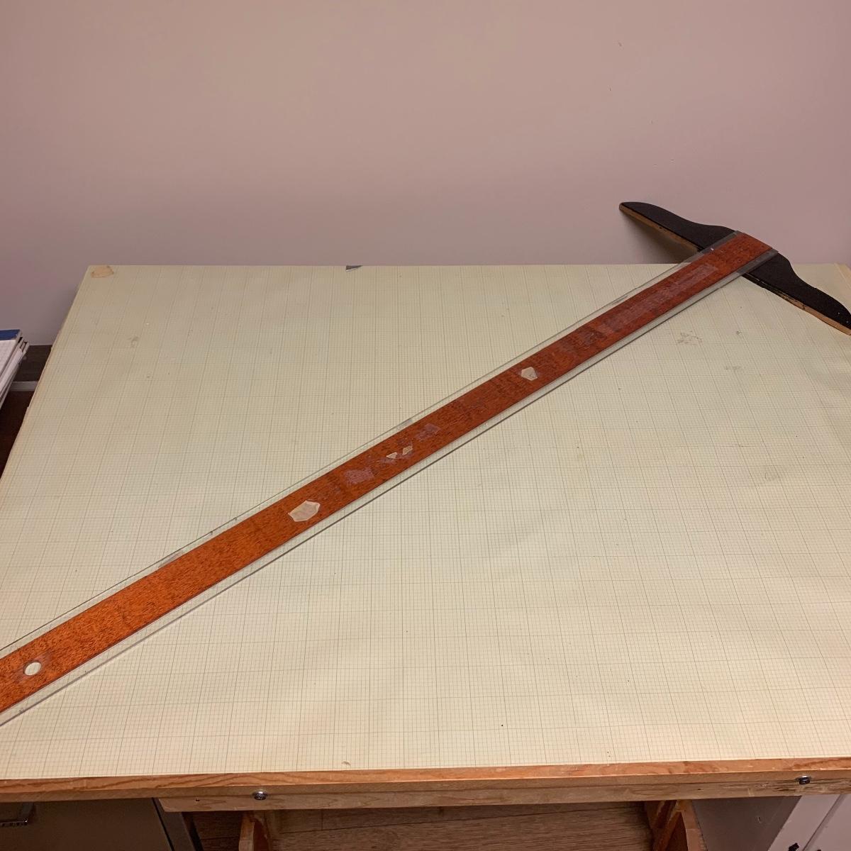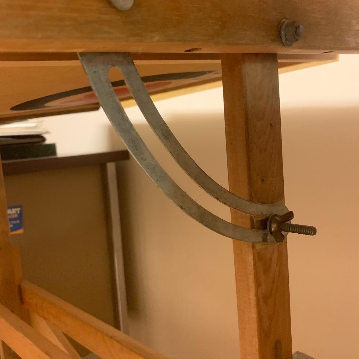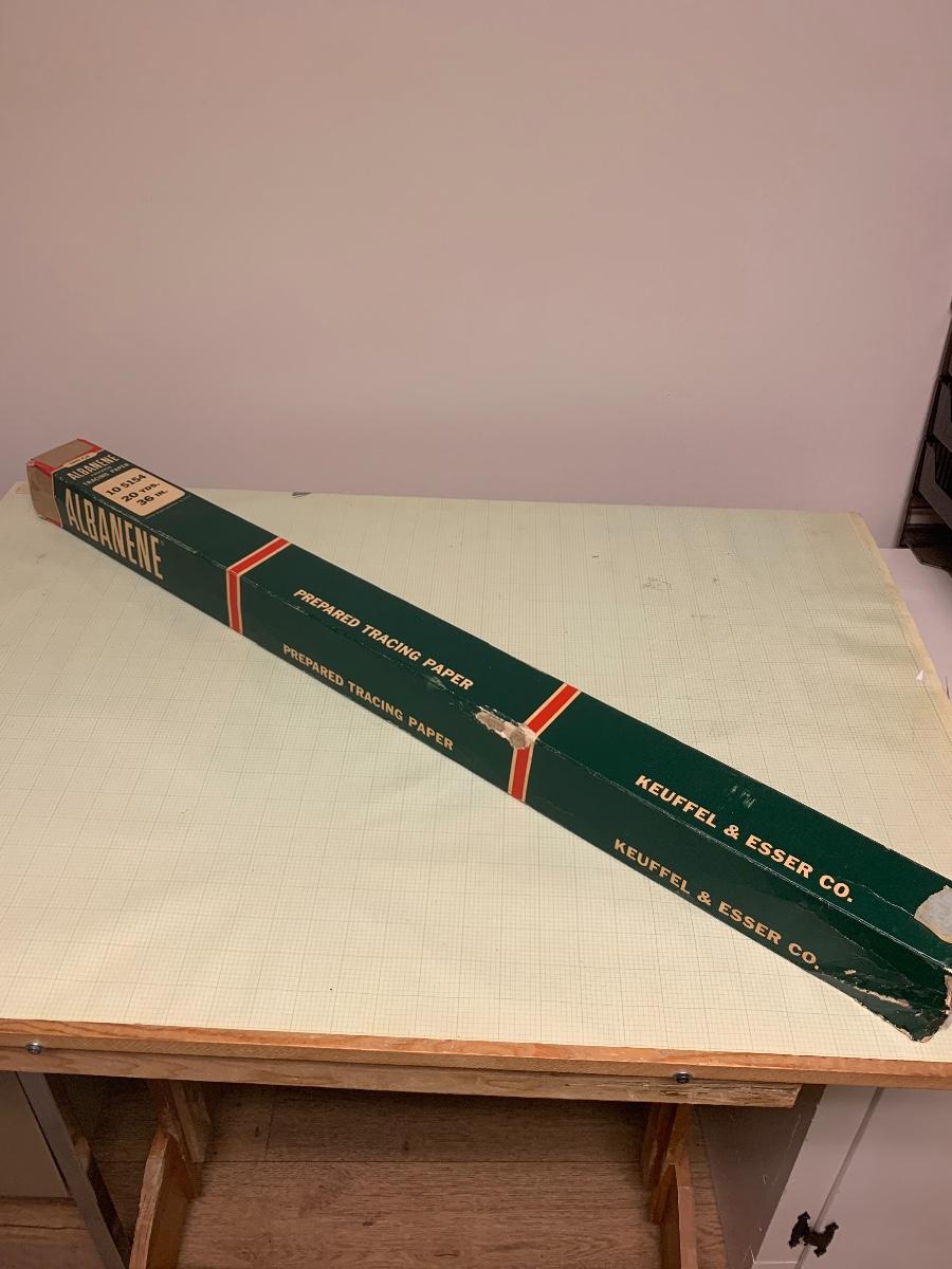This lot includes one wooden drafting table, drafting paper, drafting rulers and protractors, sketch pads, drawing leads, and more. The table is by the brand Portal and measures about 24in x 36in. The table has chips and scratches in the wood on the base and currently has a piece of grid paper secured and protecting the wooden surface. Local pick up only.