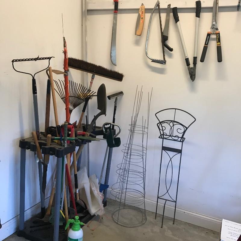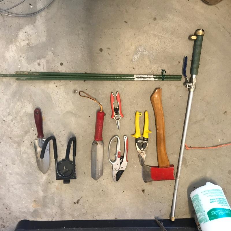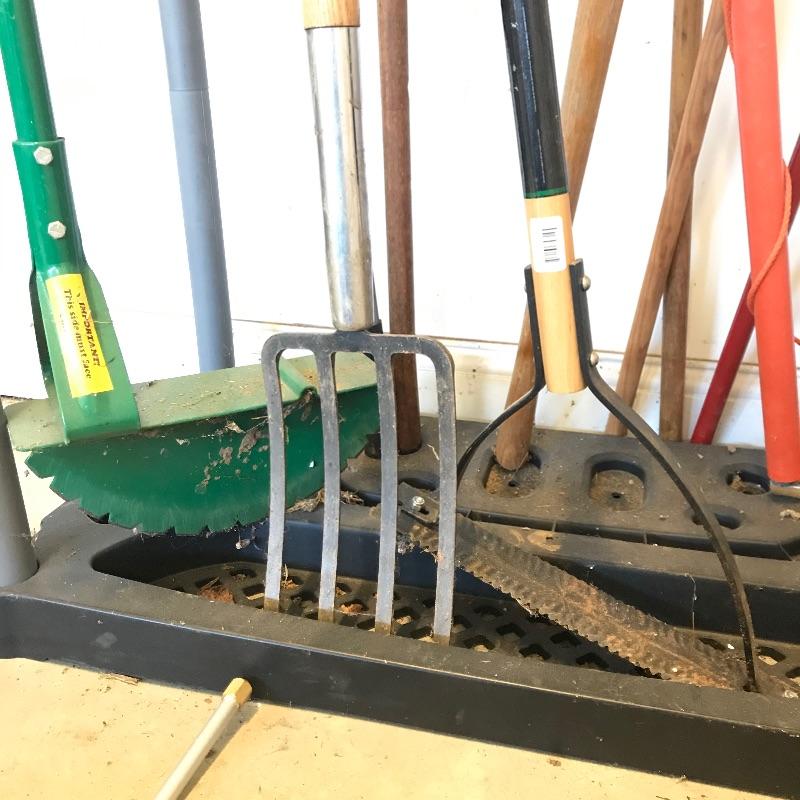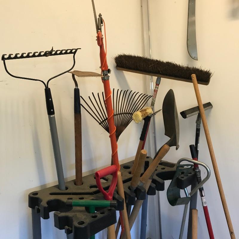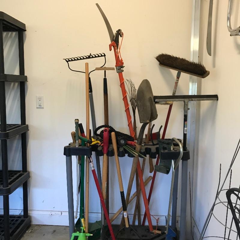 This lot has it all!! Rakes, shovels, saws, sprayer with nozzle, tomato fences and more! Heavy duty plastic stand included, to keep your tools organized, measures approximately 35” x 18” x 35”. Lot also includes a metal bulb planter, squeegees, shears, a machete and more. See photos. No shipping.