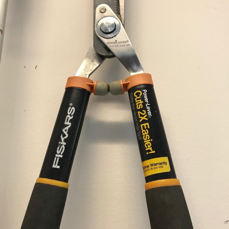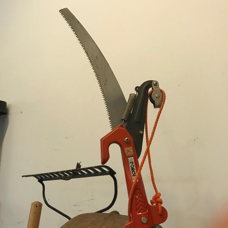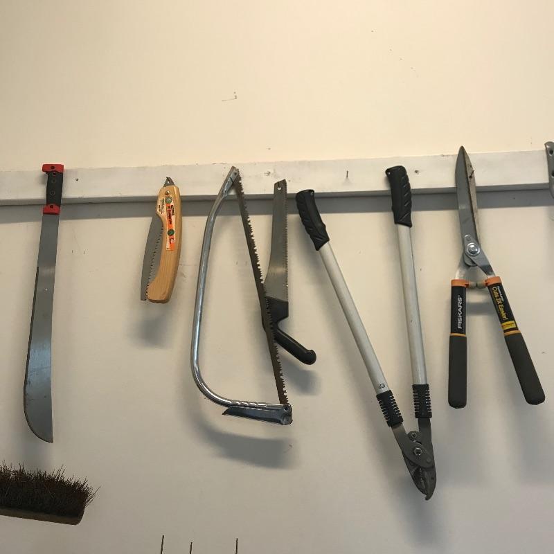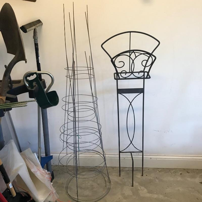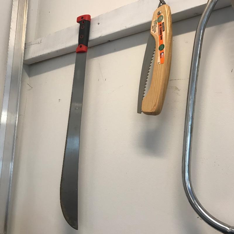 This lot has it all!! Rakes, shovels, saws, sprayer with nozzle, tomato fences and more! Heavy duty plastic stand included, to keep your tools organized, measures approximately 35” x 18” x 35”. Lot also includes a metal bulb planter, squeegees, shears, a machete and more. See photos. No shipping.