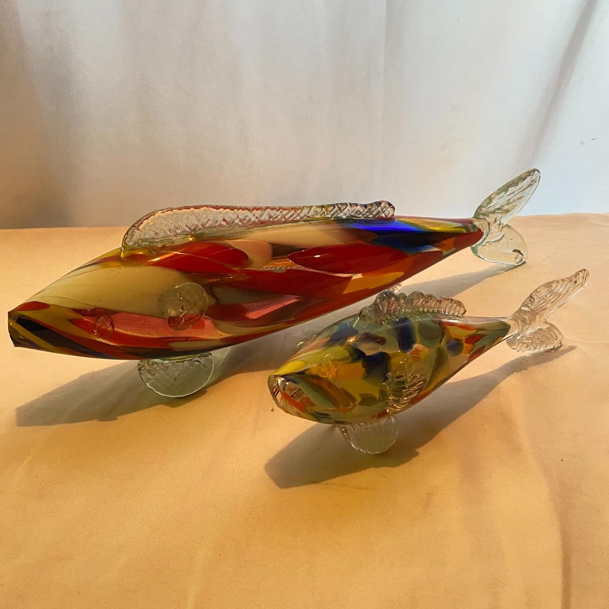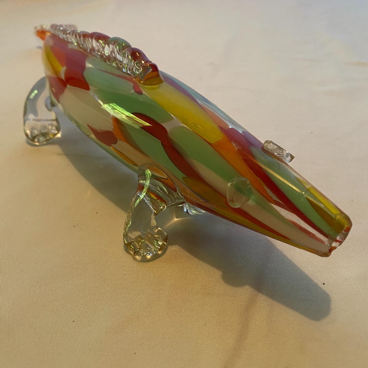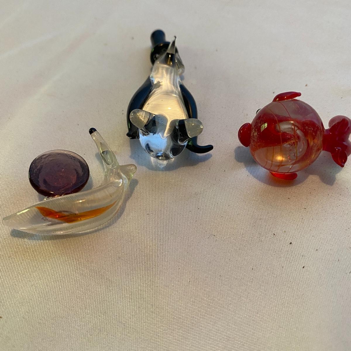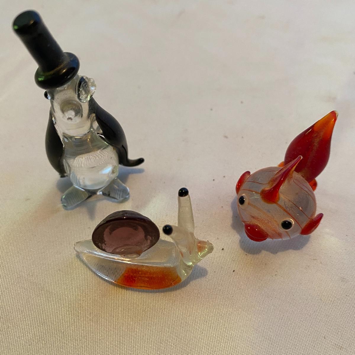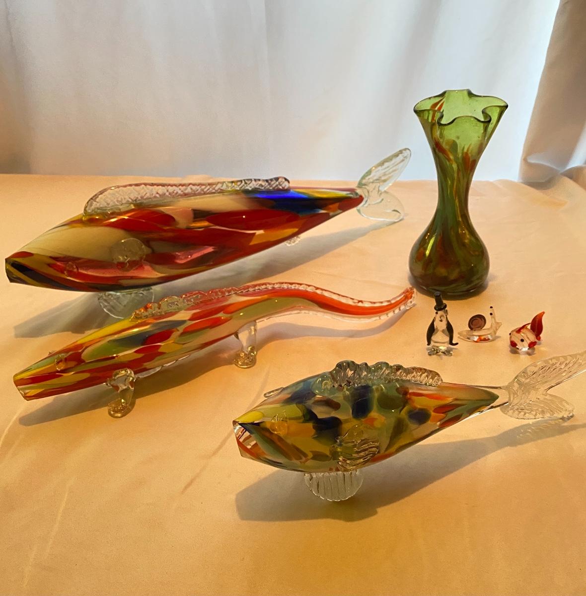 Here we have three lovely large colorful glass fish (one is a bit more like a salamander). Three have open mouths. Please note the large fish has a chip on the underneath of its’ mouth. Also included are a glass vase with green tones and three small figures about an inch tall. Shipping available.