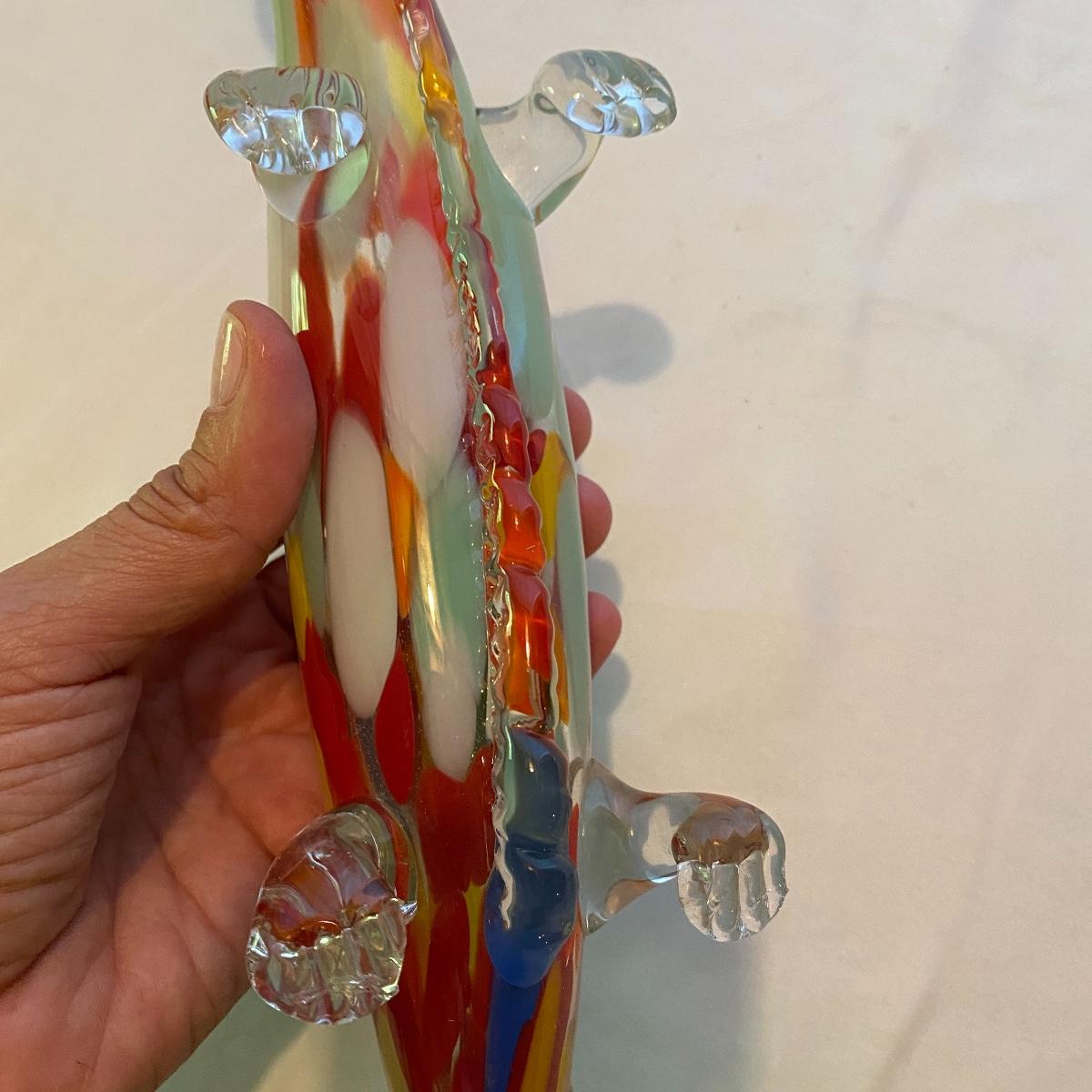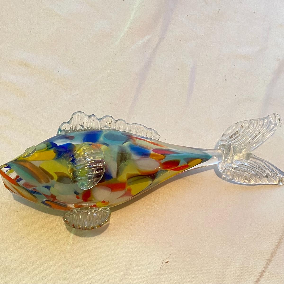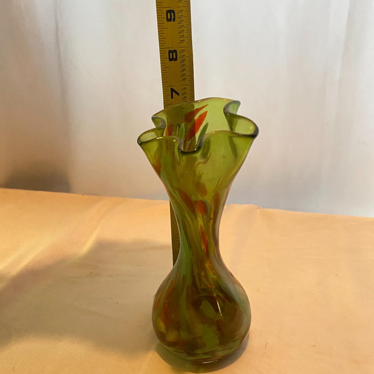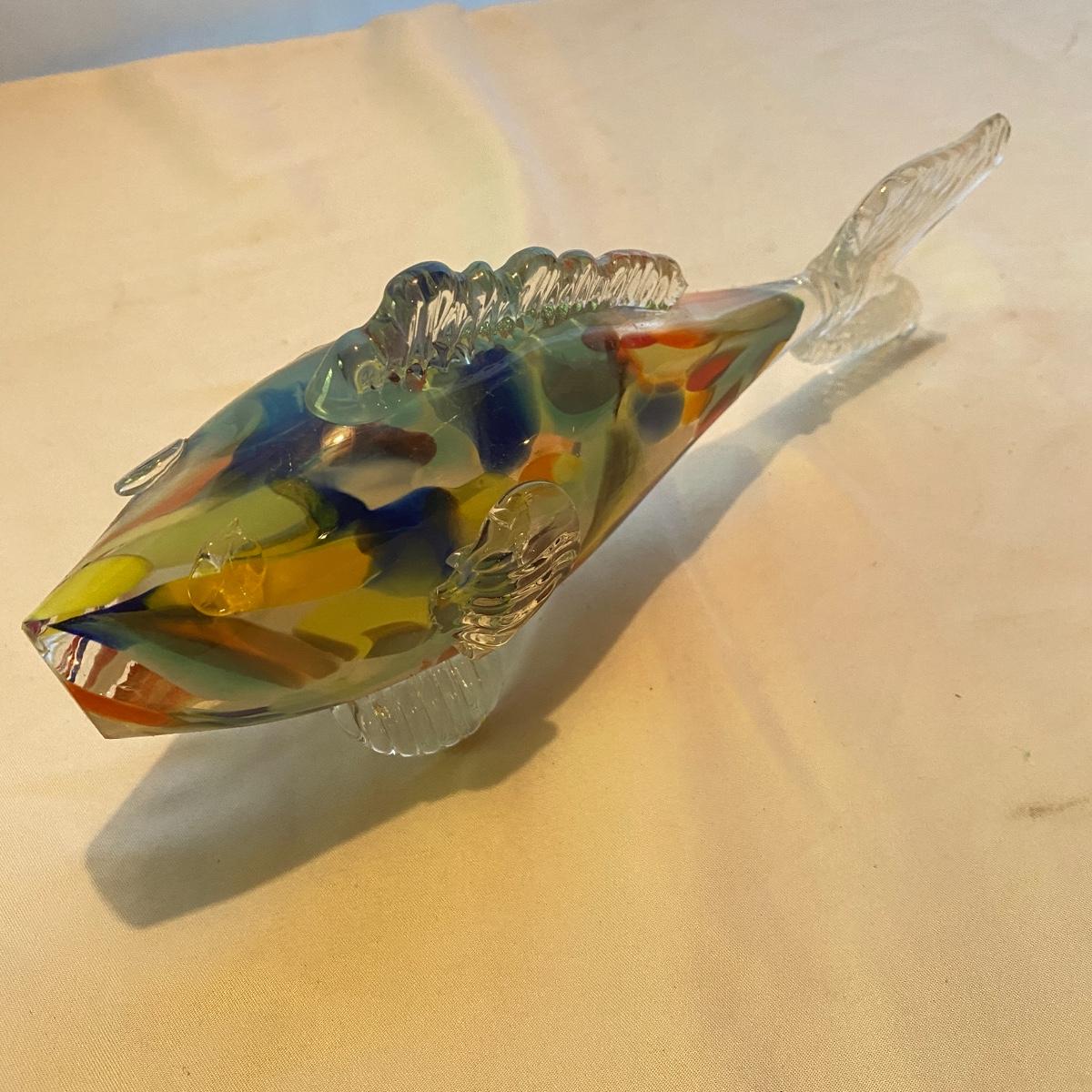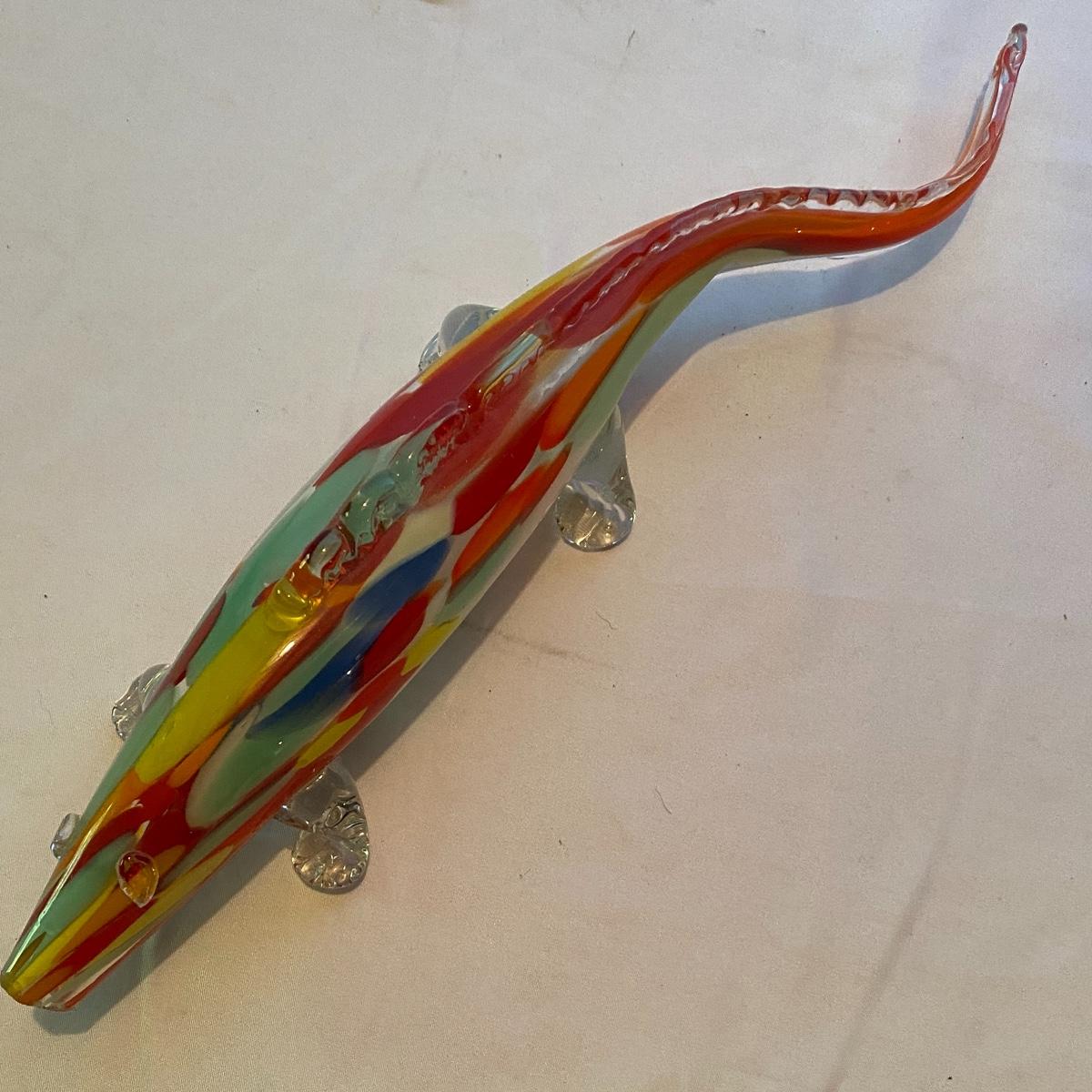 Here we have three lovely large colorful glass fish (one is a bit more like a salamander). Three have open mouths. Please note the large fish has a chip on the underneath of its’ mouth. Also included are a glass vase with green tones and three small figures about an inch tall. Shipping available.
