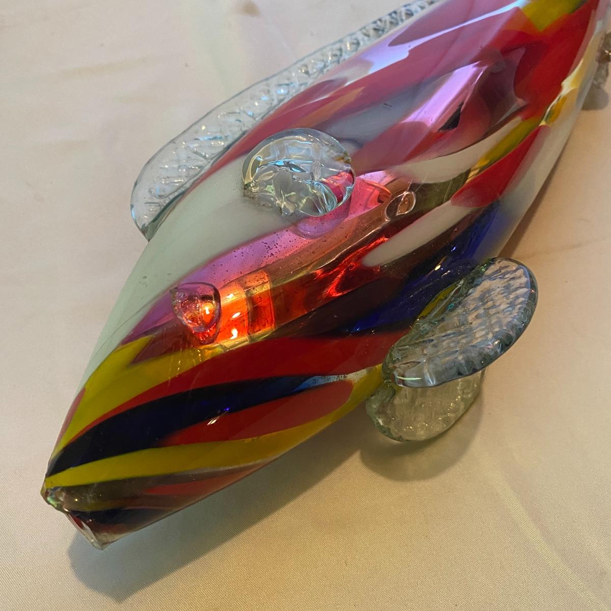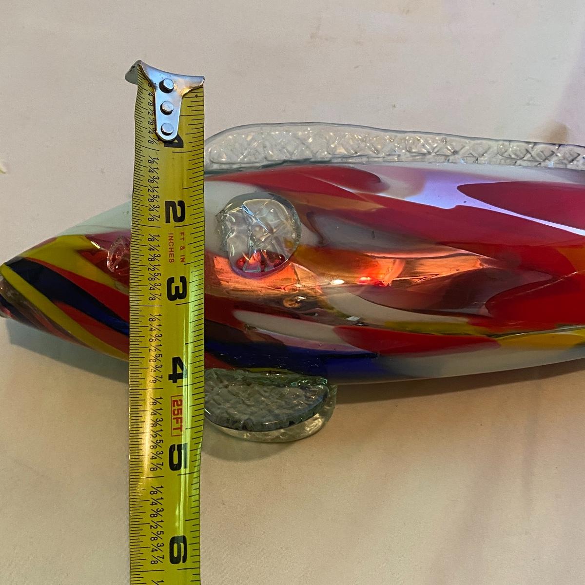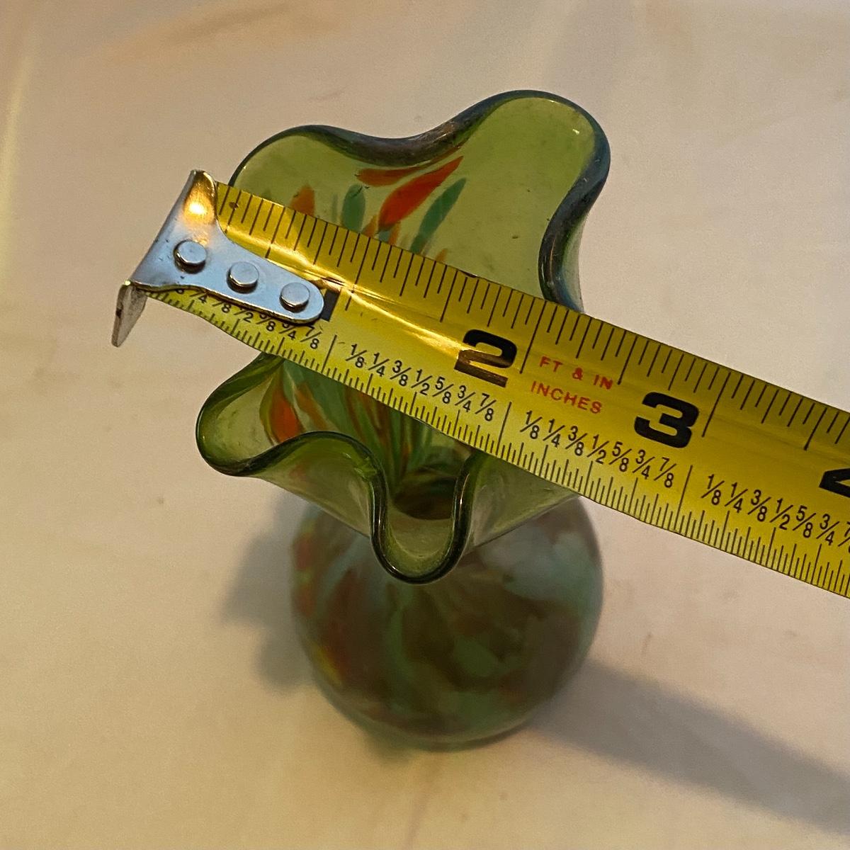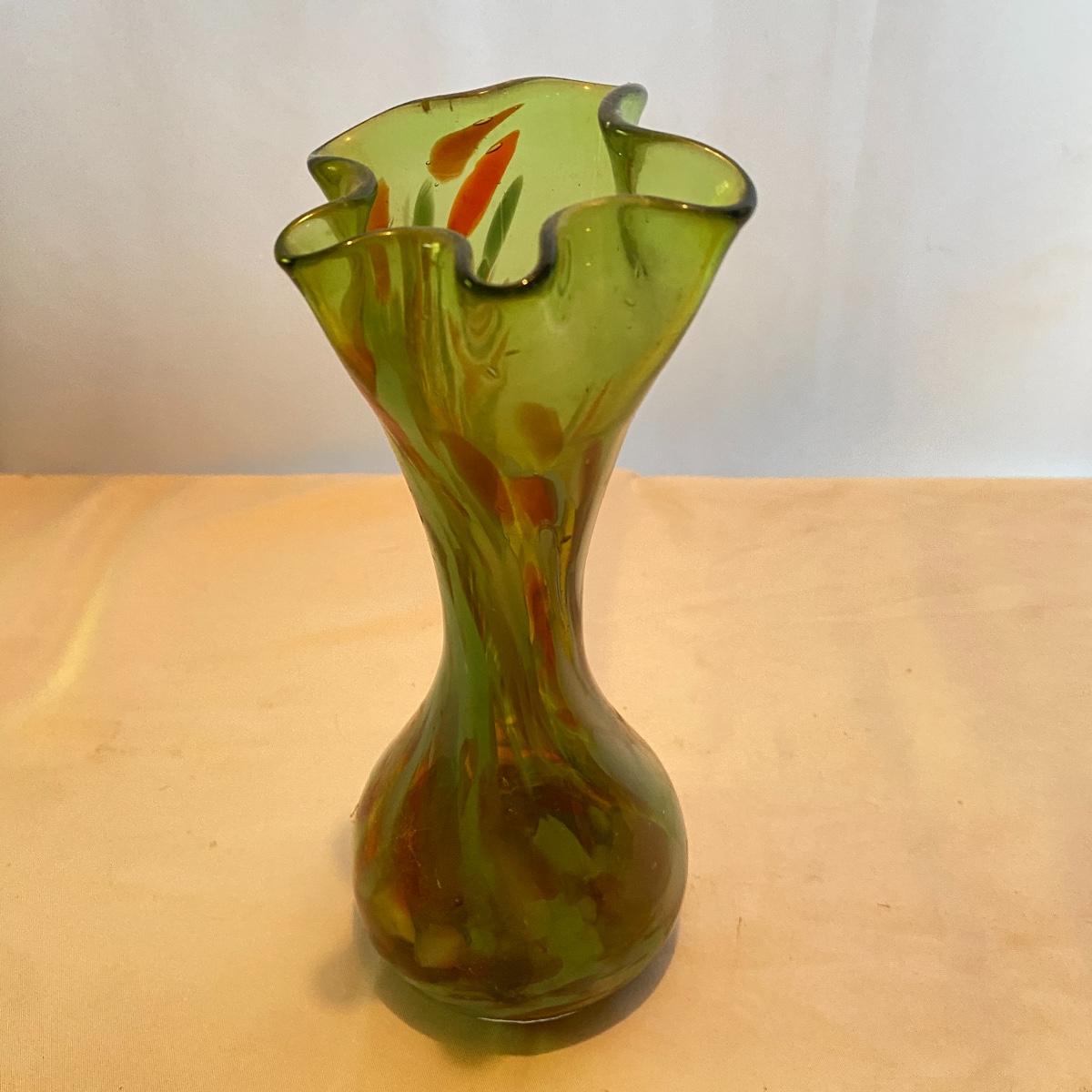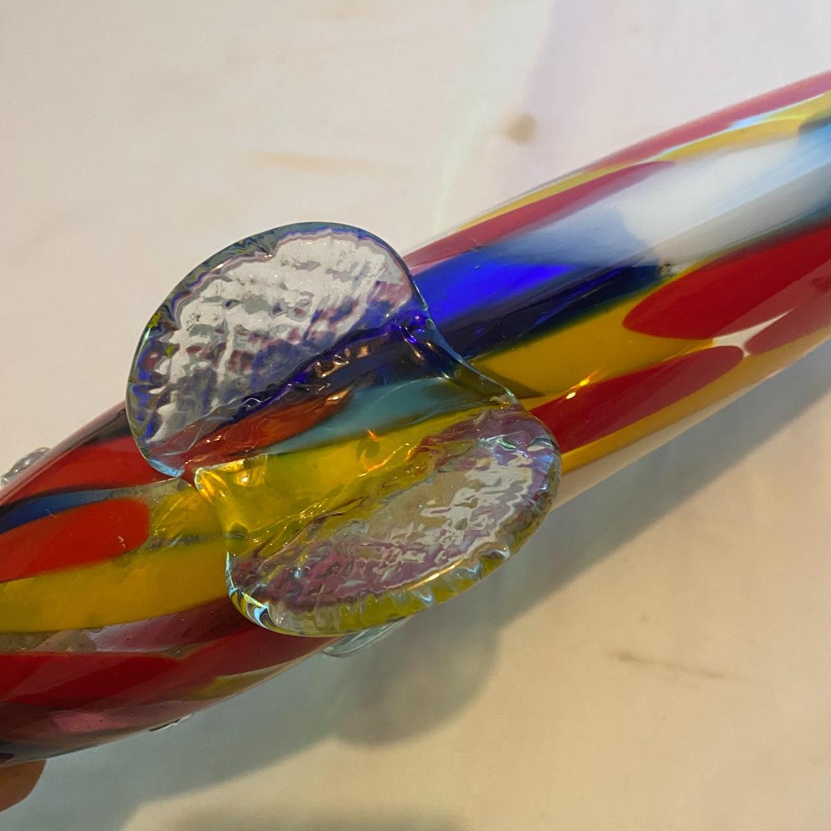 Here we have three lovely large colorful glass fish (one is a bit more like a salamander). Three have open mouths. Please note the large fish has a chip on the underneath of its’ mouth. Also included are a glass vase with green tones and three small figures about an inch tall. Shipping available.