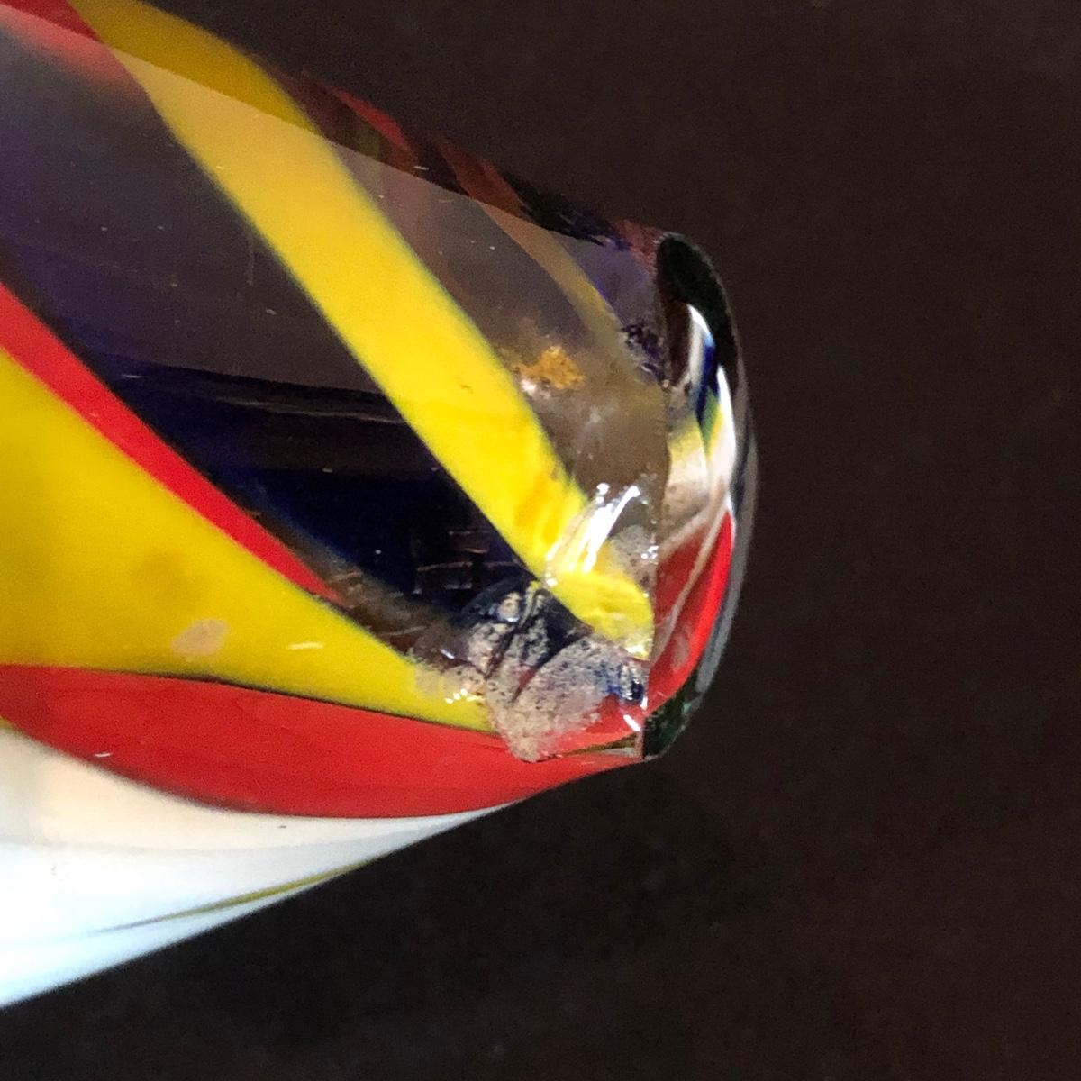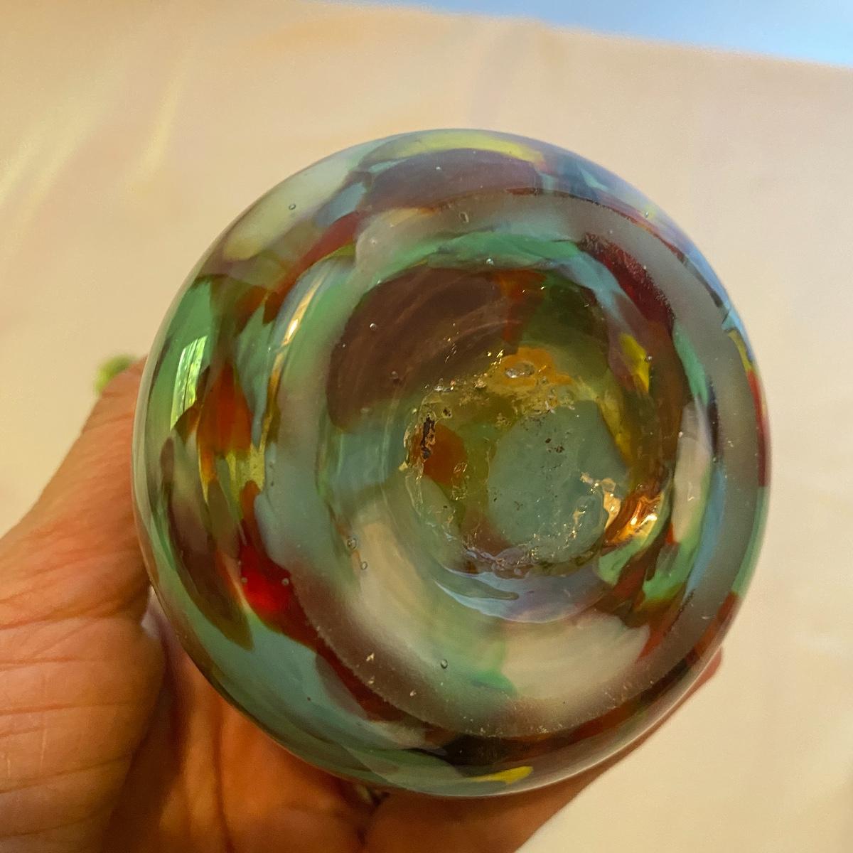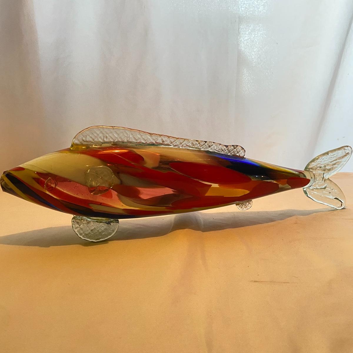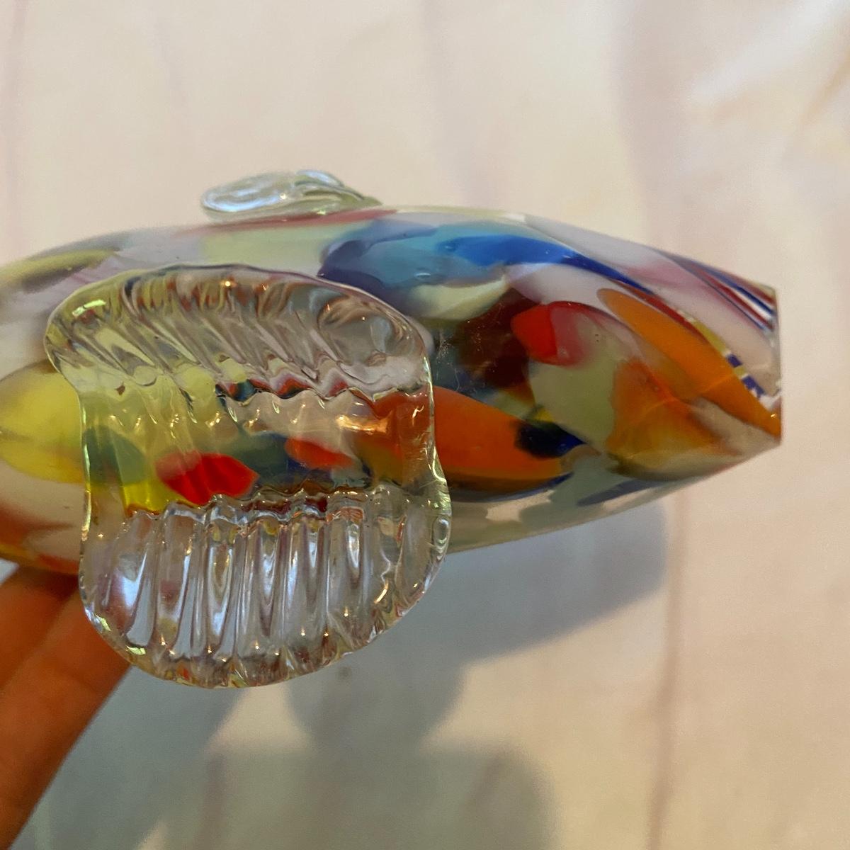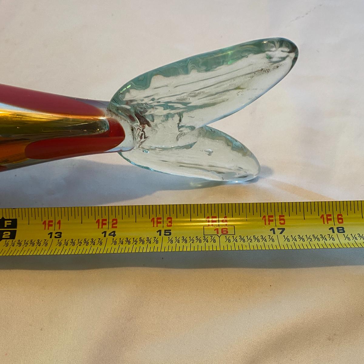 Here we have three lovely large colorful glass fish (one is a bit more like a salamander). Three have open mouths. Please note the large fish has a chip on the underneath of its’ mouth. Also included are a glass vase with green tones and three small figures about an inch tall. Shipping available.