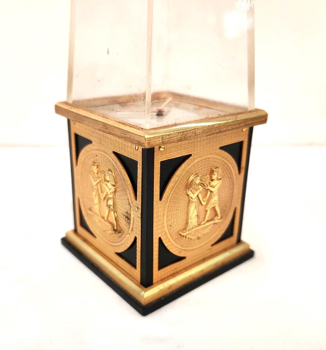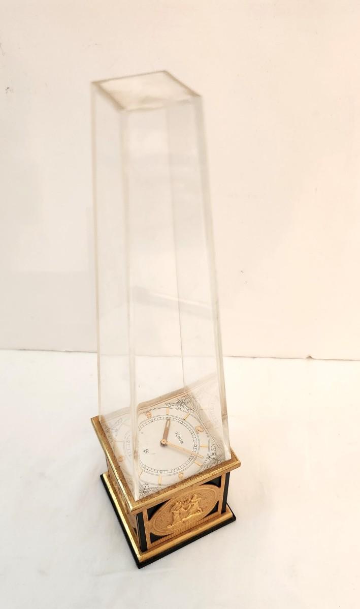 Obelisk Style Jeager LeCoultre Egyptian Revival Desk Clock - wind-up - WORKS. 8 day movement - Overall good condition with minor surface wear to plastic cover and surface on base through normal use. Trademarked on clock face. Their catalog refers to this clock as the "462 Obelisk." It was made for a relatively short time (70's). Note - the knob to make the clock run faster or slower on the bottom is missing. We have wound this hard to find clock several times and it appears to keep good time.