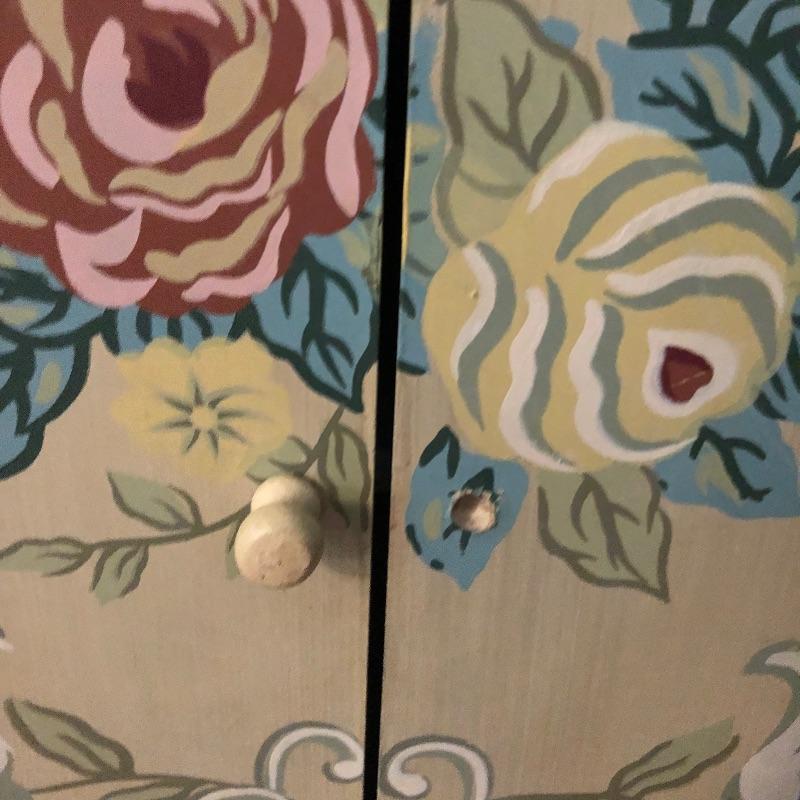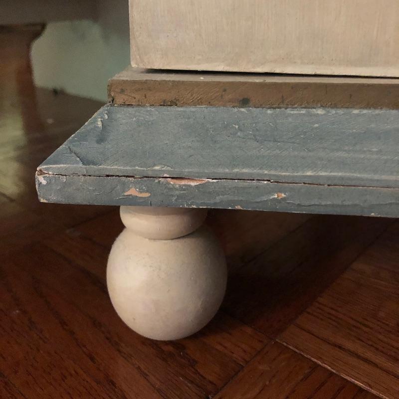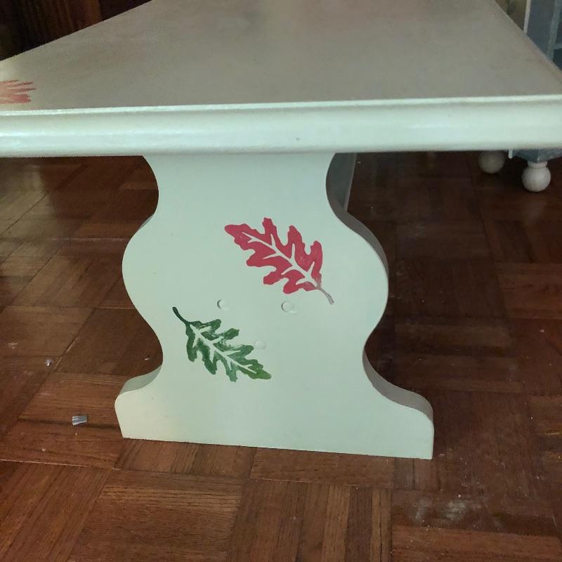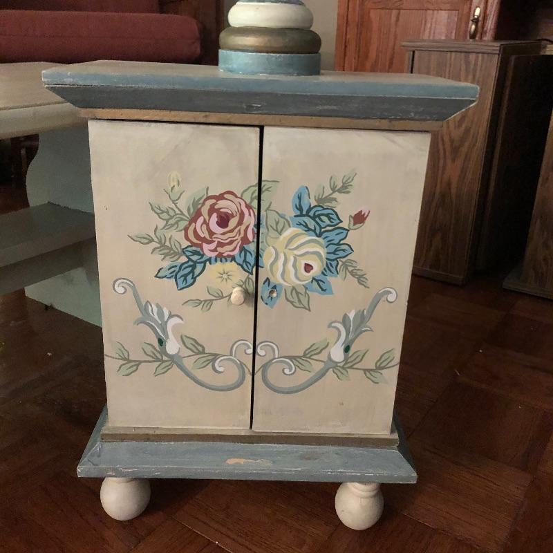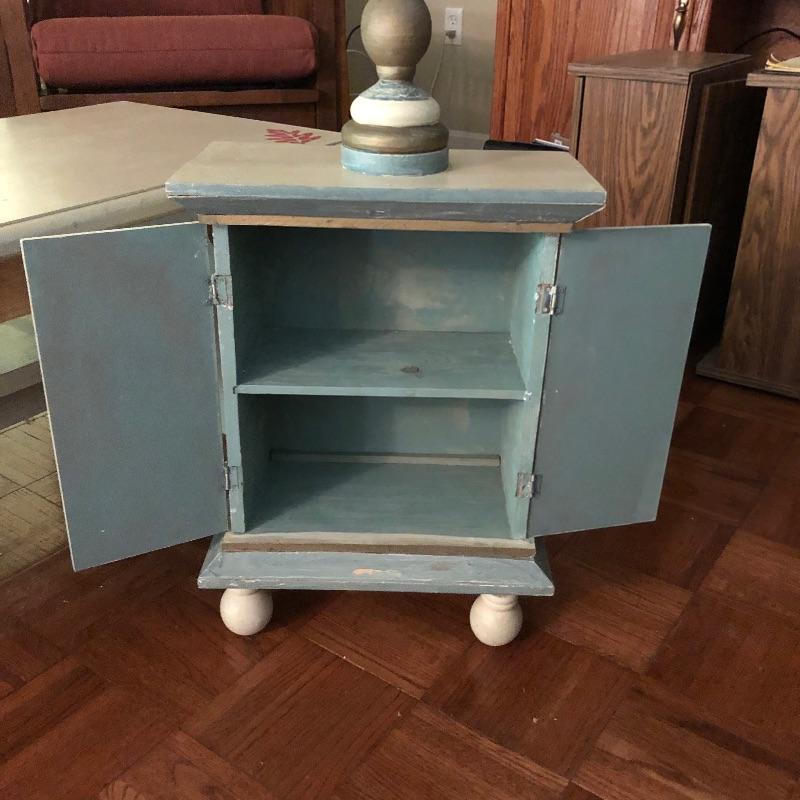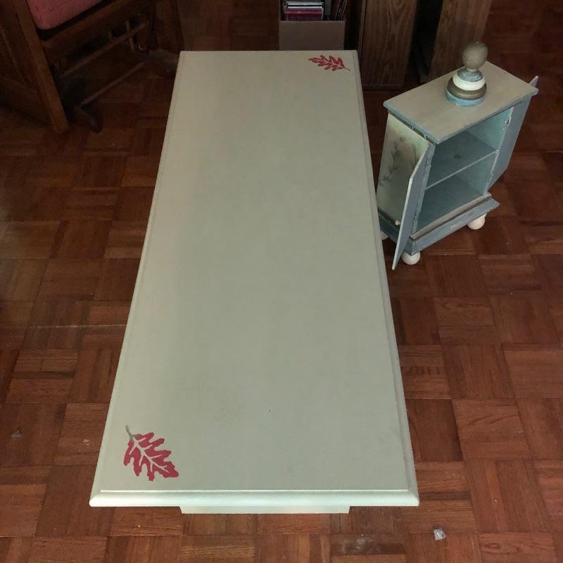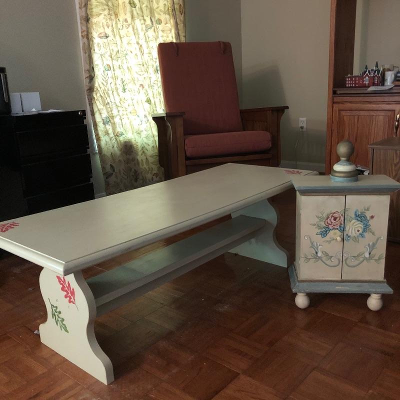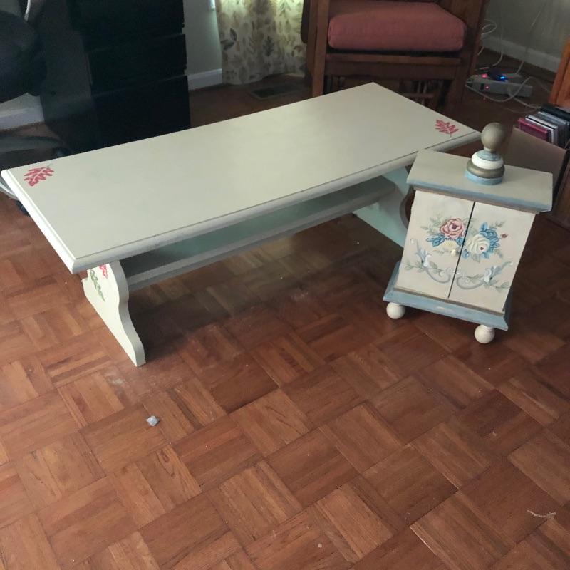 Quaint small decorative cabinet has a shabby chic vintage look to it. It is missing a knob and one of the legs has been glued back on. The coffee table has also been painted and measures 19.5” x 49” x 16”.