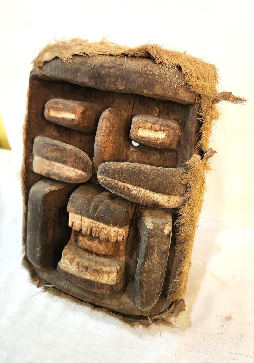 This scary carved Bete Guerre (Beast of War) wooden mask is covered with fur - dense wood - a therianthropormorphic face with lots of teeth - said to symbolize masculine strenghth - note the horns that meet in front and the Spider fangs around the mouth. This is a WAR mask, used ritually to prepare men for war and is supposed to cause dread in one's enemies. There is an accession/collection number on the reverse. Good antique condition.