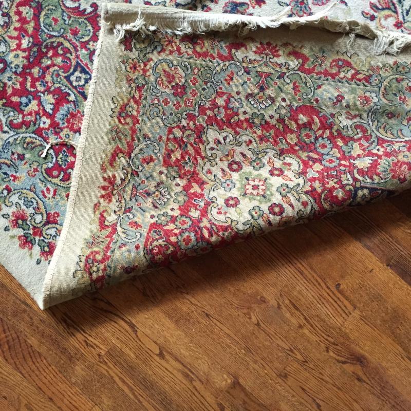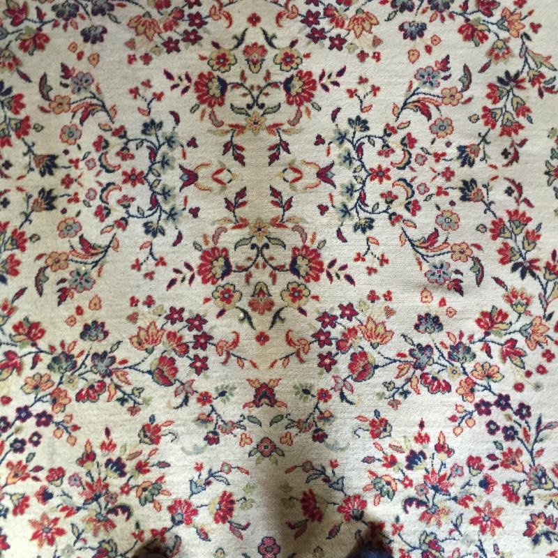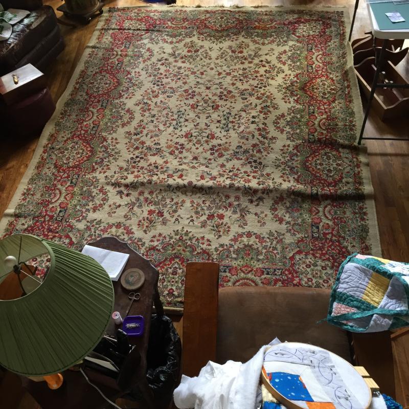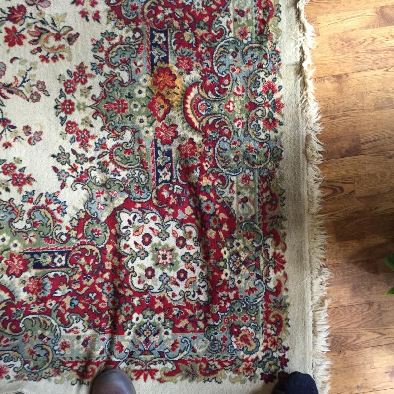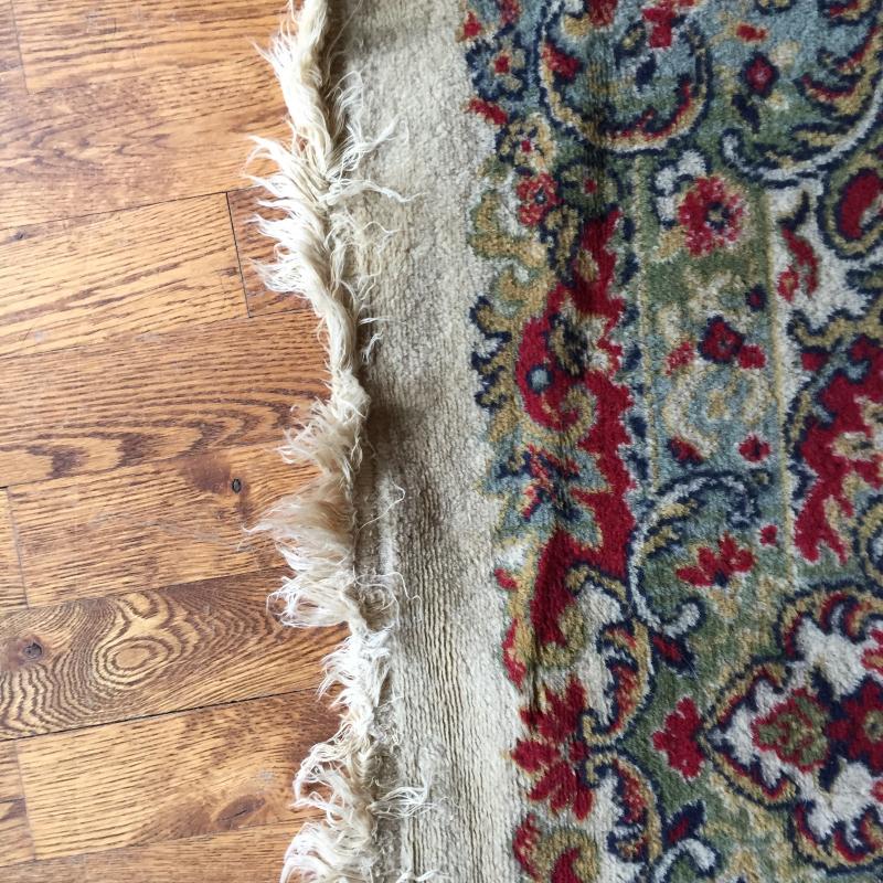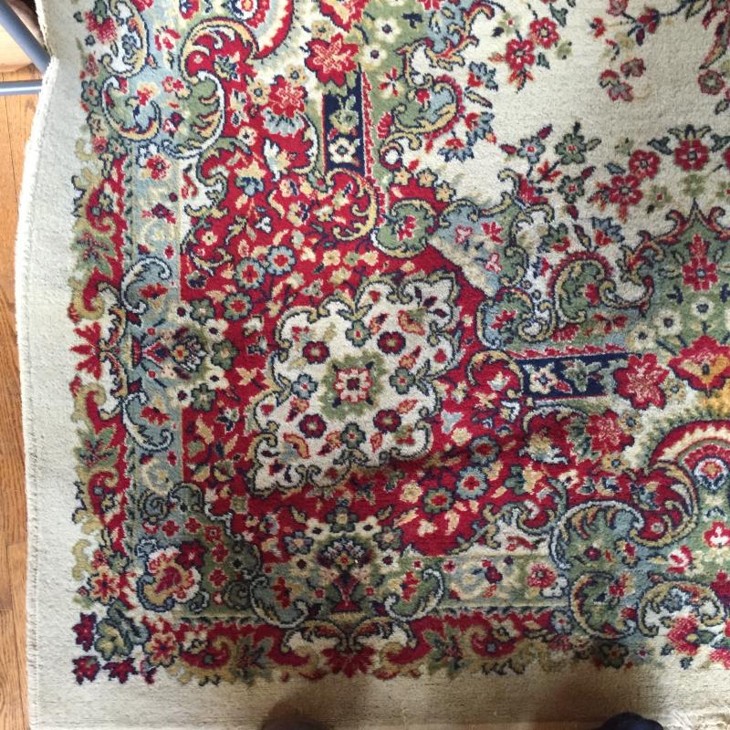 Woven rug has Normal wear and tear. Some Blemishes- See Pictures. From a Home With Pets and Measures 140” x 98 “ From Fringe. Predominate colors are red, tan, green and blue.