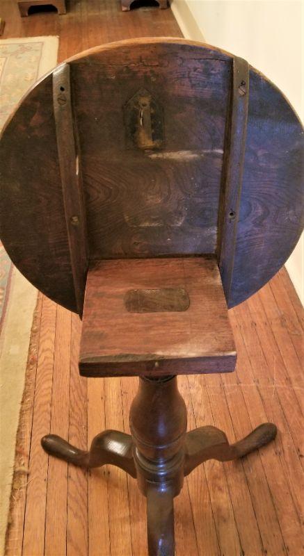 3-legged tilt top table - 19th century - in working condition. Oak. Measures 37.5" tall as pictured, 18" across. When set in table position, measures 26.5" tall. Some darkening to wood on table top. Antique condition.
