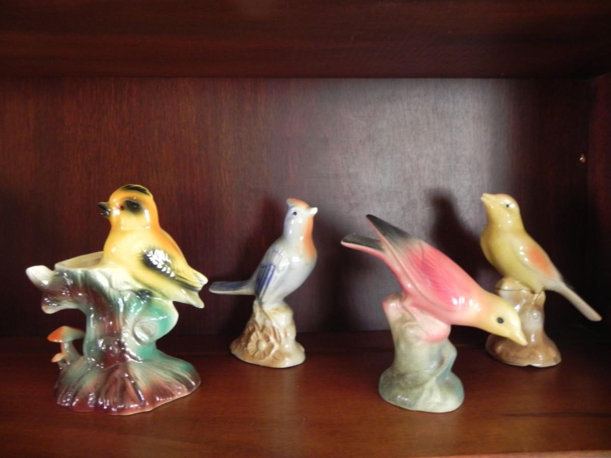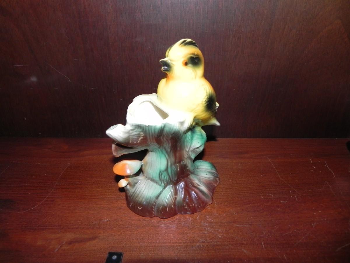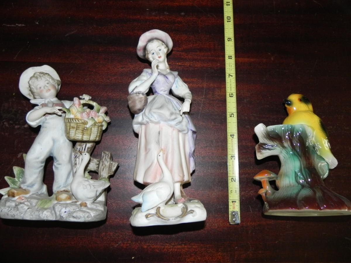 LADIES ARE MARKED "MATILDA" ON BOTTOM AND PORCELAIN KITTY WATCHING THE COLORFUL BIRDS ALL IN GOOD CONDITION