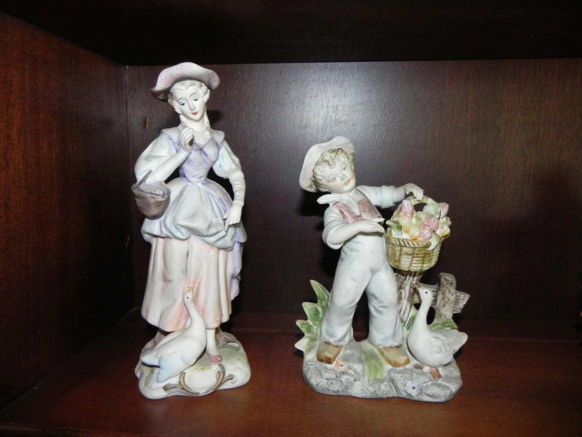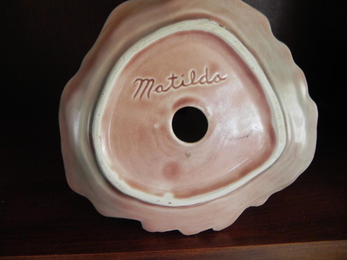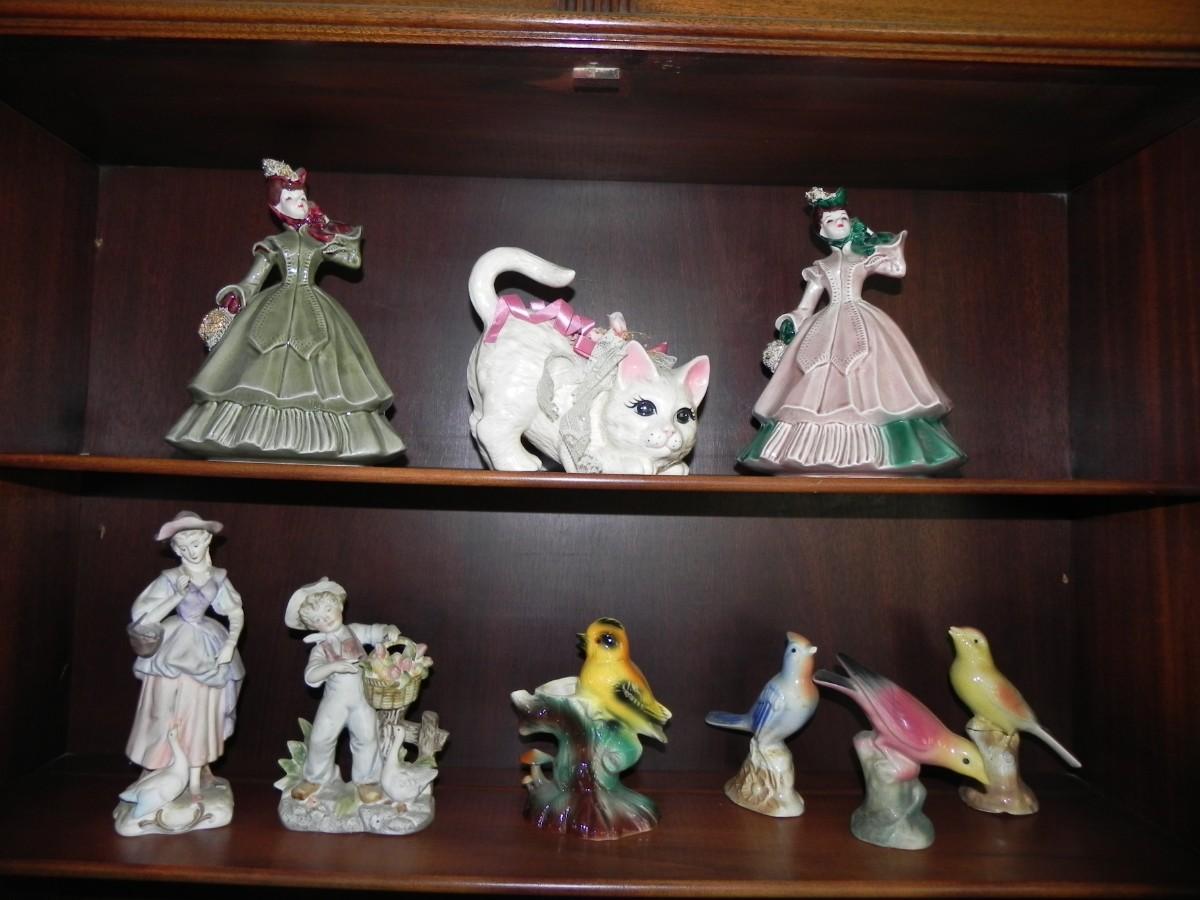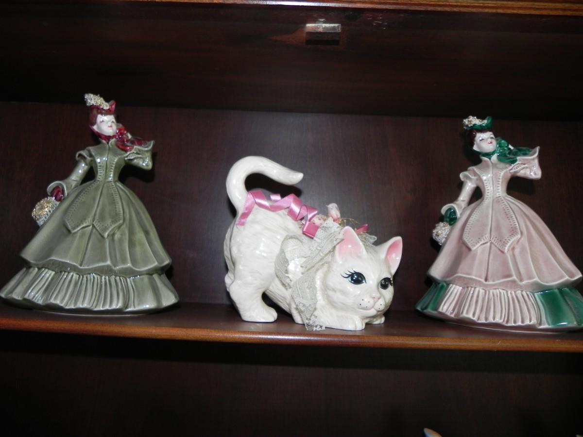 LADIES ARE MARKED "MATILDA" ON BOTTOM AND PORCELAIN KITTY WATCHING THE COLORFUL BIRDS ALL IN GOOD CONDITION