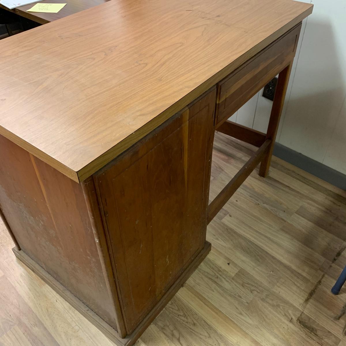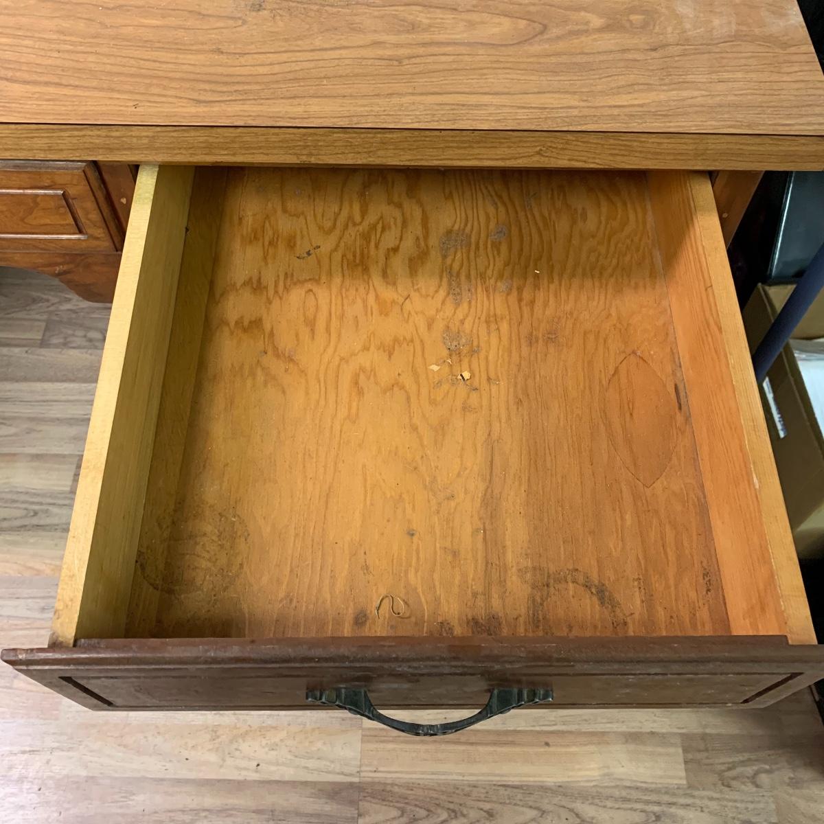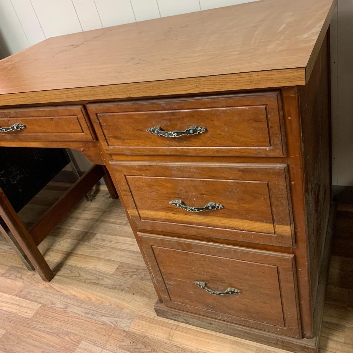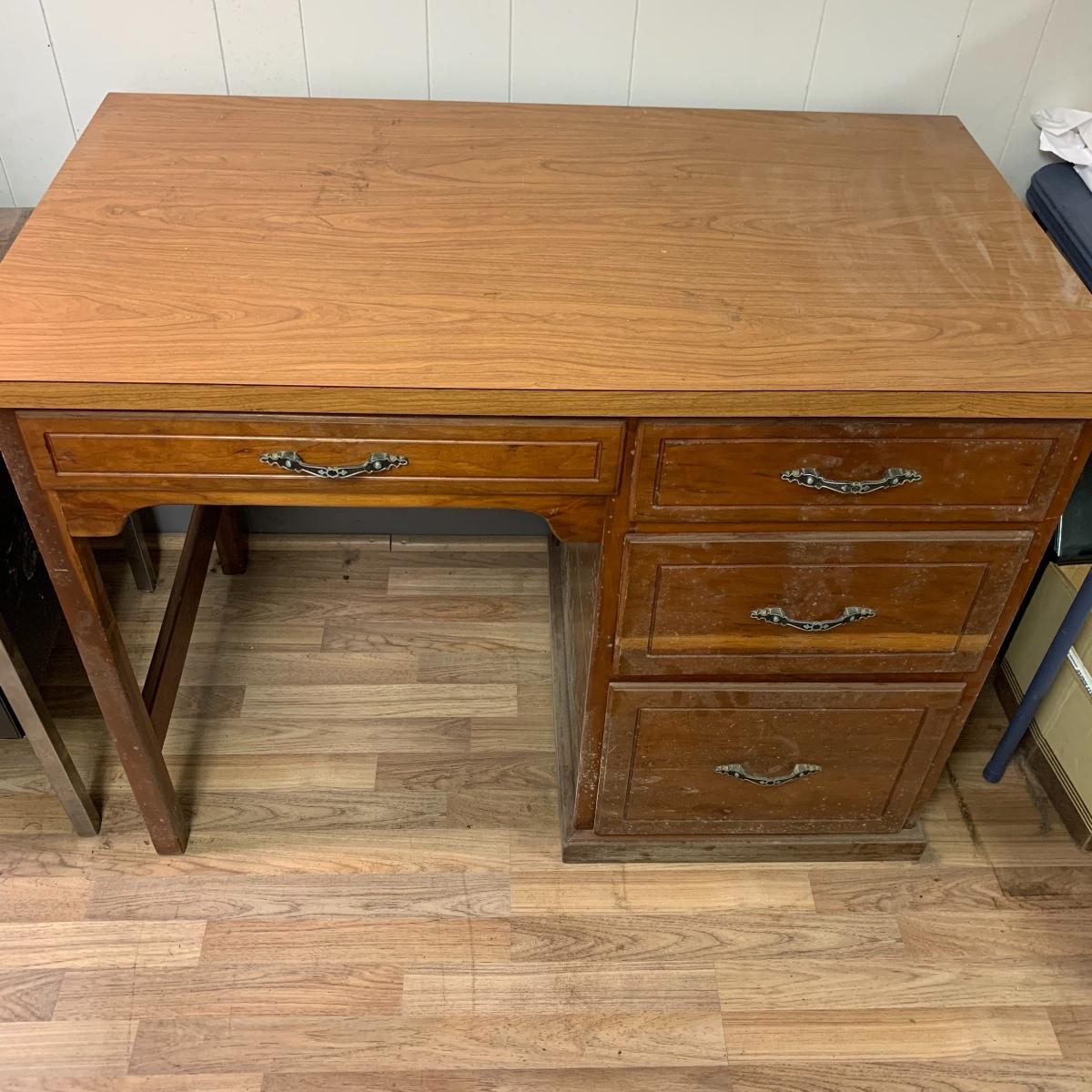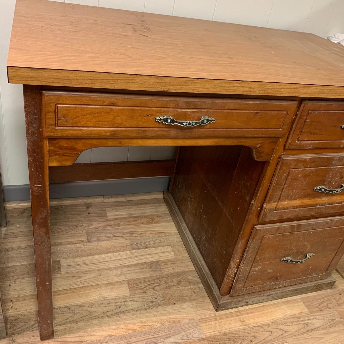 This is a nice small wooden desk with four drawers. It has accumulated some dust and would benefit from a good cleaning. Desk measures 42.5”x24”x31”. It appears an added top may give a little larger smooth surface. See photos for details. Local pickup only.