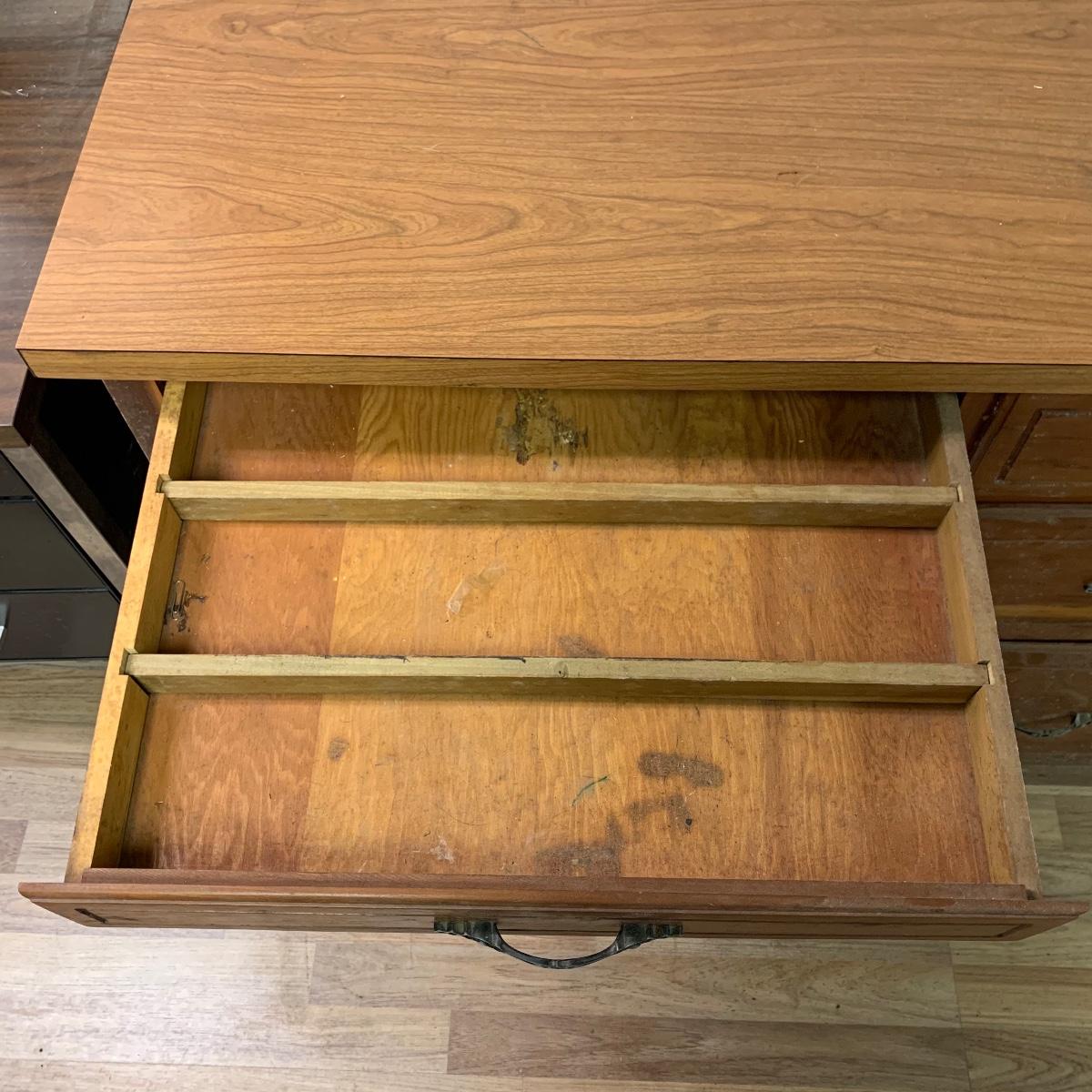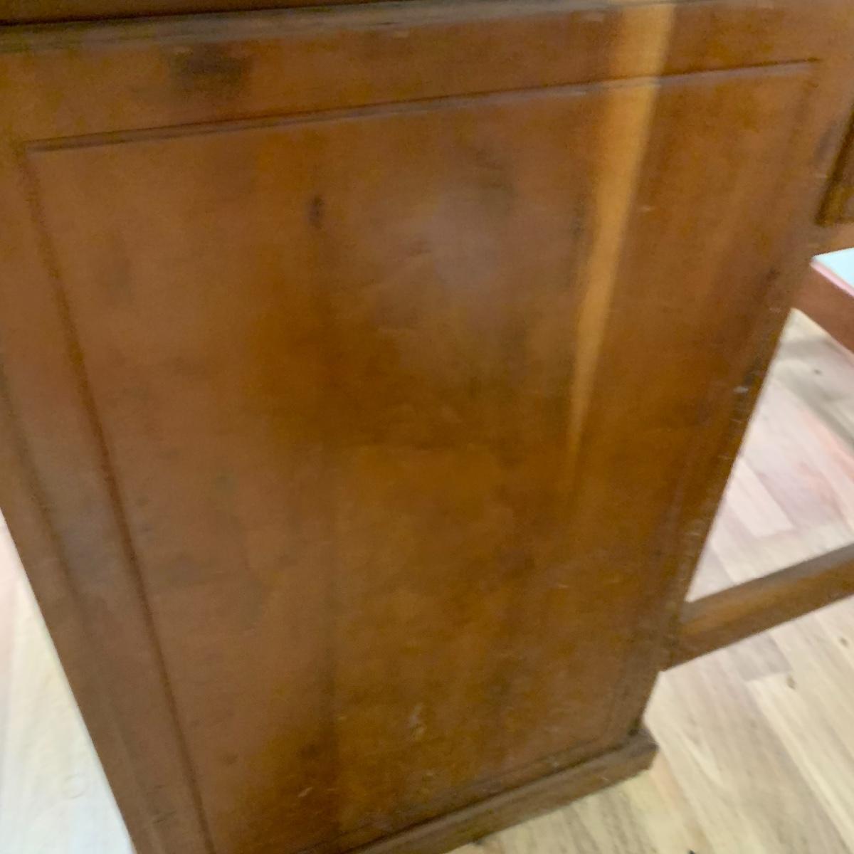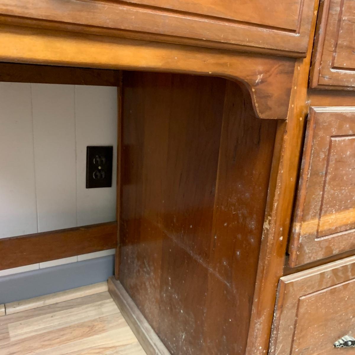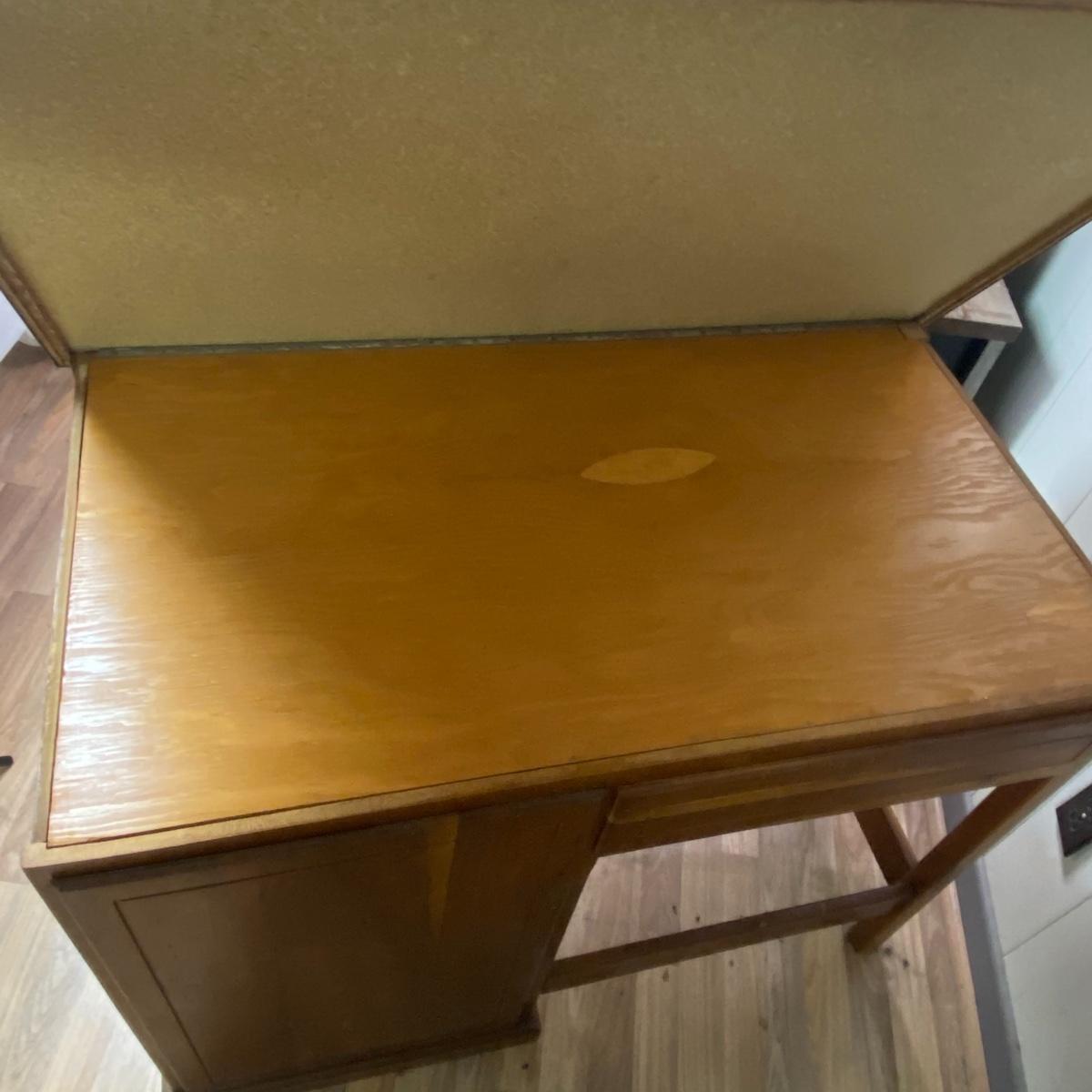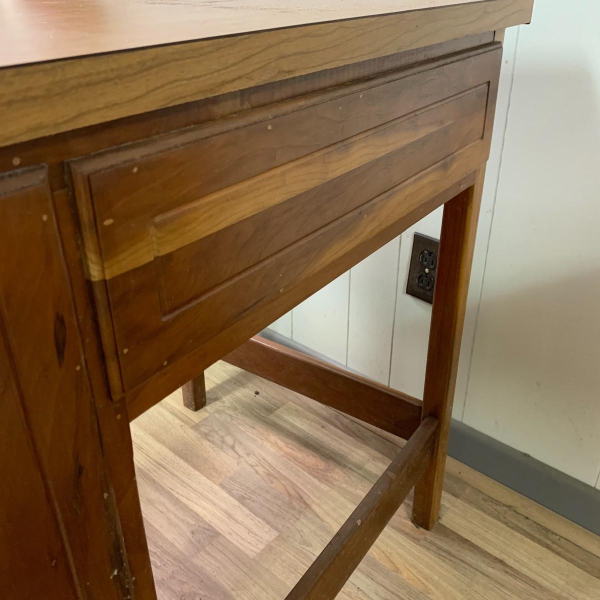 This is a nice small wooden desk with four drawers. It has accumulated some dust and would benefit from a good cleaning. Desk measures 42.5”x24”x31”. It appears an added top may give a little larger smooth surface. See photos for details. Local pickup only.