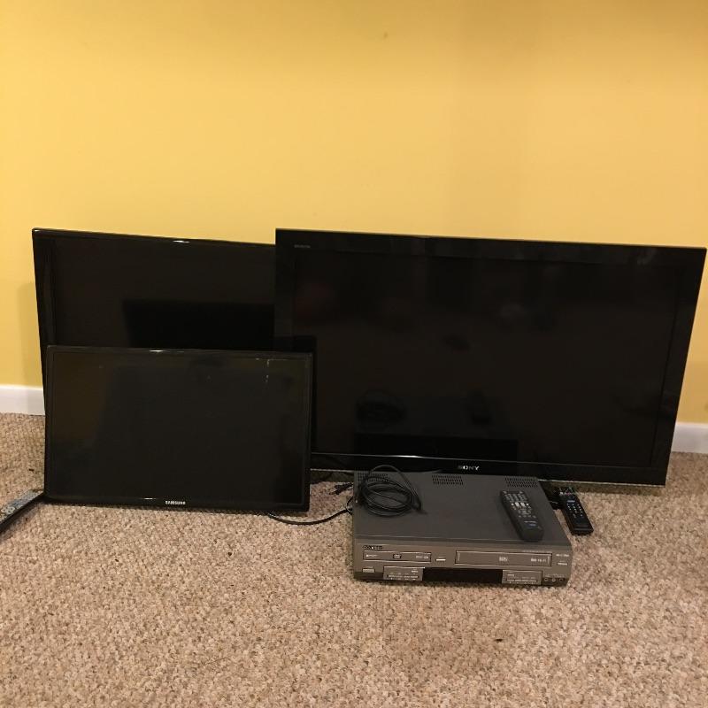 This lot is a great way to get your home setup with three TVs that include a Sony 40” model # KDLX40BX450 with remote, Haier 32” model # HL32RI, Samsung 26” model # UN26EH4000F with remote and a Go.Video model # DVR4400 combo DVD/VHS machine with remote. All items powered on when tested.