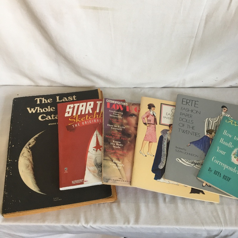 An eclectic selection of vintage magazines including The Last Whole Earth Catalog, Star Trek sketchbook, Cosmopolitan’s love guide and more.