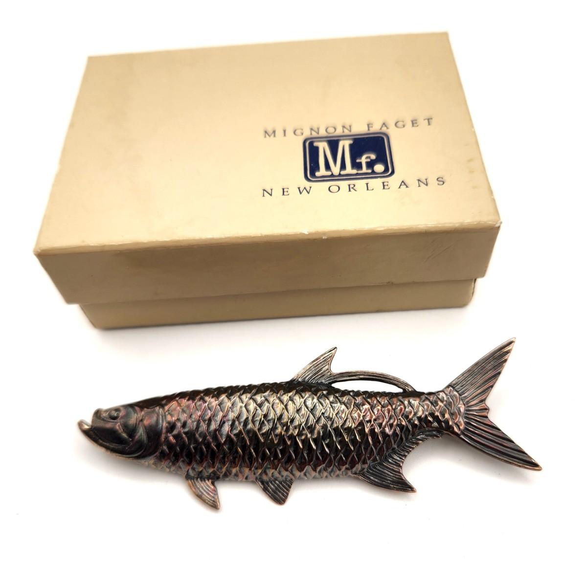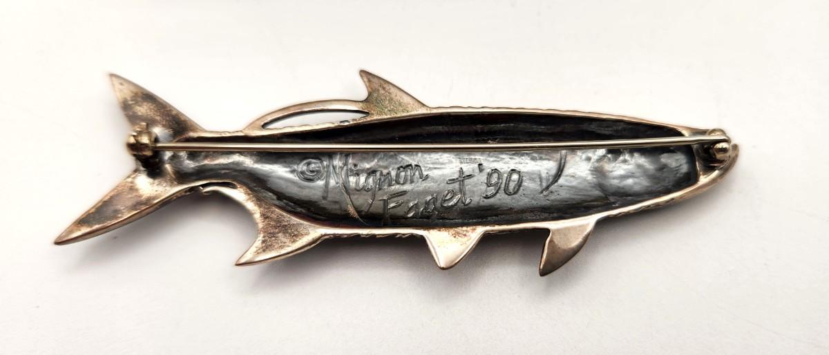 Signed and dated 1990 - love this piece! Comes in original box - Vintage Mignon Faget sterling silver brooch in the form of a fish (I believe it's supposed to be a GAR fish. .62 ounces of silver. Nicely detailed. About 3.25" long. A piece you don't see very often.