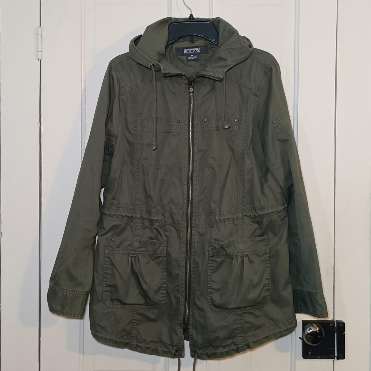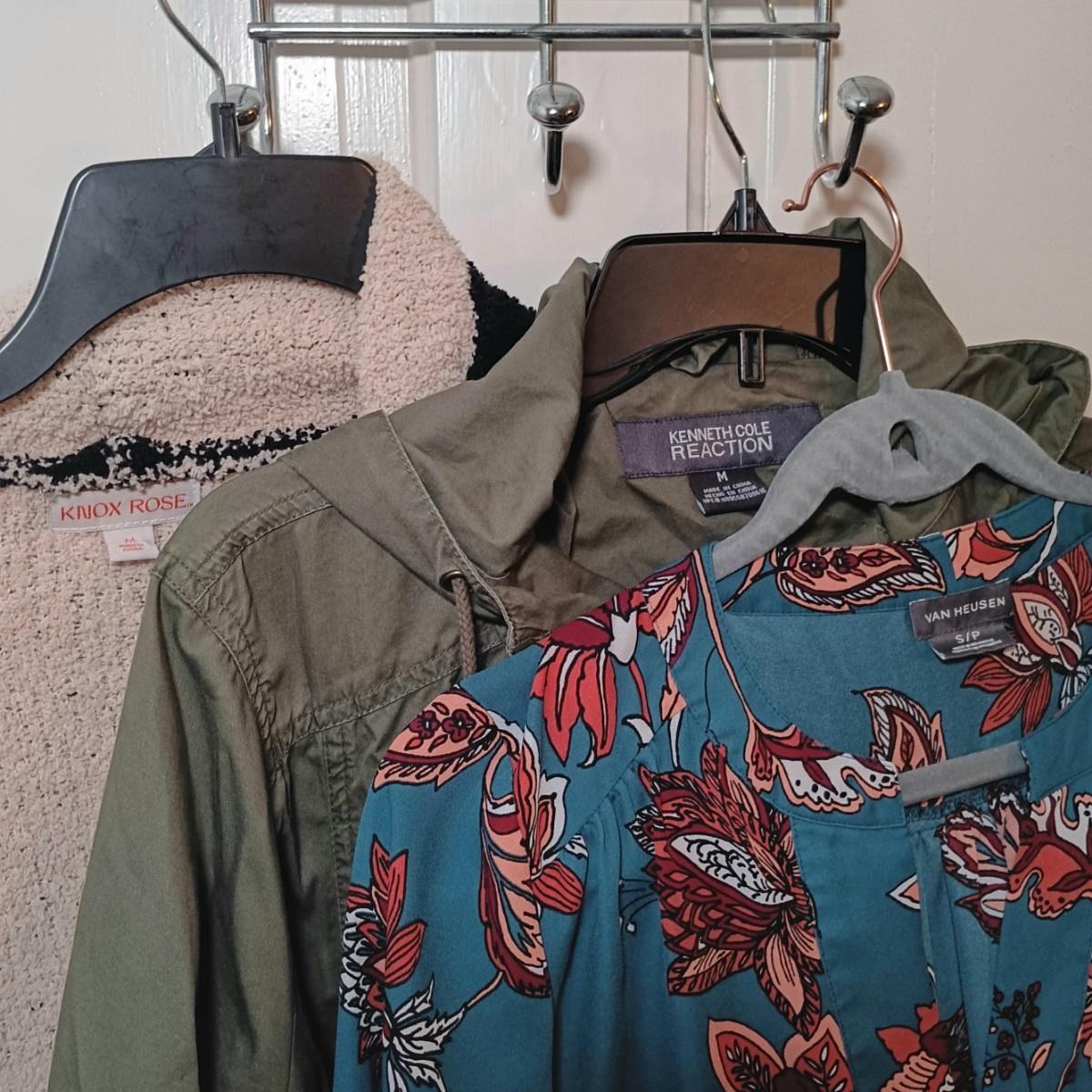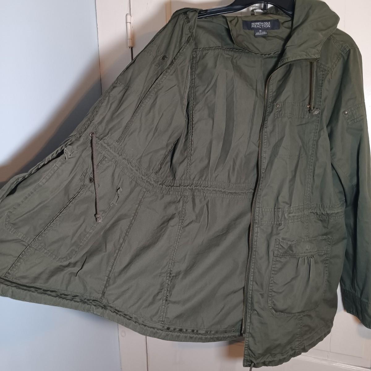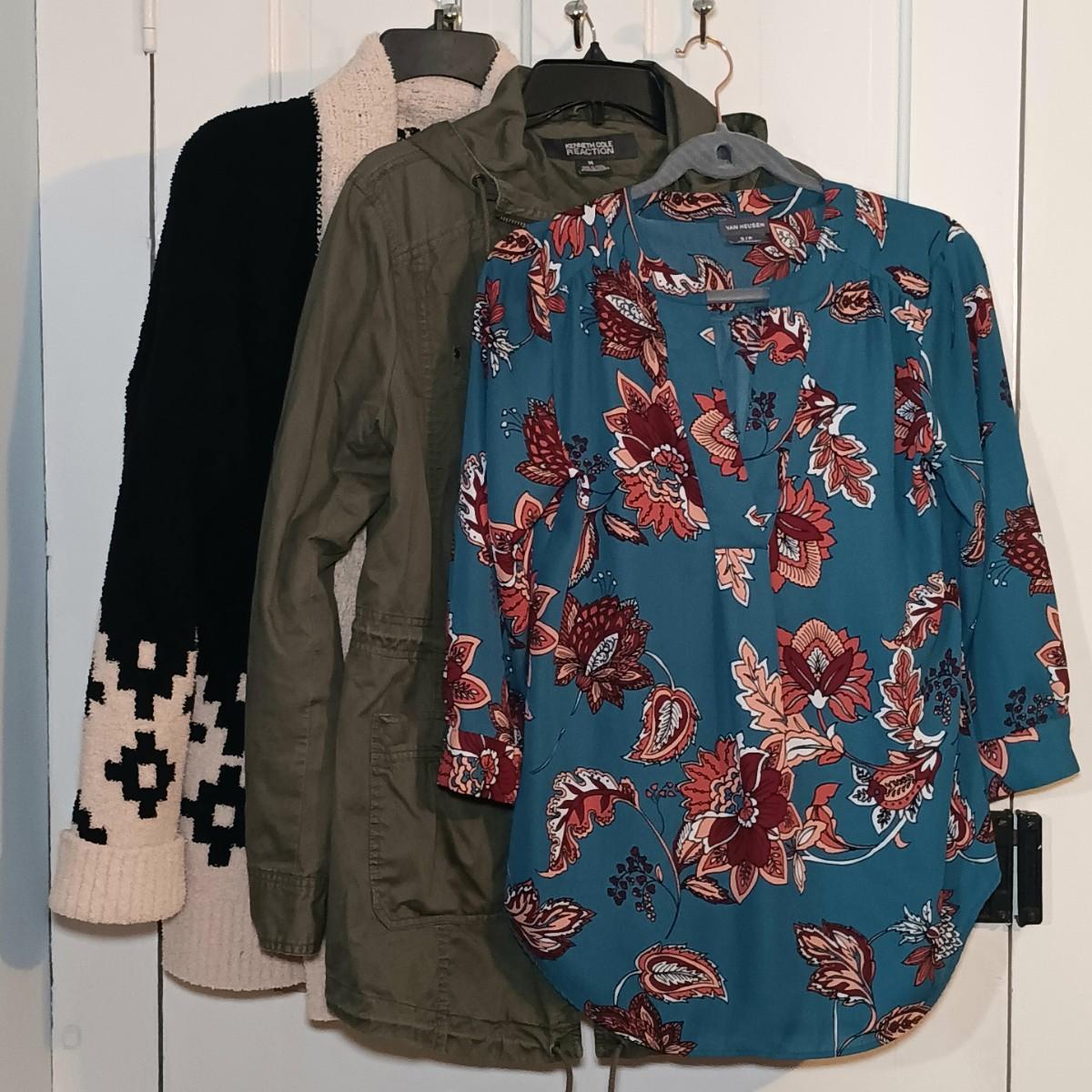 LOT 225: Kenneth Cole Reaction Army Green Jacket, Van Heusen Blouse & Knox Rose Open Front Sweater